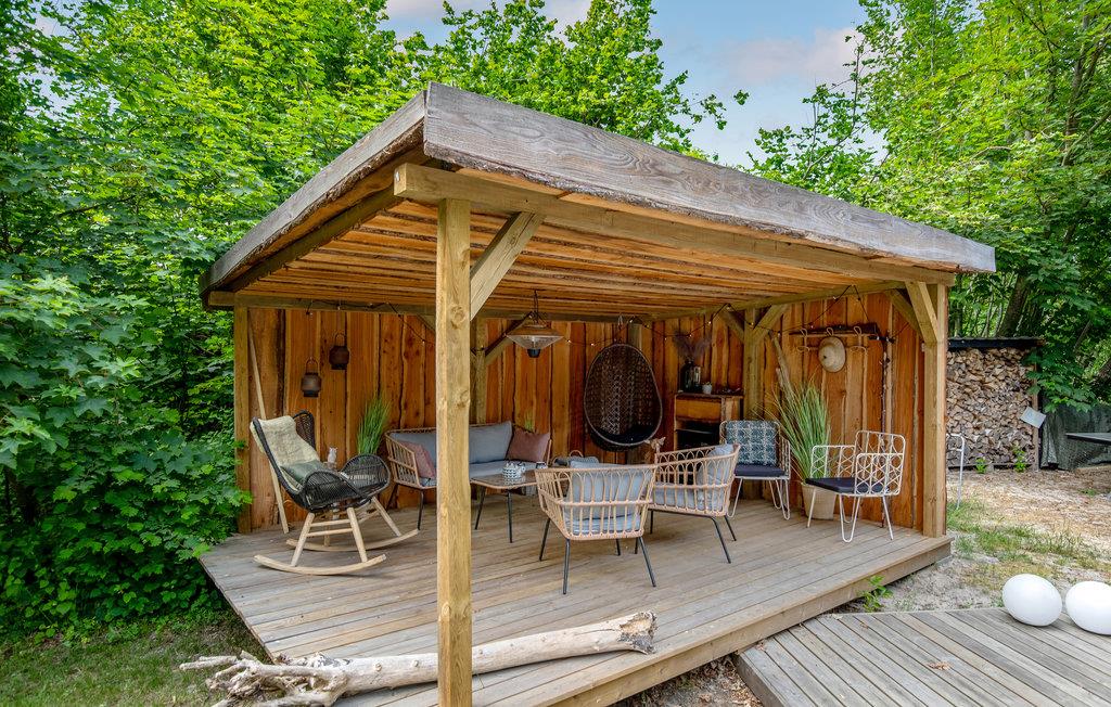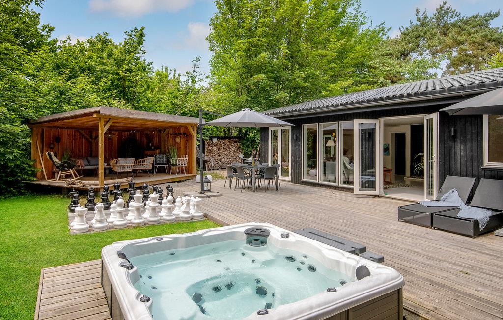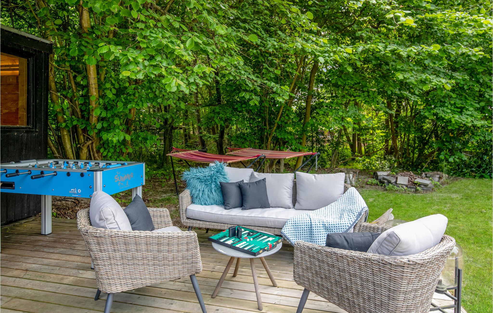 Huset ligger dejligt omkranset af træer. Terrassen er sydvendt, ugenert og solvenlig, og den er udstyret med havemøbler og liggestole. I kan også sidde under træets skygge og nyde loungemøblerne med en god bog. Der findes også udendørs stigegolf, bordbasket, haveskak, gynger, bordfodbold, bordtennis og dart - her er altså et væld af underholdningsmuligheder. Når mørket falder på, kan I nyde alle de små hyggelys, som er placeret rundt omkring. Her oplever man næsten sydlandsk stemning, og hvis I er stille, kan I høre havets brusen mellem træerne. På terrassen finder I også det flotte og velindrettede udekøkken, som har både vand og afløb, og der er også både en kul- og en gasgrill til rådighed, ligesom der er en pizzaovn, så I kan tilberede de helt store feriemåltider. I kan også slappe af i hængekøjerne og det skønne shelter, der fungerer som alletiders overdækkede hyggelige terrasse med dejlige møbler.