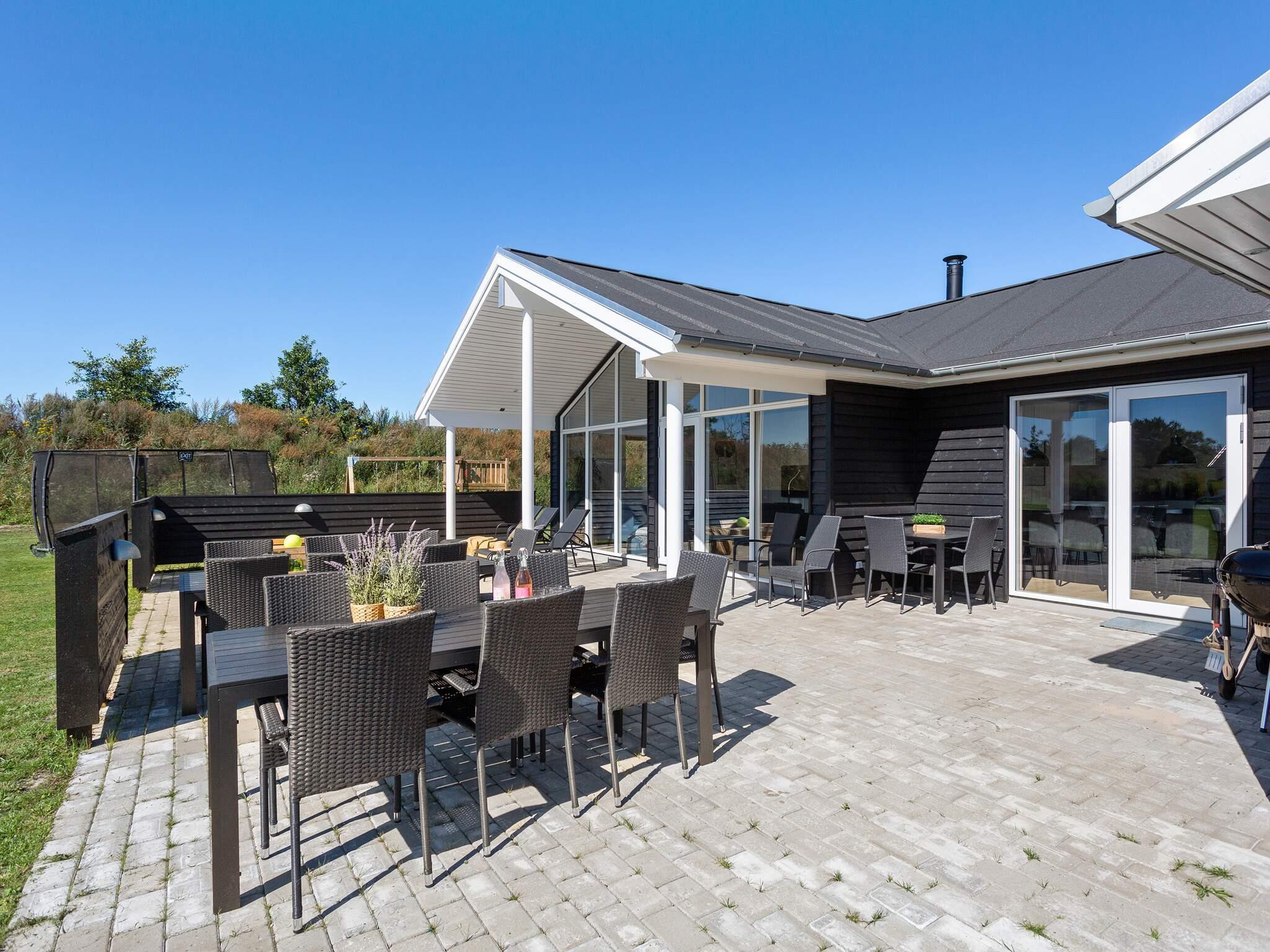 Den delvist overdækkede terrasse giver rig mulighed for at nyde den danske sol. Der er havemøbler og grill, så I kan få en grillaften. Der er også en gynge, trampolin og legetårn til børnene.