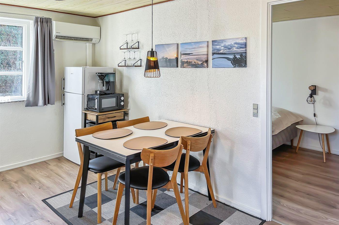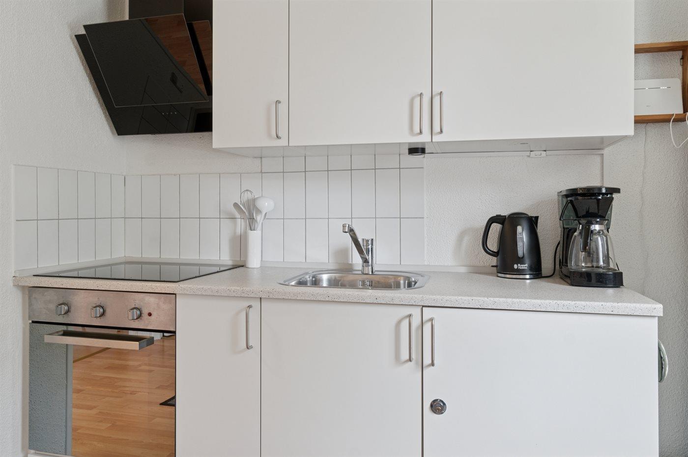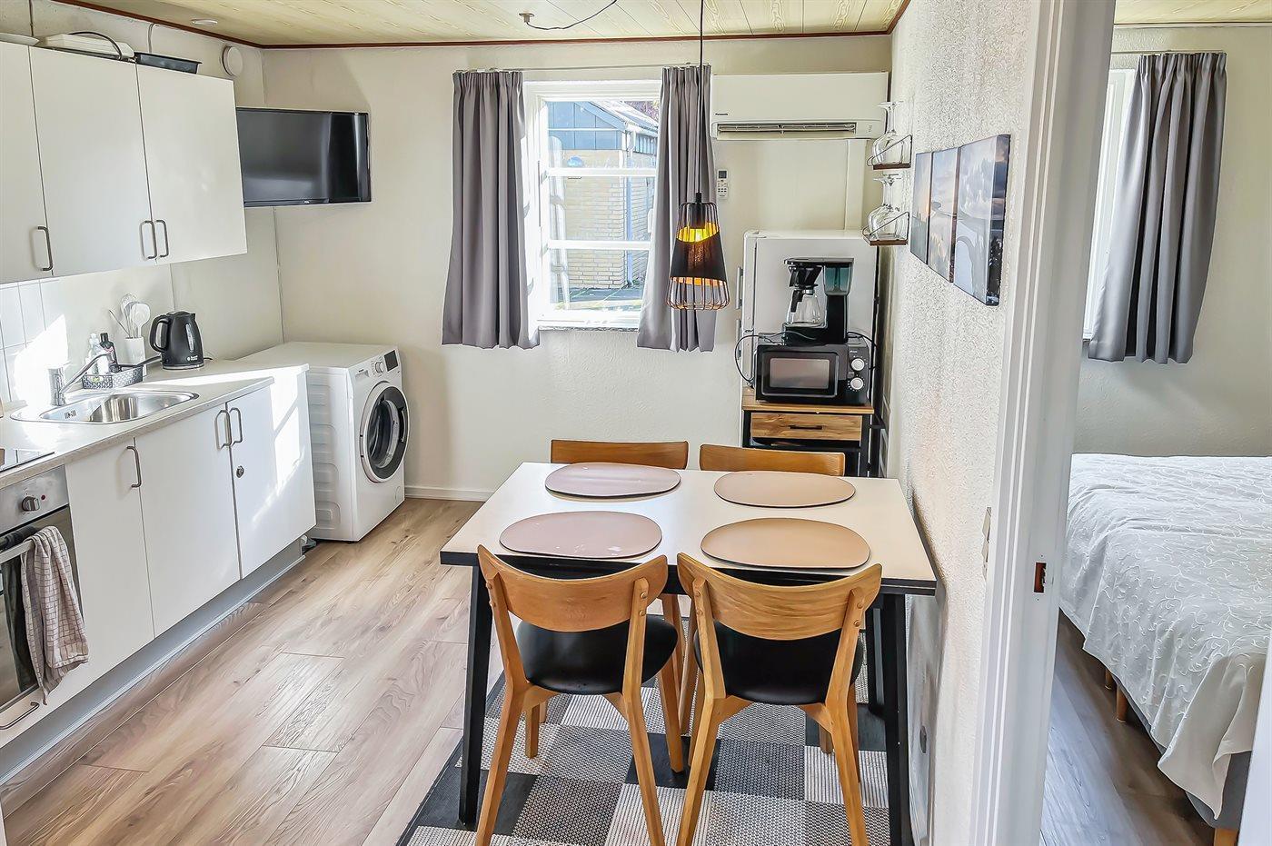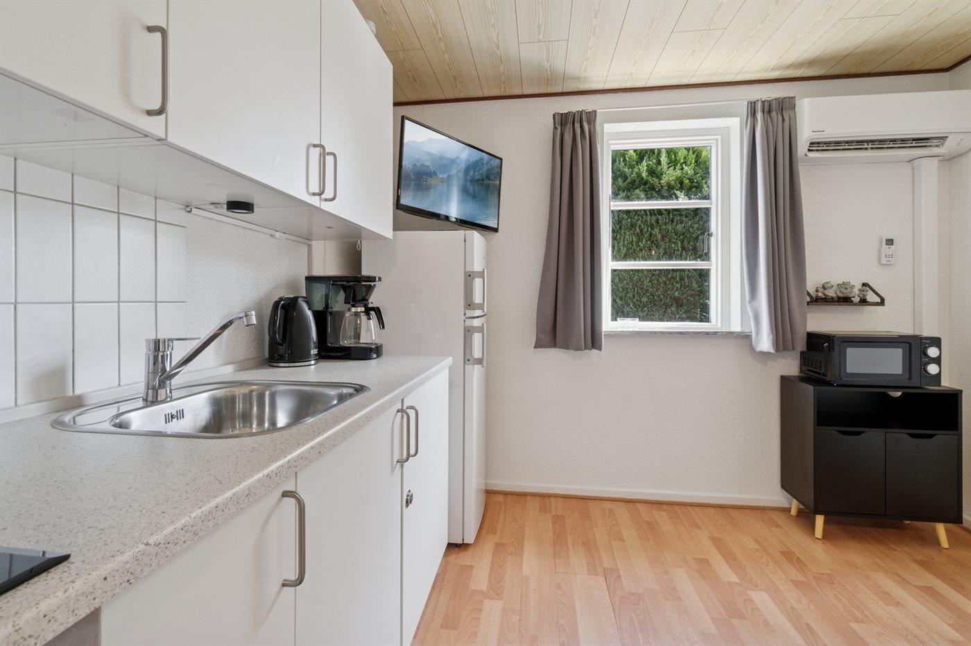Køkkenet er udstyret med 1 køleskab. Der er 4 keramiske kogeplader, varmluftovn, mikrobølgeovn.