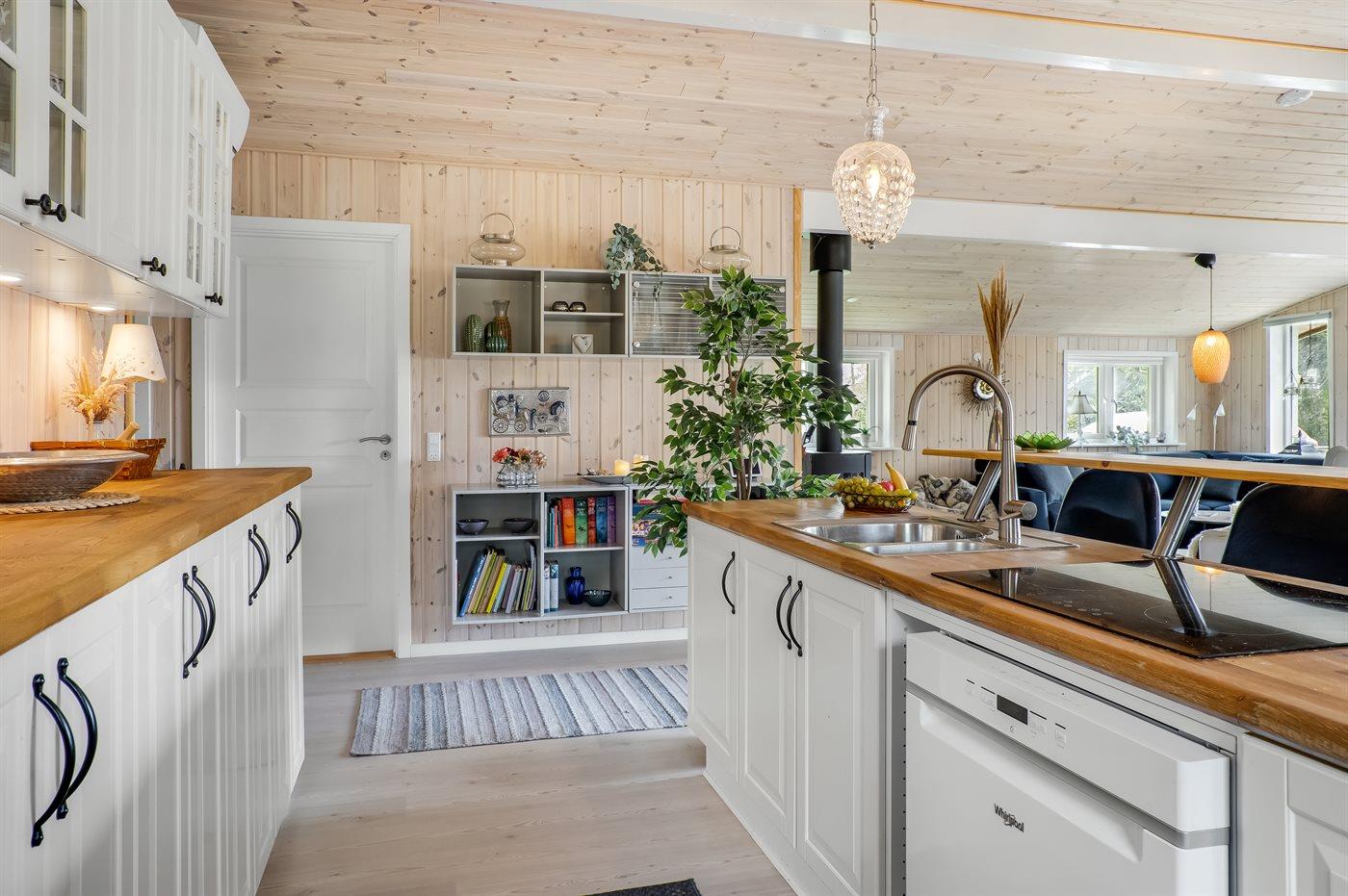 Køkkenet er udstyret med 1 amerikansk køleskab. Der er 4 keramiske kogeplader, varmluftovn samt opvaskemaskine.