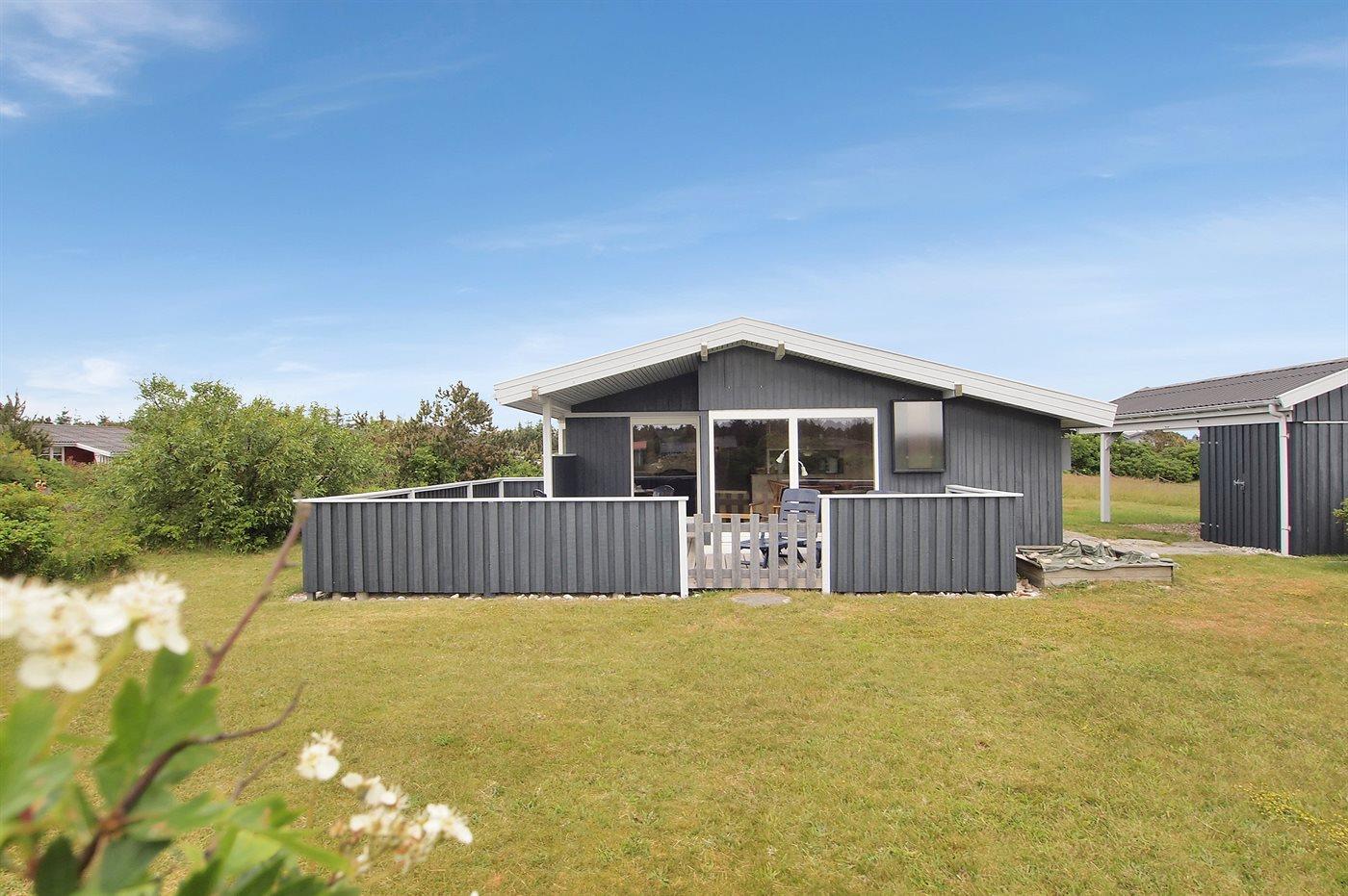 Ferieboligen er beliggende på en 1237 m² stor naturgrund. Der er 1100 m til havet. Der er 800 m til fjorden. Nærmeste forretning er beliggende i en afstand af 300 m. Til ferieboligen hører 25 m² terrasseareal. Desuden er der 10 m² overdækket terrasse. Gynge. Sandkasse. Der er carport til rådighed. Parkering ved ferieboligen.