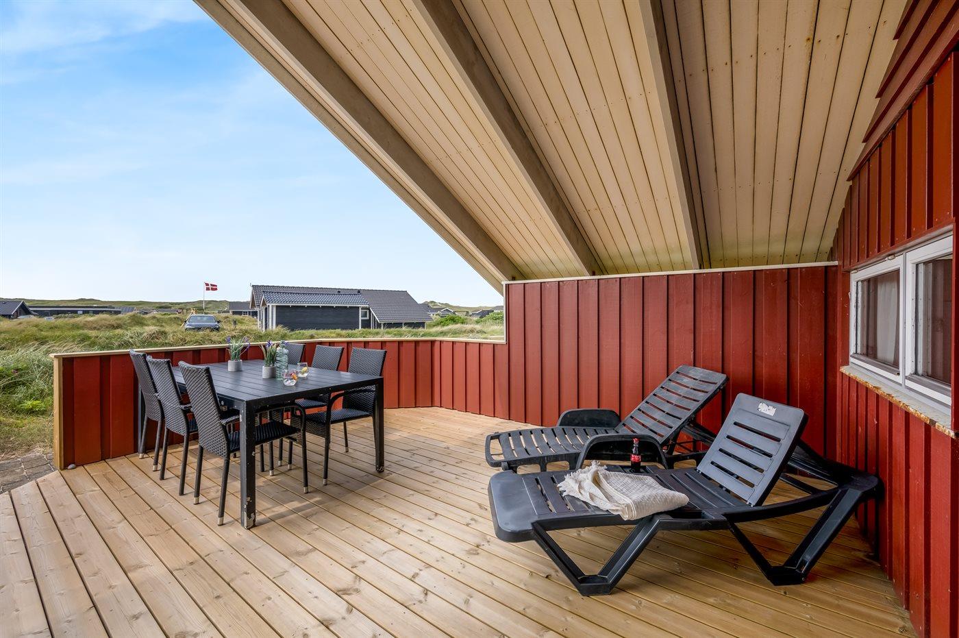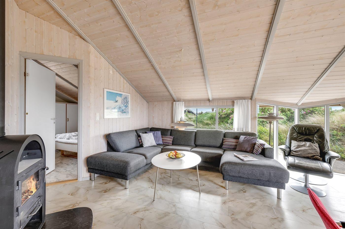 Gennem de store glaspartier kommer i direkte ud på den lækre træterrasse, hvor I kan nyde klitlandskabet og den friske luft, mens børn eller hund leger på grunden.