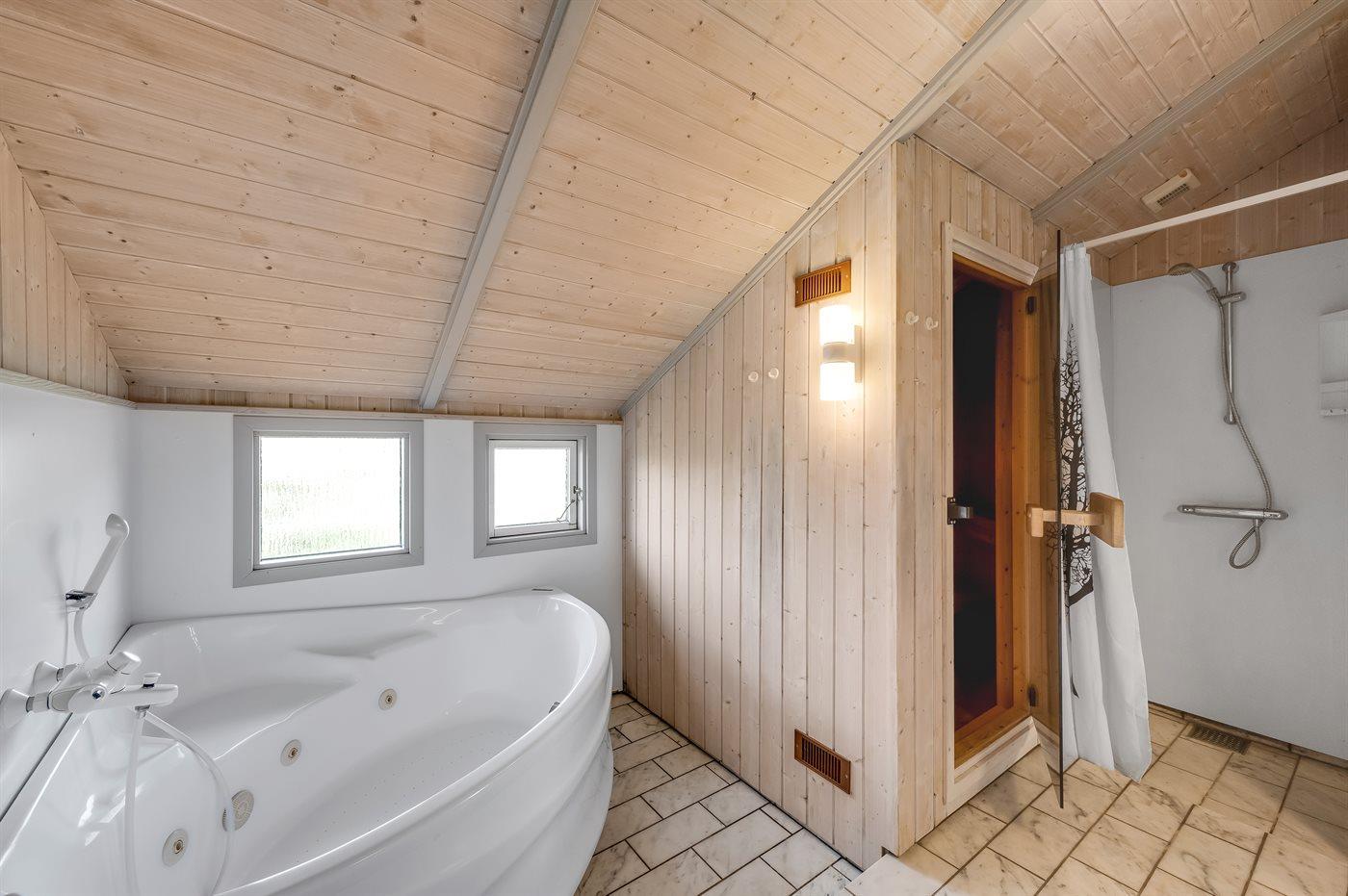Der er 1 badeværelse med bruser og 2 toiletter, heraf 1 gæstetoilet. Der er gulvvarme på 1 badeværelse. I saunaen er der mulighed for afslapning.
