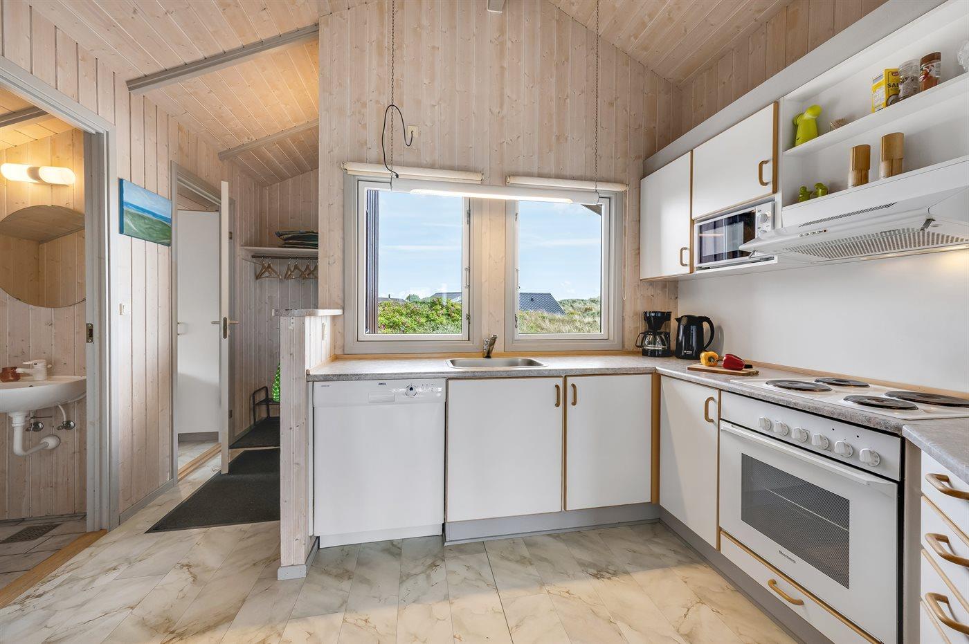 Køkkenet er udstyret med 1 køleskab. Der er 4 elkogeplader, bageovn, mikrobølgeovn samt opvaskemaskine.