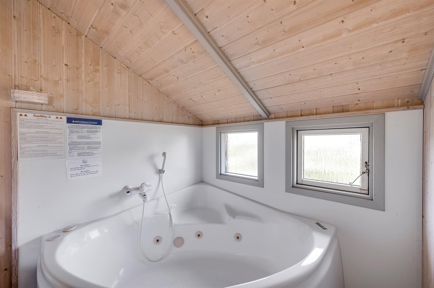 I sommerhusets store, lyse og indbydende køkken-alrum kan i hjælpe hinanden med madlavningen i det velassorterede køkken, mens I hygger i hinandens selskab og taler om løst og fast. Sommerhuset har højt til loftet, og det er designet med store glaspartier, hvilket giver en fantastisk rumfornemmelse og masser af lys. Den store sofa indbyder til afslapning med en bog eller med en go’ film, mens brændeovnen knitrer i baggrunden, eller i kan bare sidde og slappe af og nyde den smukke udsigt over klitlandskabet. Vil I rigtigt skrue op for afslapningen, så kan en tur i sommerhusets spa eller sauna varmt anbefales – når I sidder i spaens varme vand med en kold drink, så kan I mærke, at hverdagens stress og jag bliver vasket af kroppen – der er ren velvære?? Sommerhuset er desuden udstyret med to toiletter, hvilket gør det ekstra attraktivt, hvis I er to familier, der vil på ferie sammen.