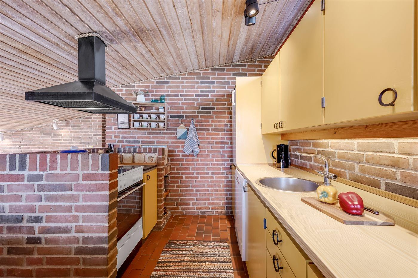 Køkkenet er udstyret med 1 køleskab. Der er 4 keramiske kogeplader, varmluftovn, mikrobølgeovn samt opvaskemaskine.