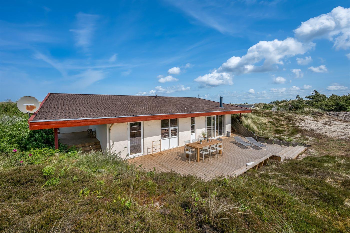 Arkitekttegnet sommerhus i Bjerregård nær Vesterhavet med stor terrasse og smuk naturgrund.