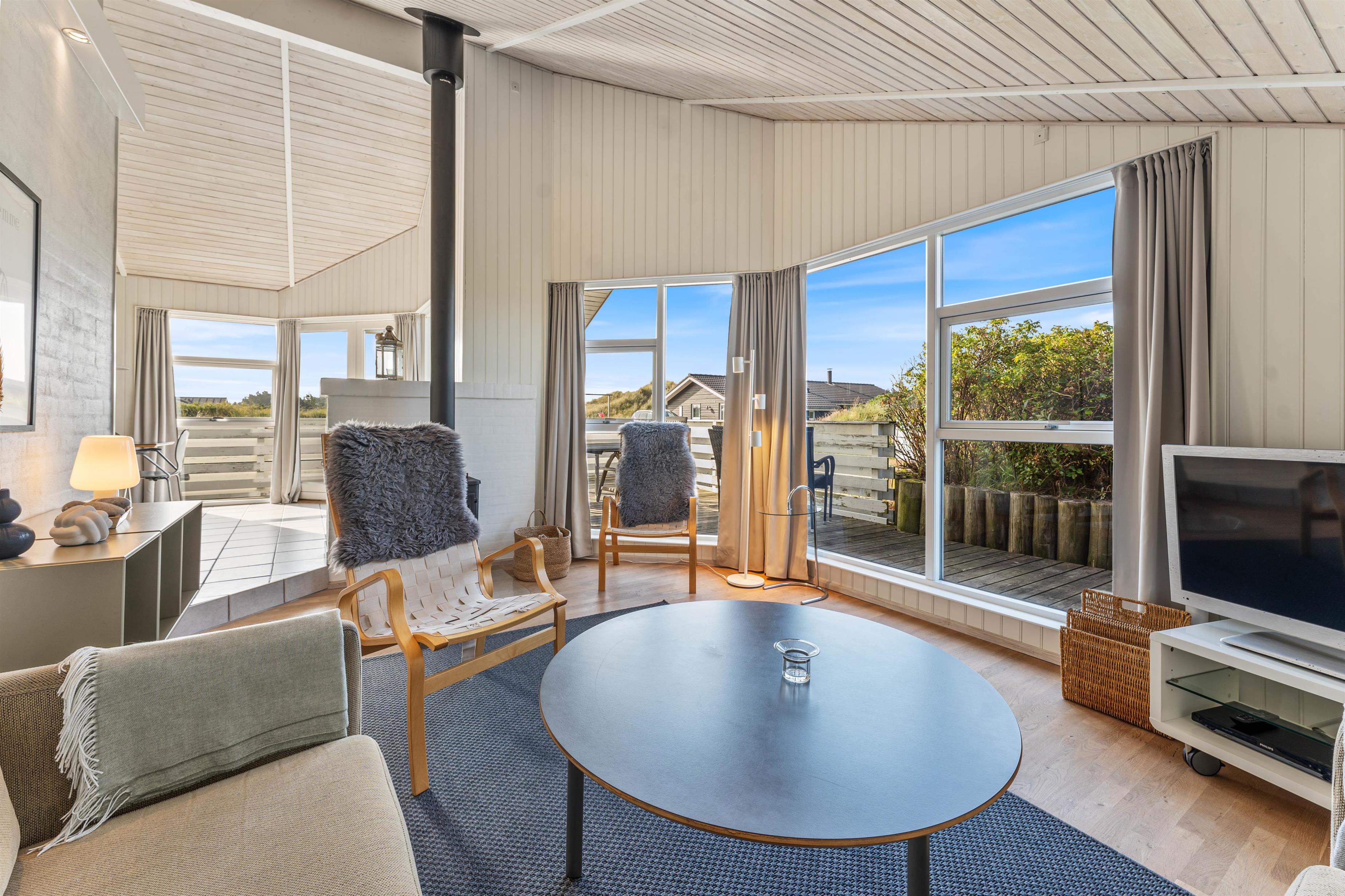 Sommerhuset byder jer velkommen med en smagfuld indretning, hvor lyse farver og store vinduespartier sikrer et pragtfuldt lysindfald i de fine rum. Her mærker I straks den afslappende feriestemning, som huset indbyder til.