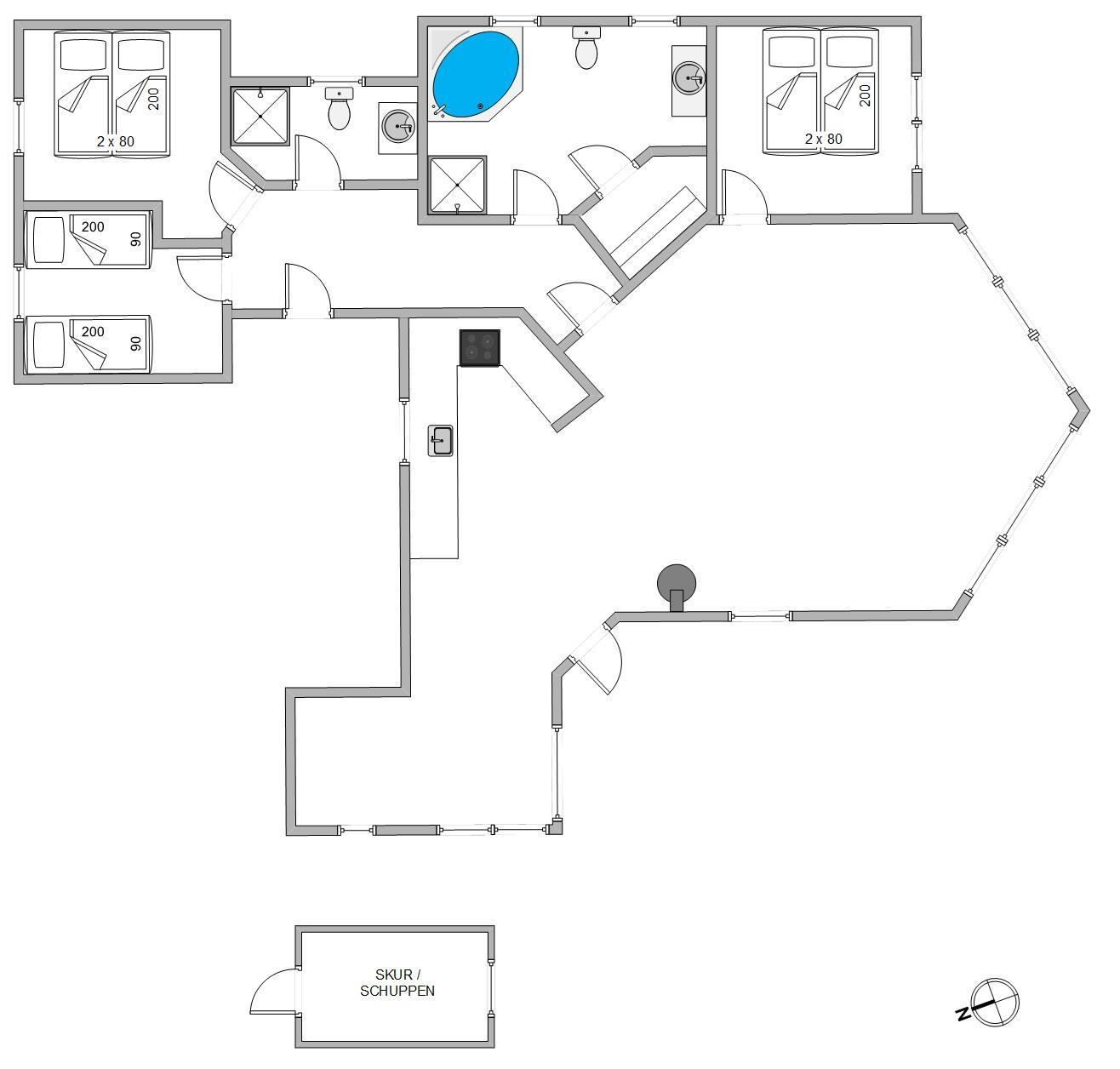 I dette dejlige sommerhus er der plads til i alt 8 personer. Her er 3 gode soveværelser med boksmadrasser og en hyggelig lille alkove med plads til 2 børn. Sommerhuset har desuden to fine badeværelser med gulvvarme og brus, – i det ene får du også et luksuriøst boblebad og sauna med plads til 2-3 personer.