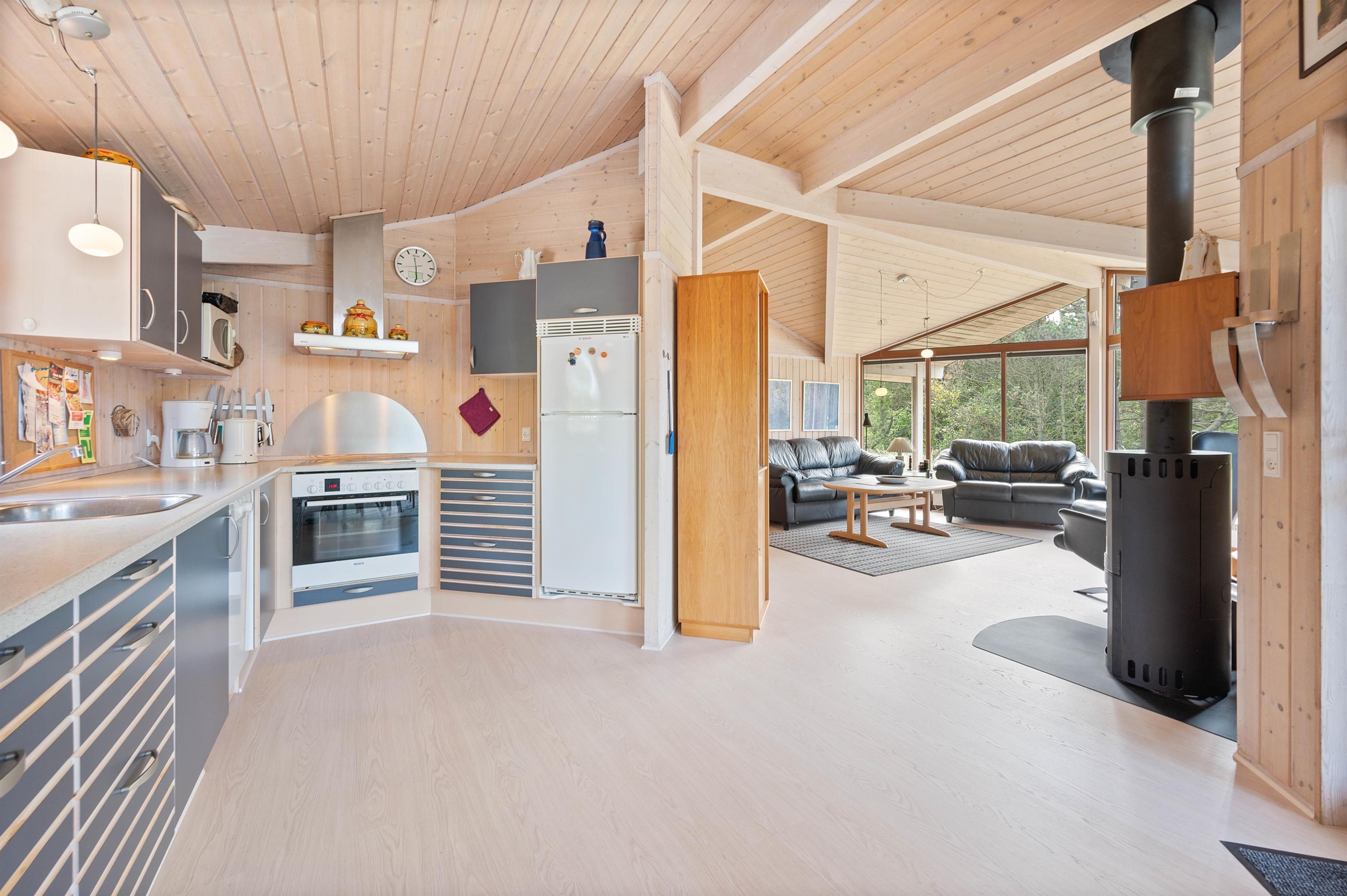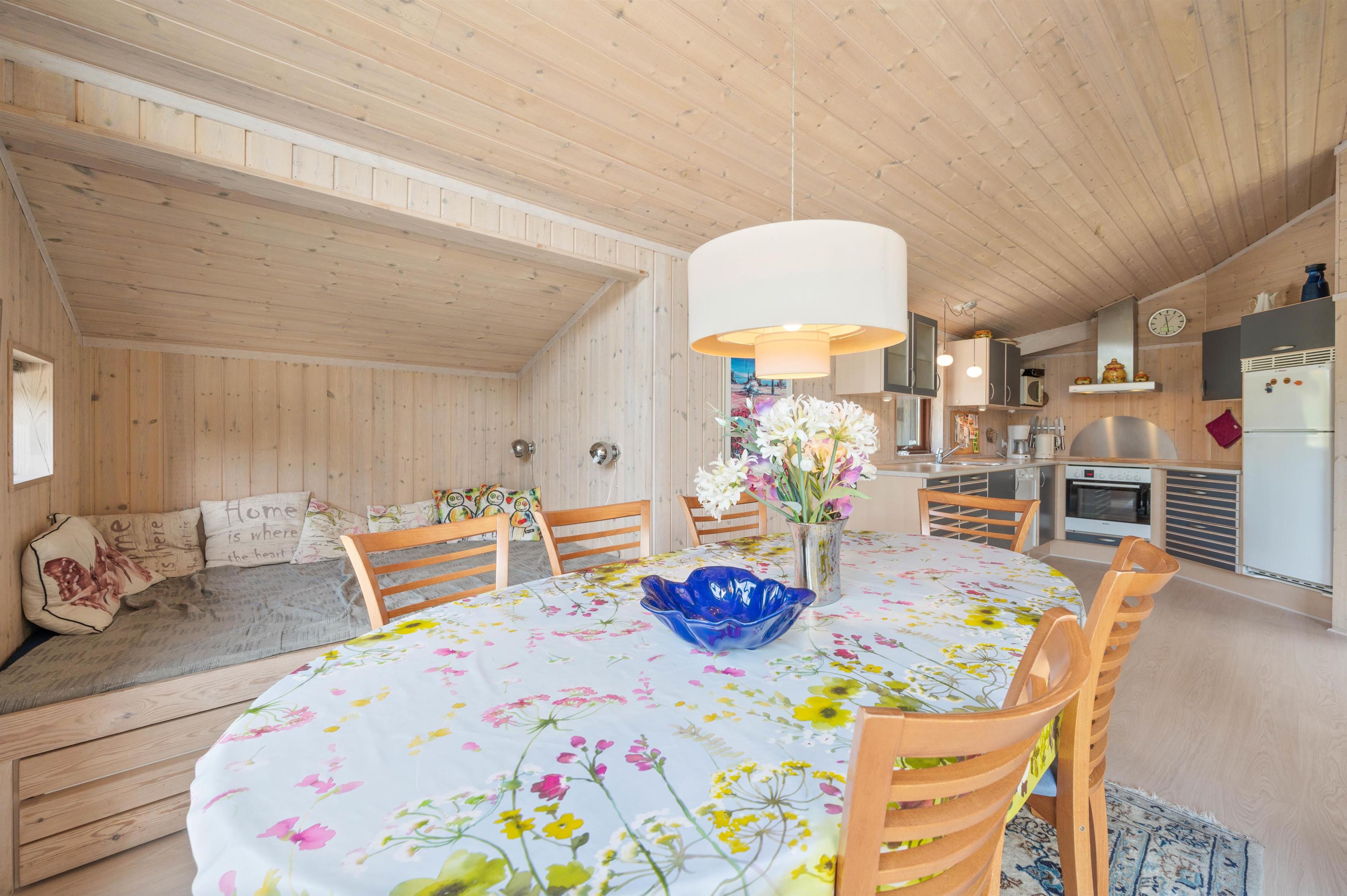 Her er en virkelig hyggelig stue med gode møbler og som er rigtig hyggeligt indrettet. Stuen står i åben forbindelse med det rummelige køkken, som blandt andet er udstyret med opvaskemaskine og mikroovn. Fra opholdsrummet er der udgang til den overdækkede terrasse, som er udstyret med havemøbler, liggestole og grill.