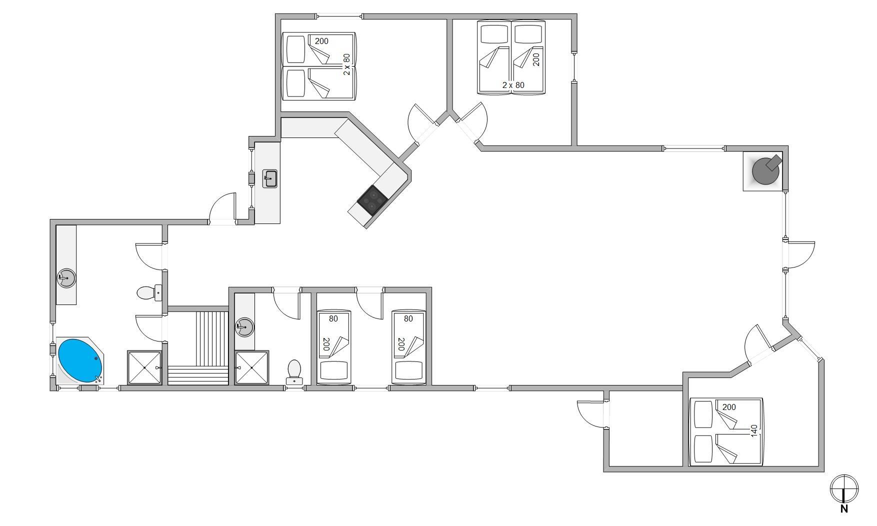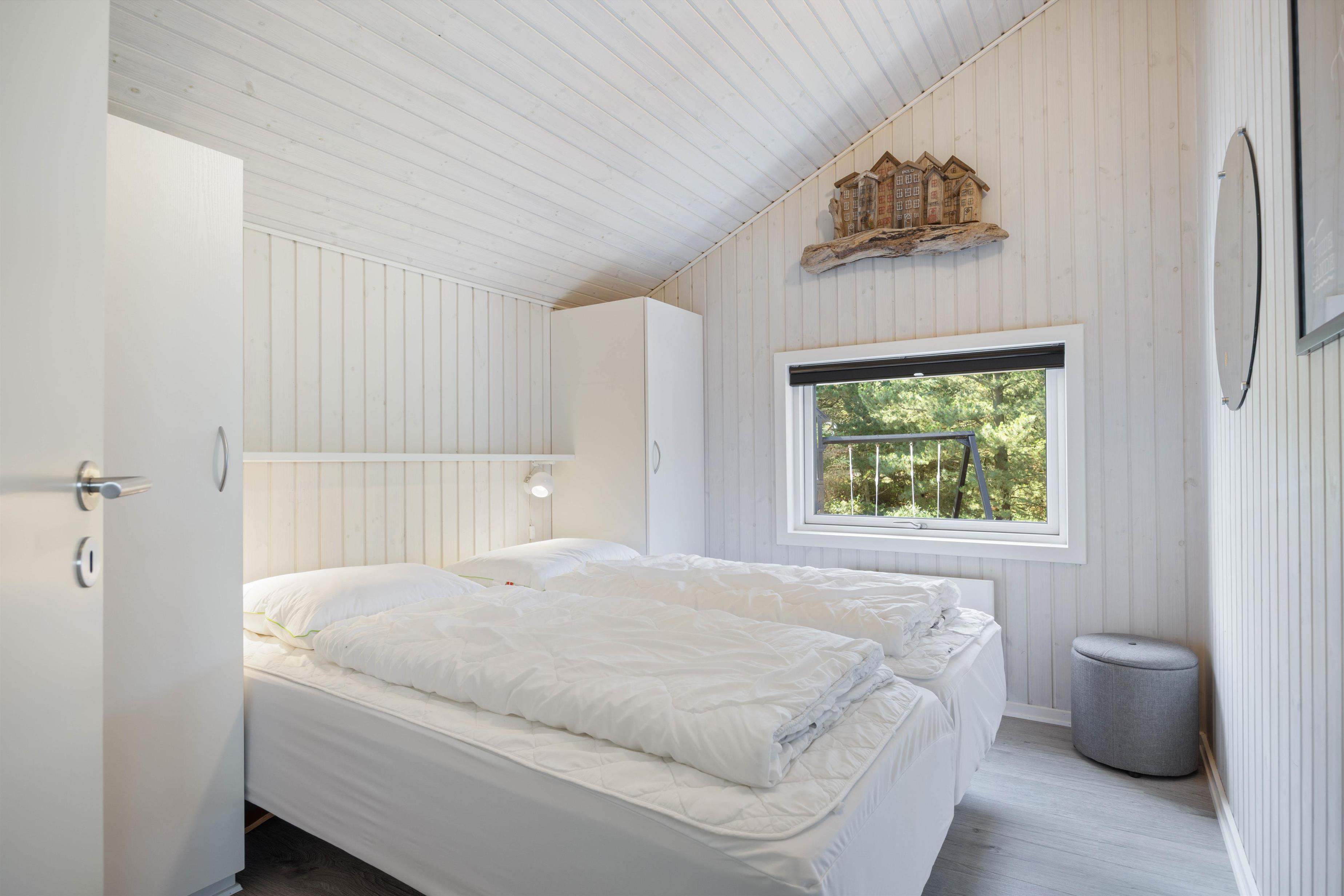 De 4 fine og lyse soverum med komfortable boxmadrasser har plads til 8 personer. Der er i alt 6 enkeltsenge samt 1 seng på 140 cm. I et af skabene findes en lille pengeboks, så I kan låse værdigenstande inde. Til den helt rigtige ferieafstressning er den gode wellness-afdeling med 2-personers spa og rummlig sauna det optimale.