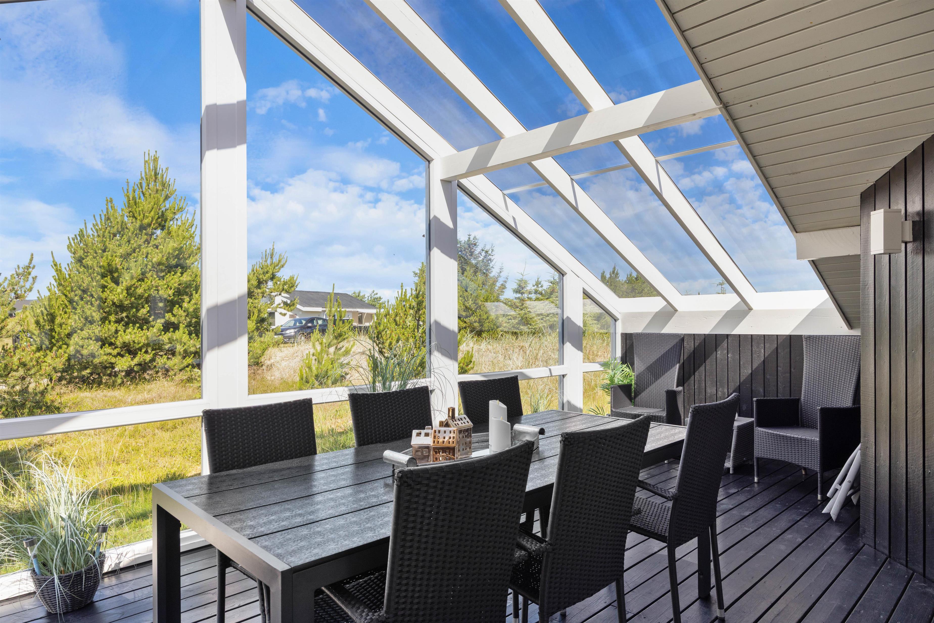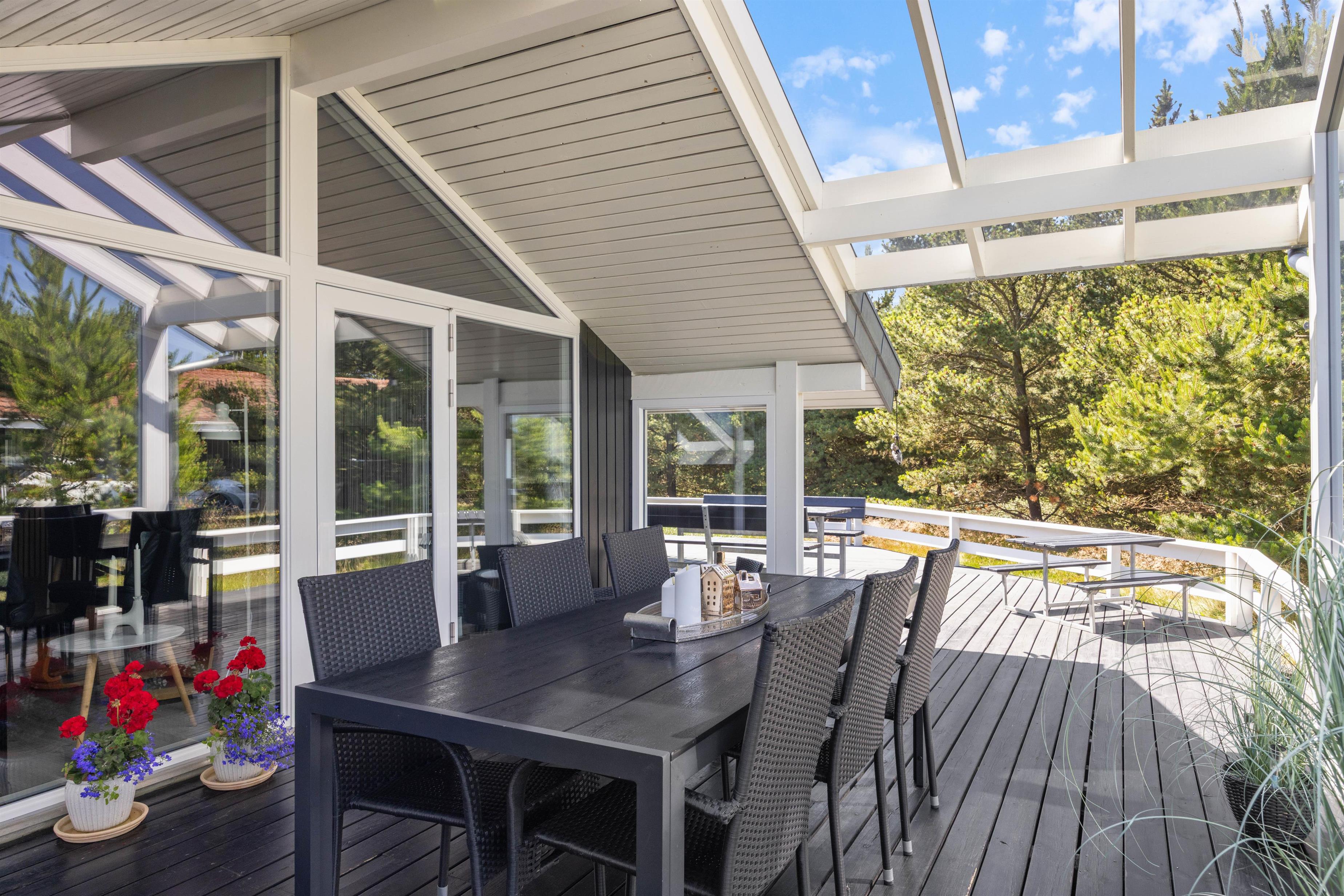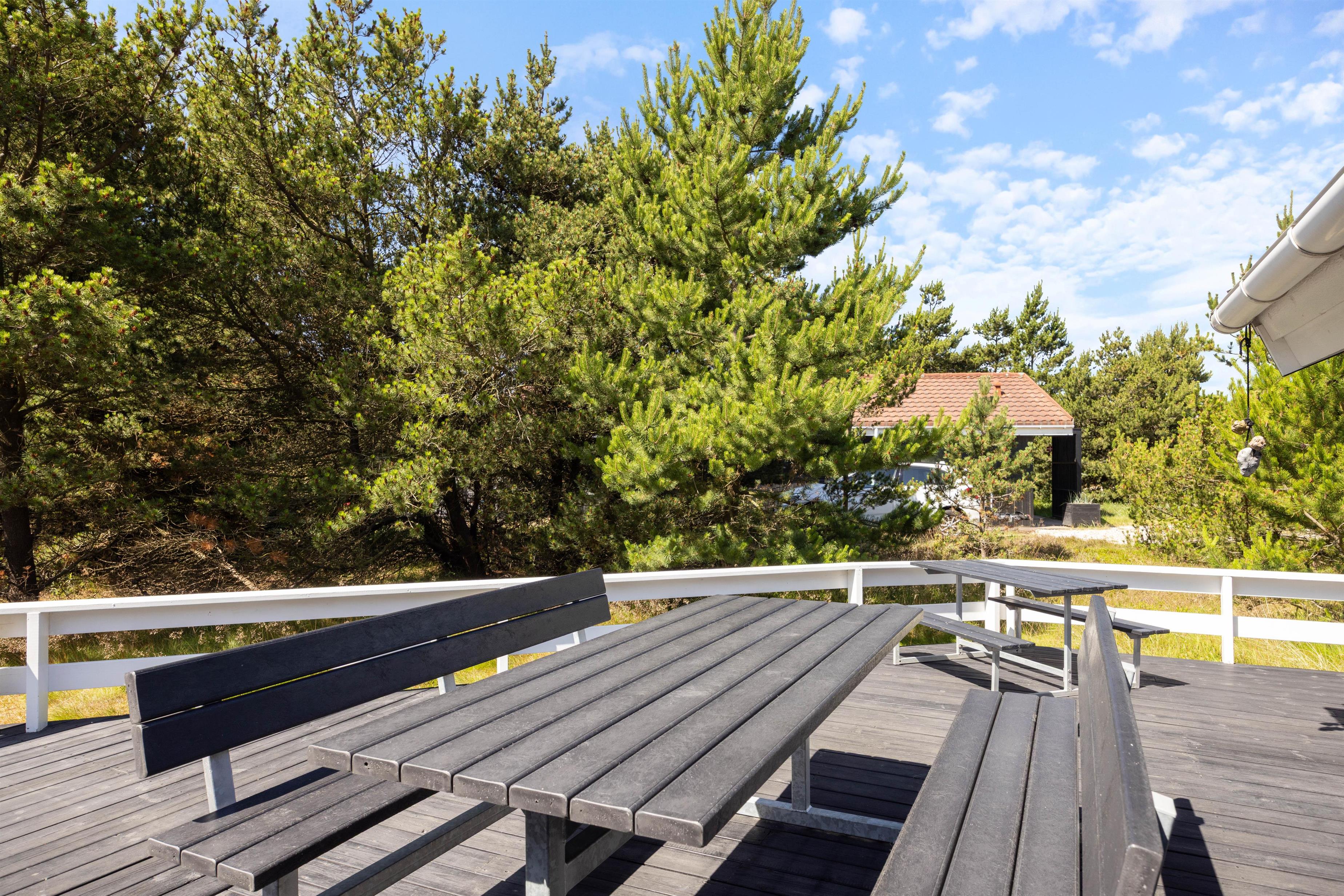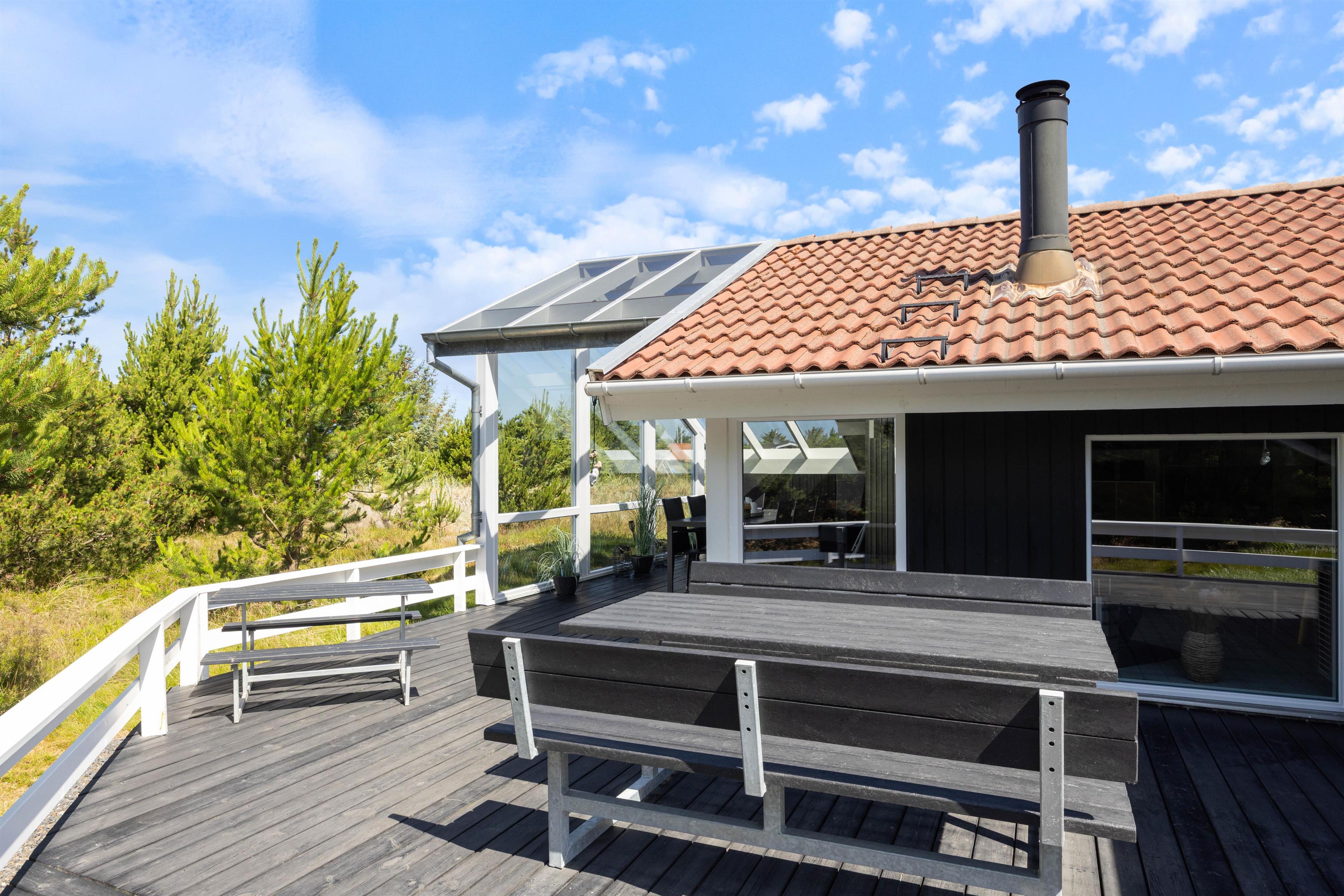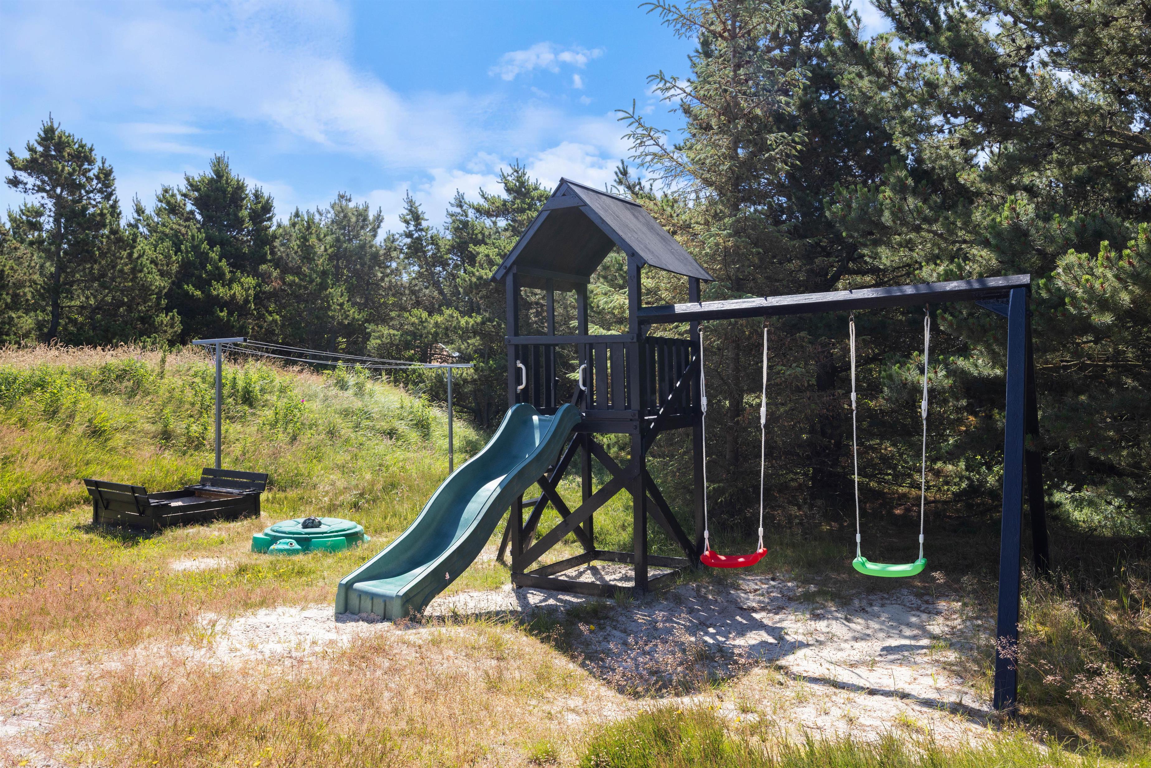 Til de mindste feriegæster har sommerhuset fine forhold udendørs med gyngestativer, legetårn med rutsjebane samt sandkasse, og de voksne kan slappe af og nyde den storslåede natur, solen og den friske havluft på den fine, møblerede, afskærmede og delvist overdækkede terrasser. Her finder I naturligvis også en grill til feriemadlavningen.