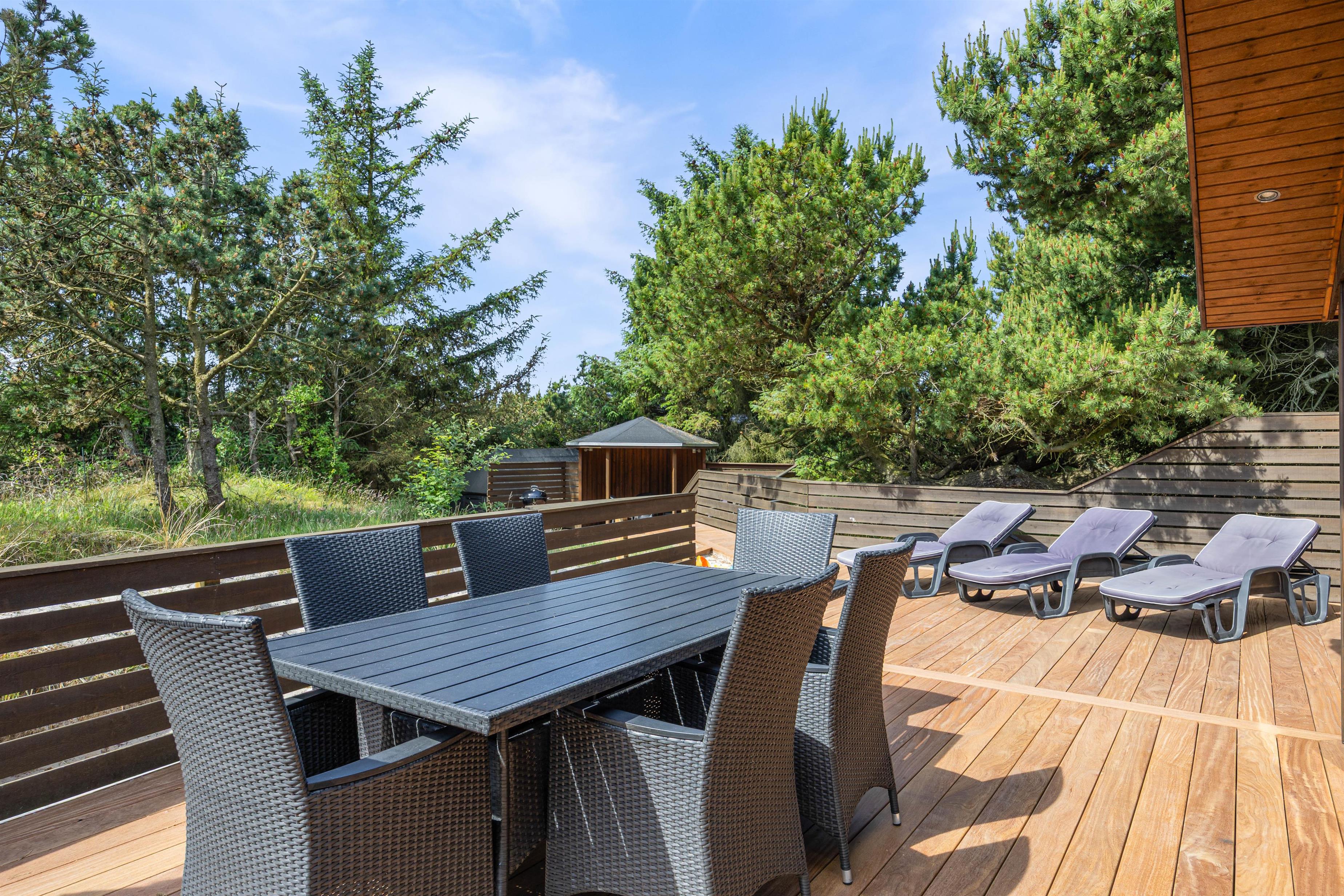 Der er flere terrasser. Den lukkede terrasse giver sammen med de nærtliggende træer både privatliv og læ for vinden og er samtidig ideel, hvis der er småbørn eller hund i familien. I det sydvestlige hjørne af grunden er der en lavere beliggende terrasse, som udover at være endnu mere læfyldt, også giver masser af muligheder for sol og afslapning.