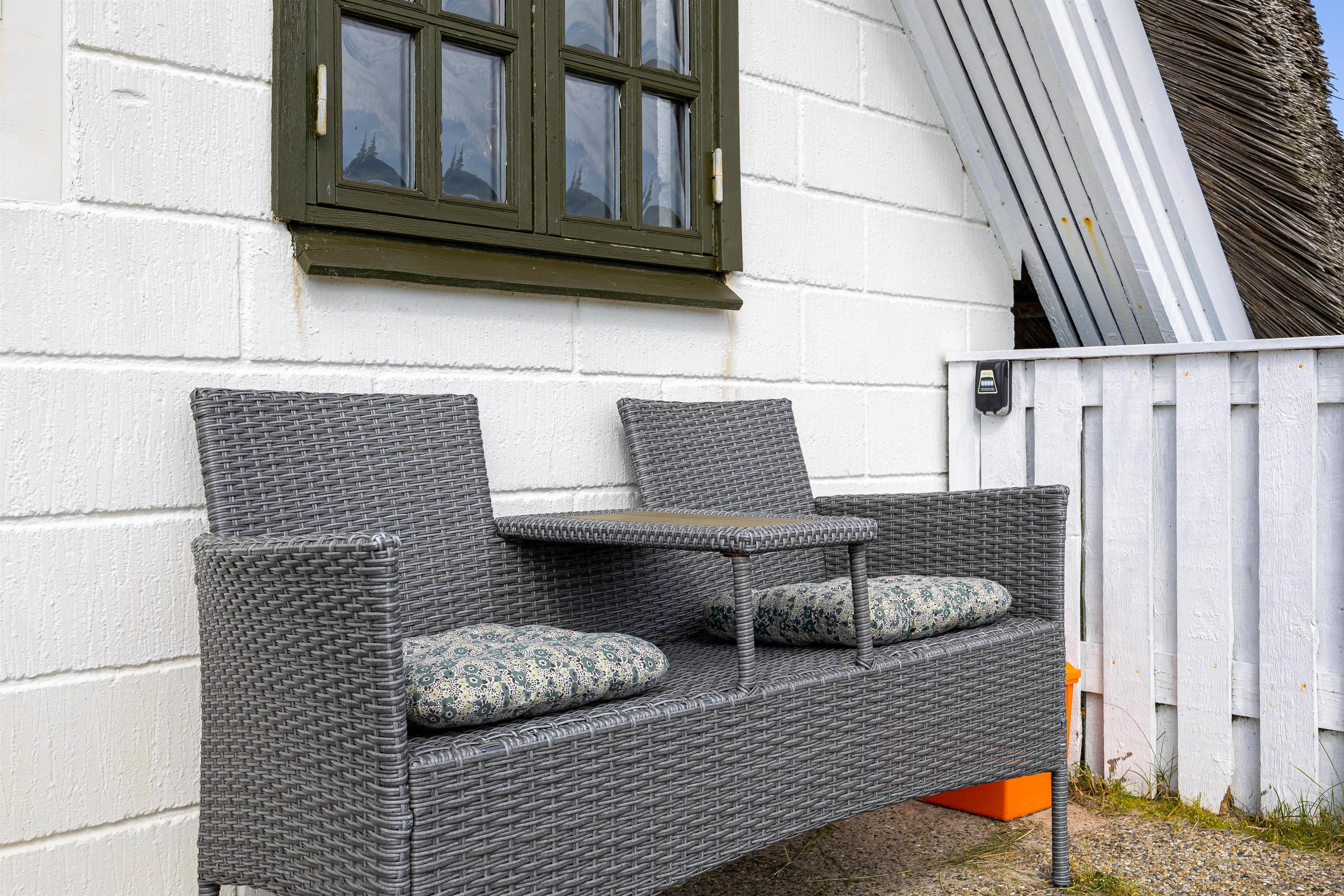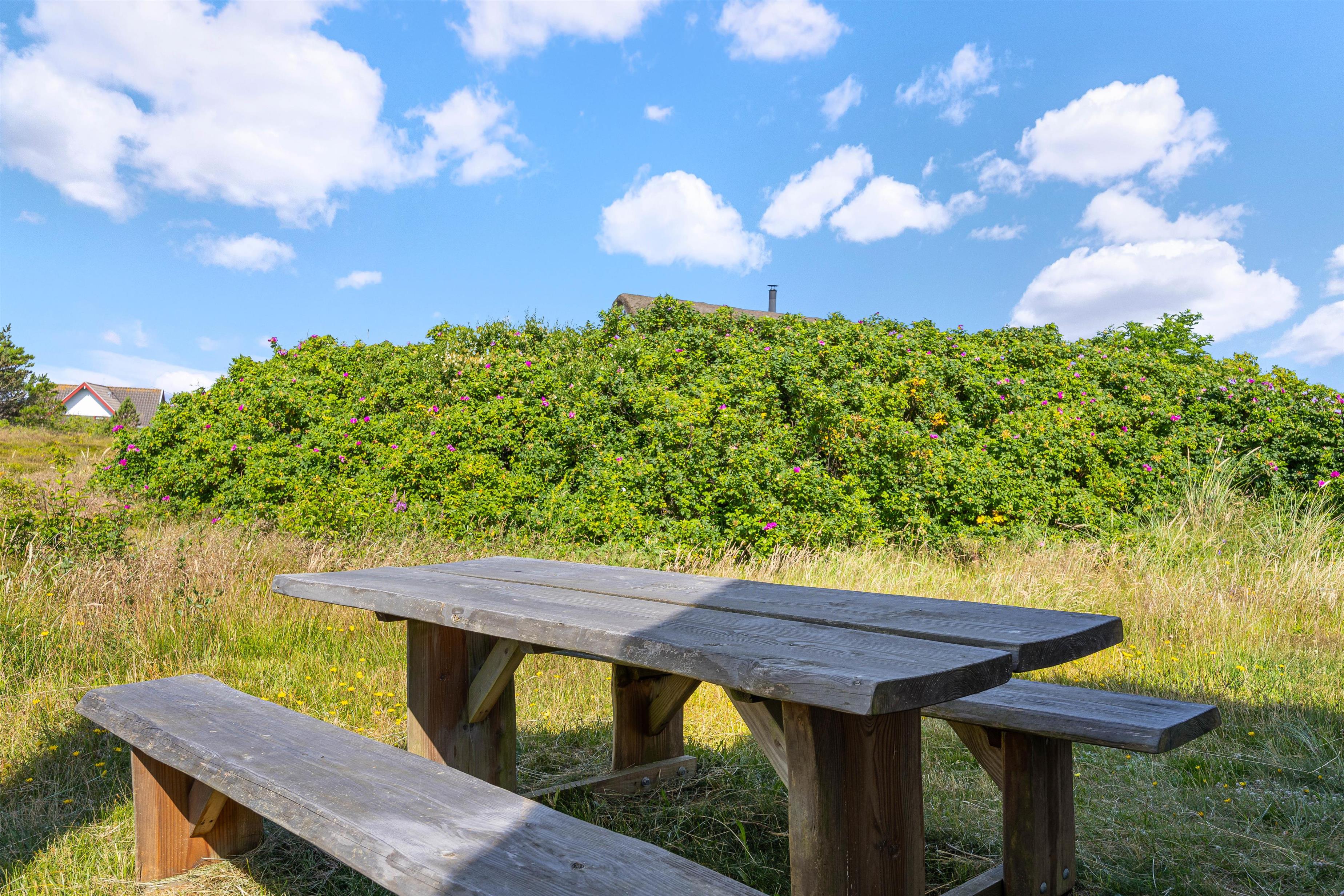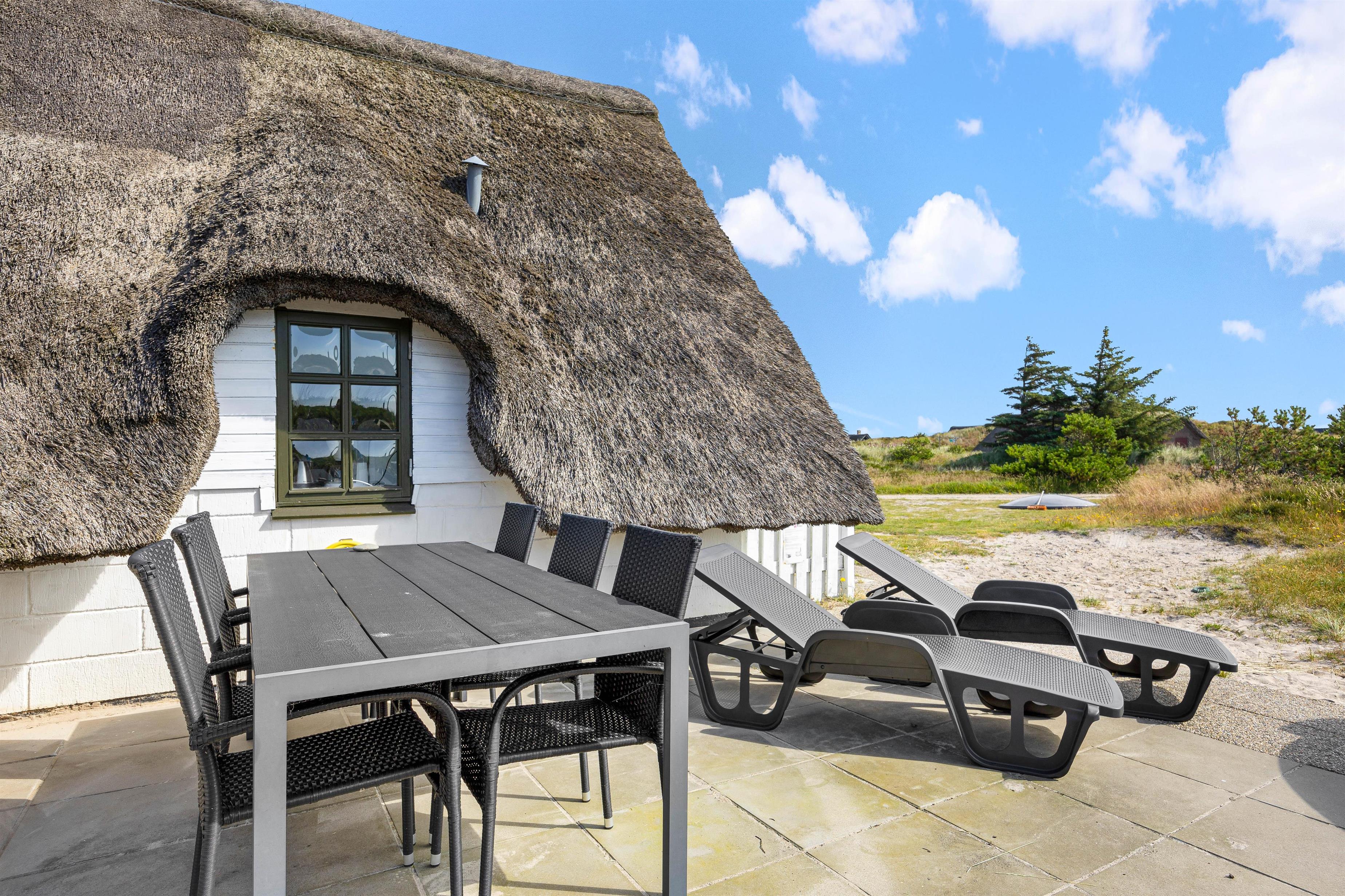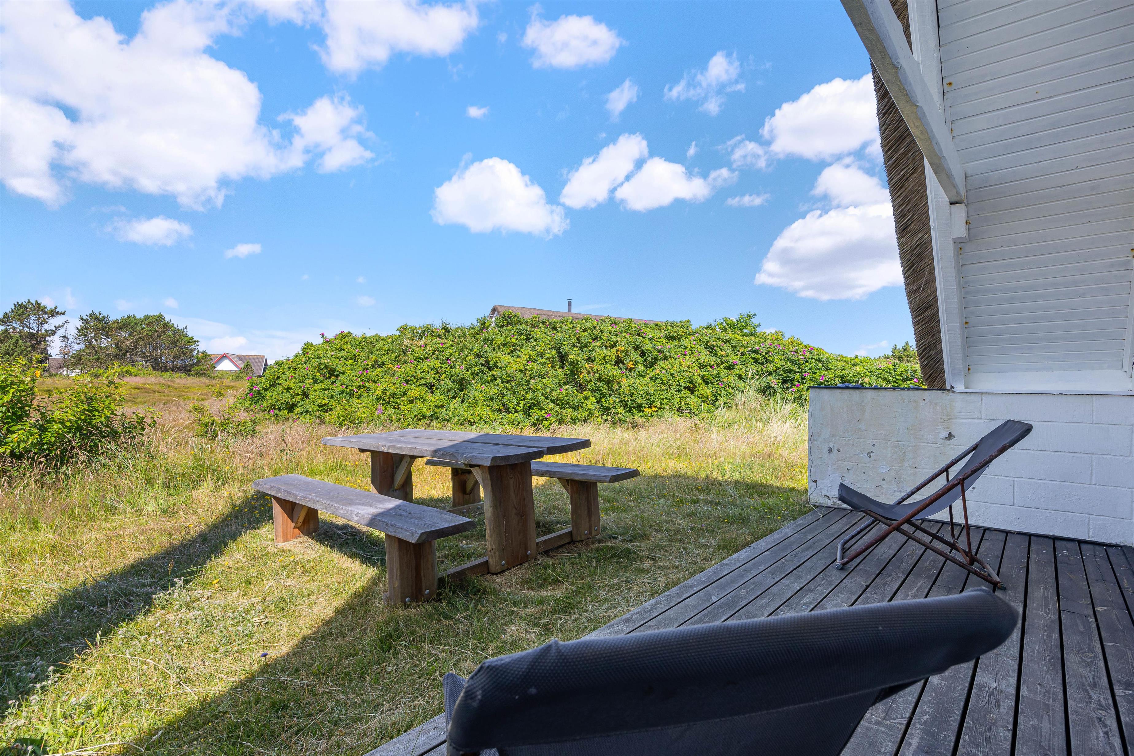 Feriehuset er beliggende på en stor naturgrund med lyng og svajende marehalm. Nyd solskinstimerne udendørs, hvor havemøblerne allerede står klar til jer! Spil i solen, planlæg feriedagens eller slap af efter dejlig dag på stranden. Til aften skal I alle samles til en dejlig grillmiddag på terrassen. Tænd op i grillen og nyd hertil et køligt glas rosé.