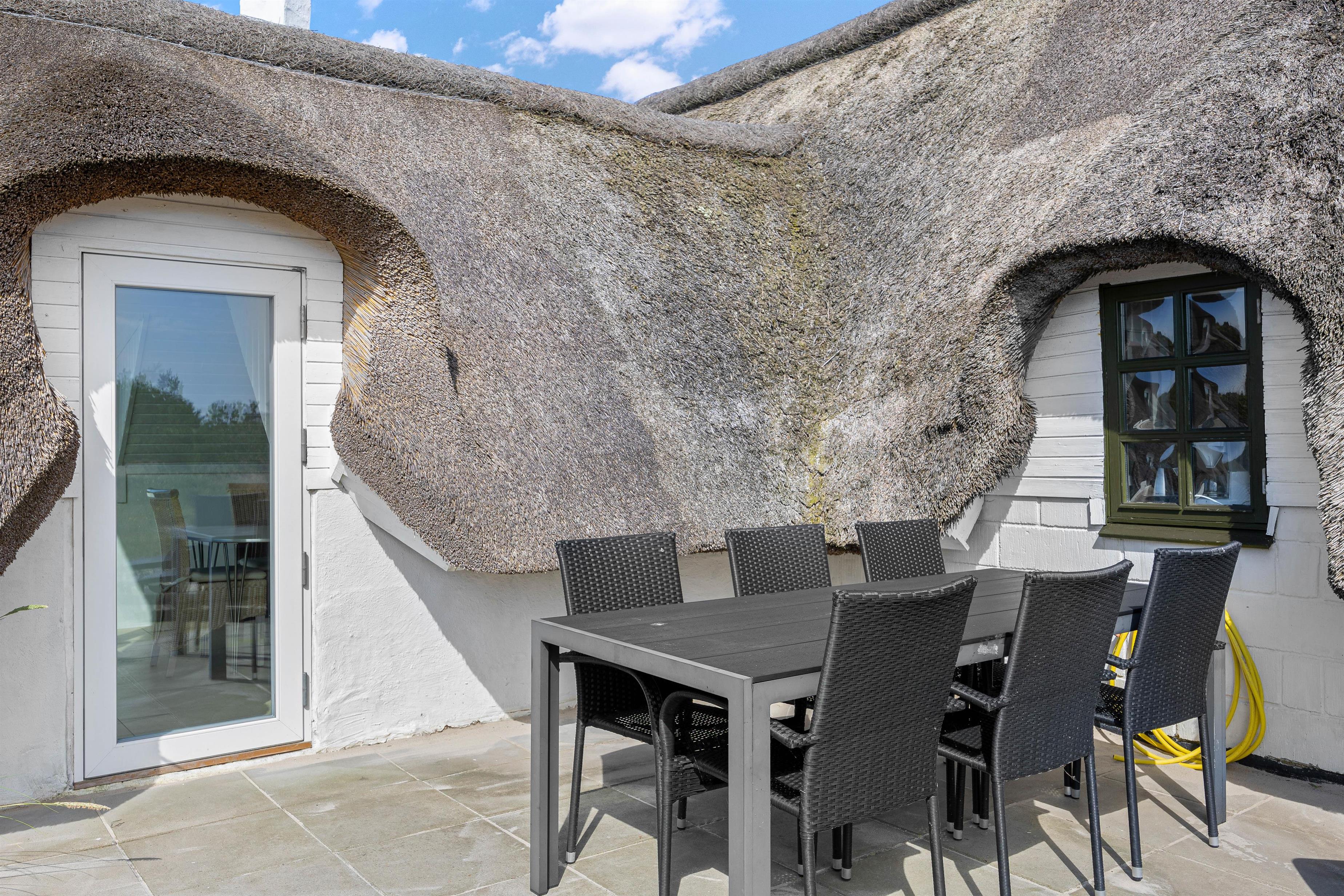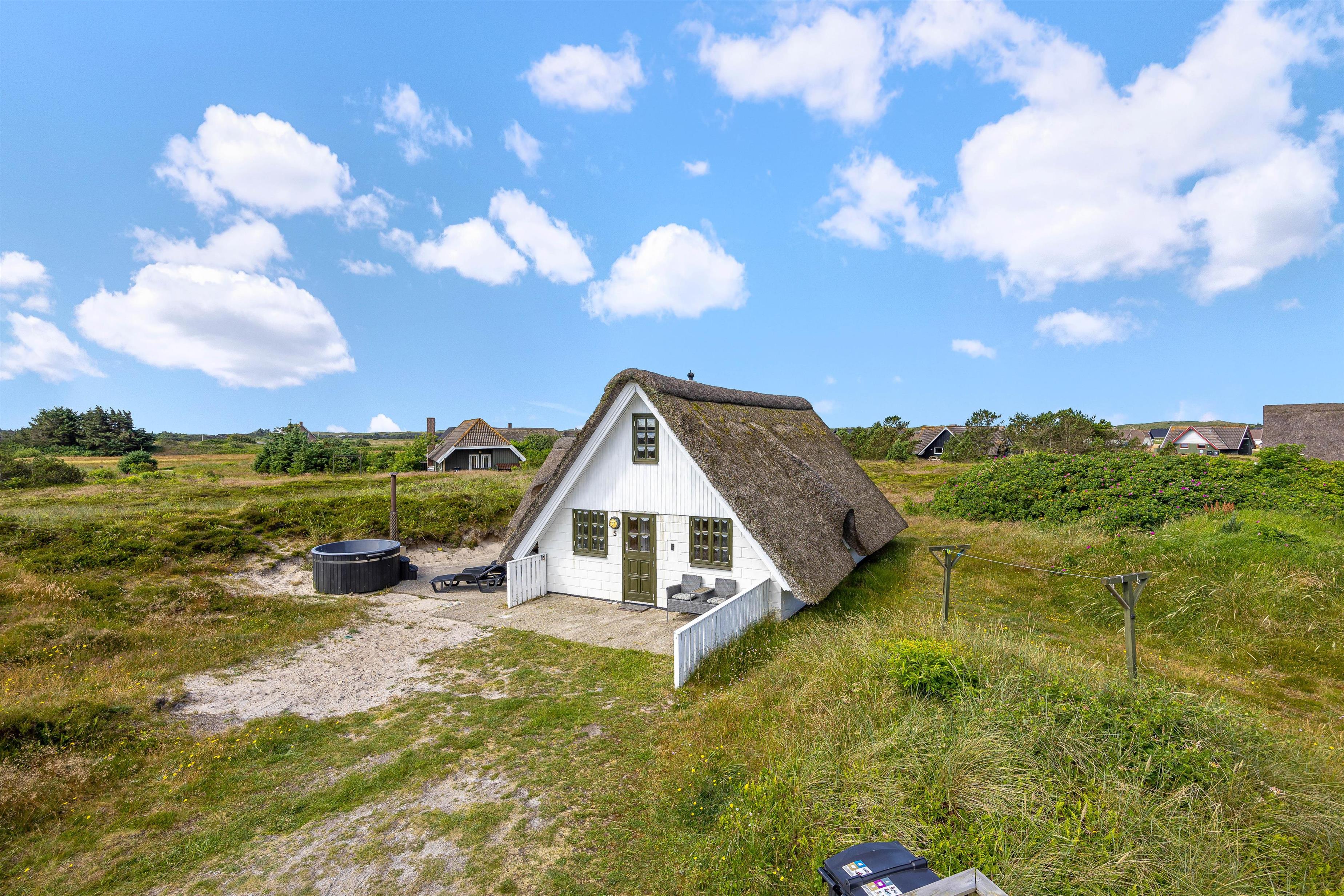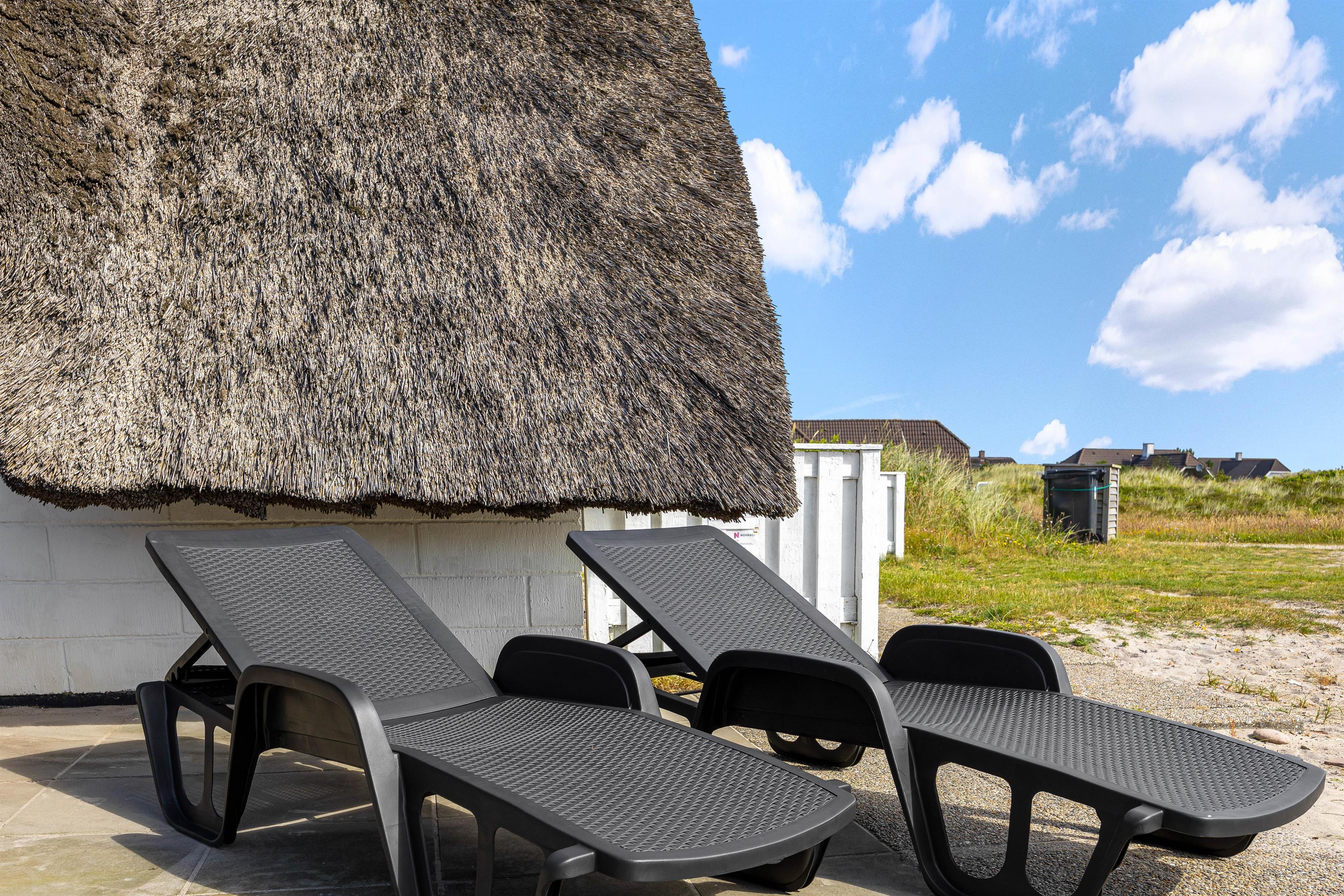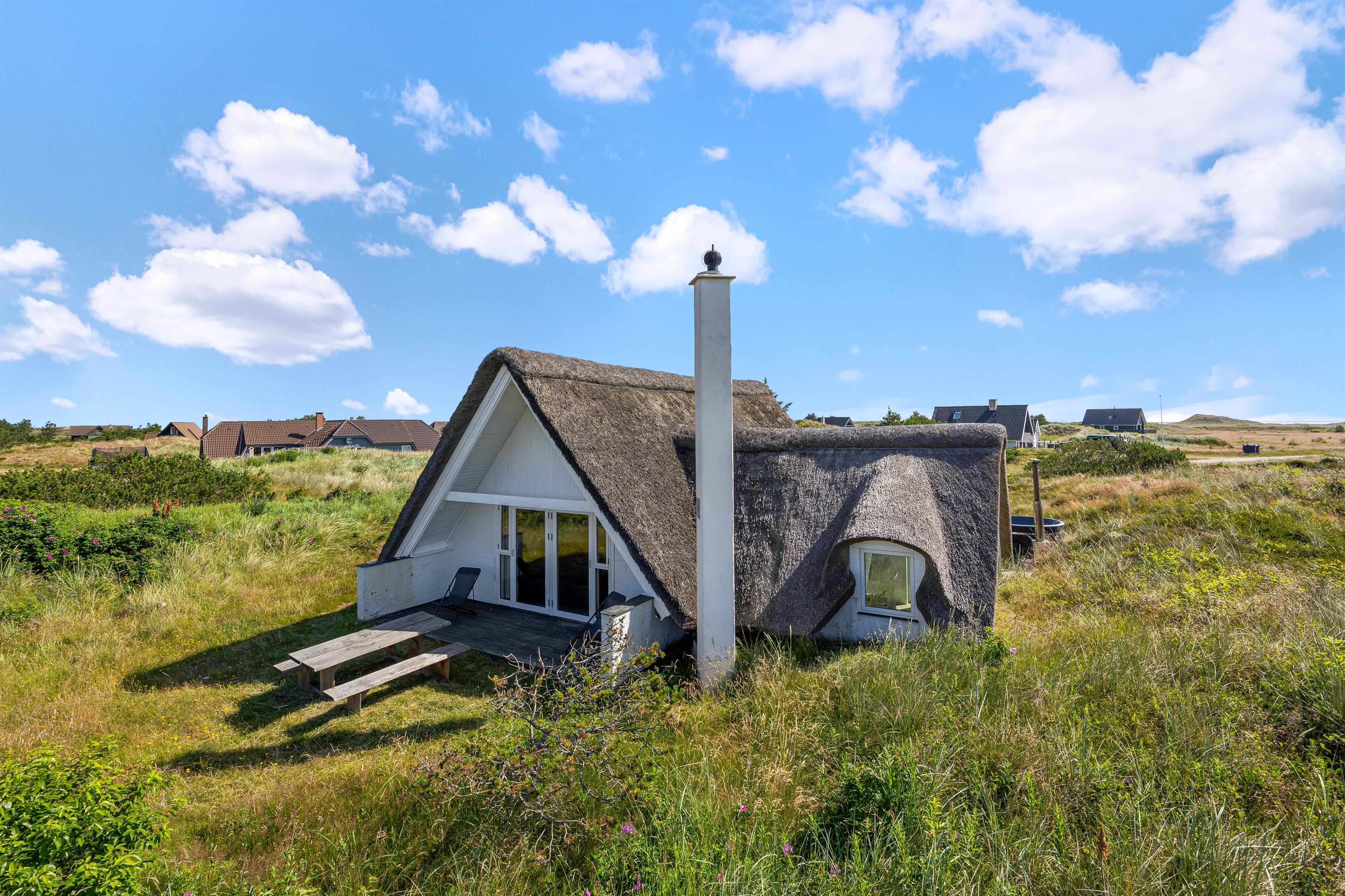 Feriehuset er beliggende på en stor naturgrund med lyng og svajende marehalm. Nyd solskinstimerne udendørs, hvor havemøblerne allerede står klar til jer! Spil i solen, planlæg feriedagens eller slap af efter dejlig dag på stranden. Til aften skal I alle samles til en dejlig grillmiddag på terrassen. Tænd op i grillen og nyd hertil et køligt glas rosé.