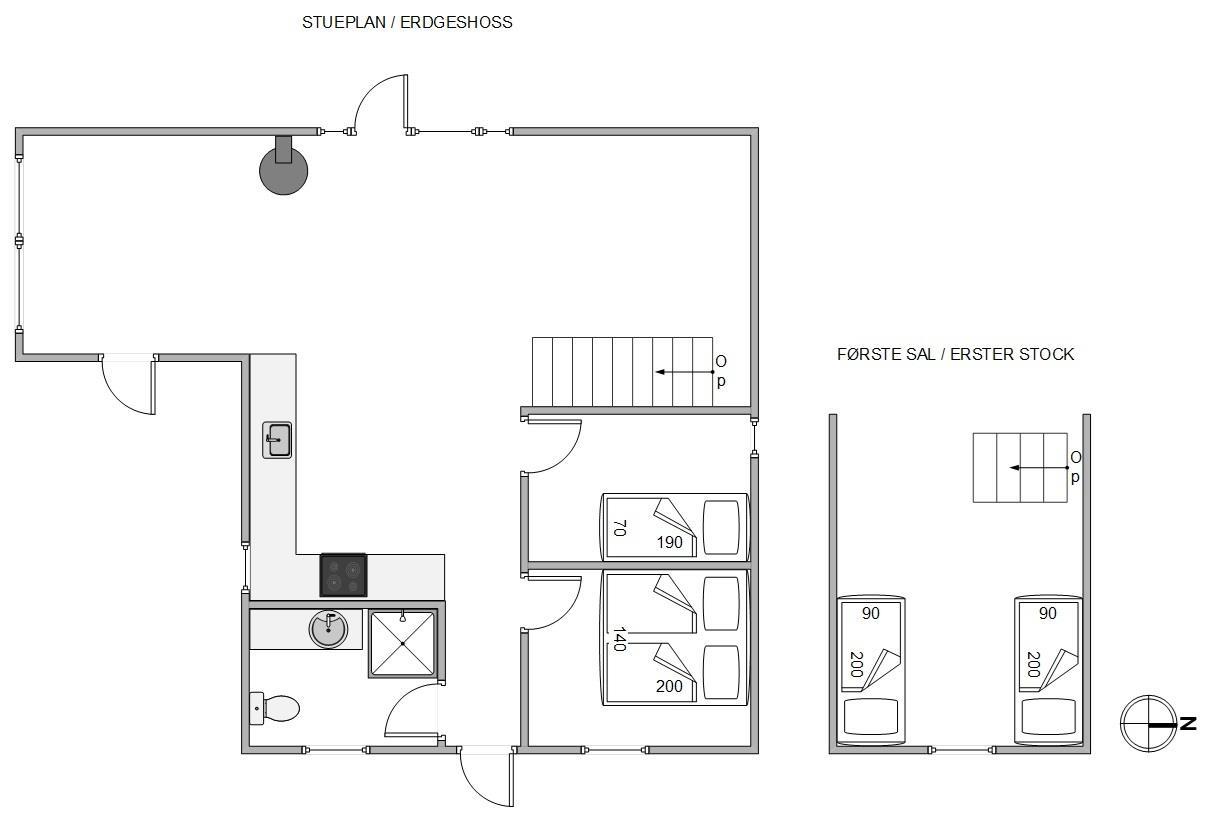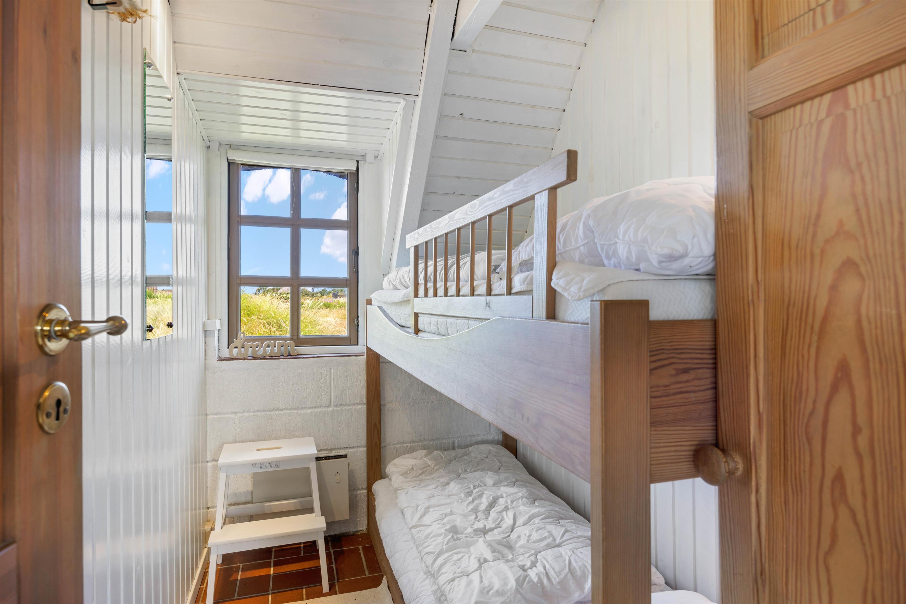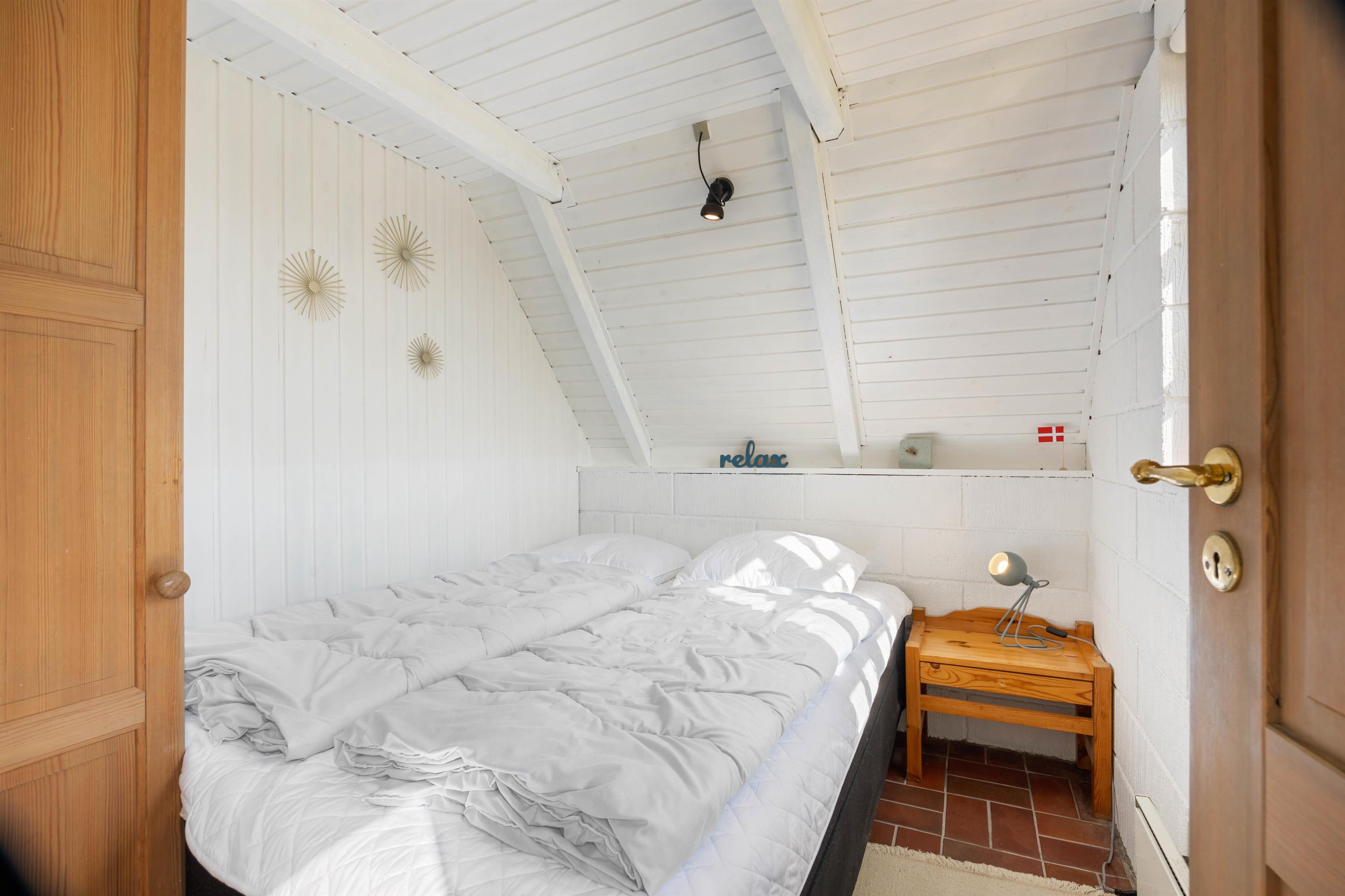 Hjerterummet er det skønne opholdsrum, der kombinerer stue og køkkenet i ét. Her er der plads til familielivet – uanset om I vil lave mad sammen, slappe af i sofaen eller spille brætspil omkring spisebordet. Tænd op i brændeovnen, der sørger for, at stemningen er i top. Praktisk er her også installeret gulvvarme. Trappen i stuen fører jer op på hemsen, hvor I finder 2 sovepladser. Herunder er her 2 soveværelser og et badeværelse. Bemærk venligst, at der ikke er gelænder på trappen.