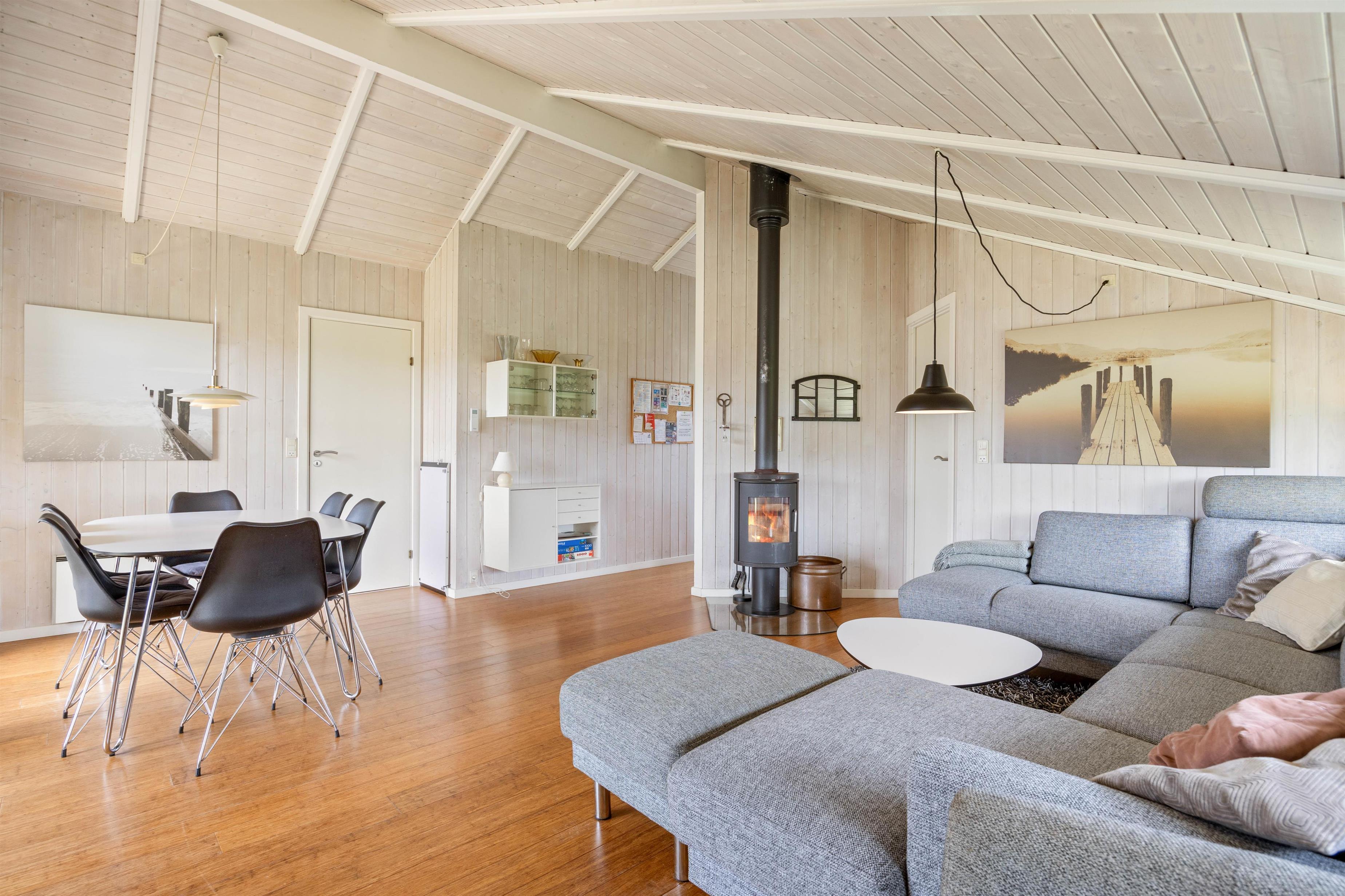 Sommerhusets hjerte er opholdsrummet, som er indrettet i klassisk stil med smukke trægulve og lyse, træbeklædte lofter til kip. Der er et fint lysindfald igennem de mange vinduespartier, og I kan sætte jer godt til rette i sofaen eller ved spisebordet. Det åbne, veludstyrede køkken indbyder til at tilberede lækre måltider, og opvaskemaskinen gør det nemt at rydde op bagefter.