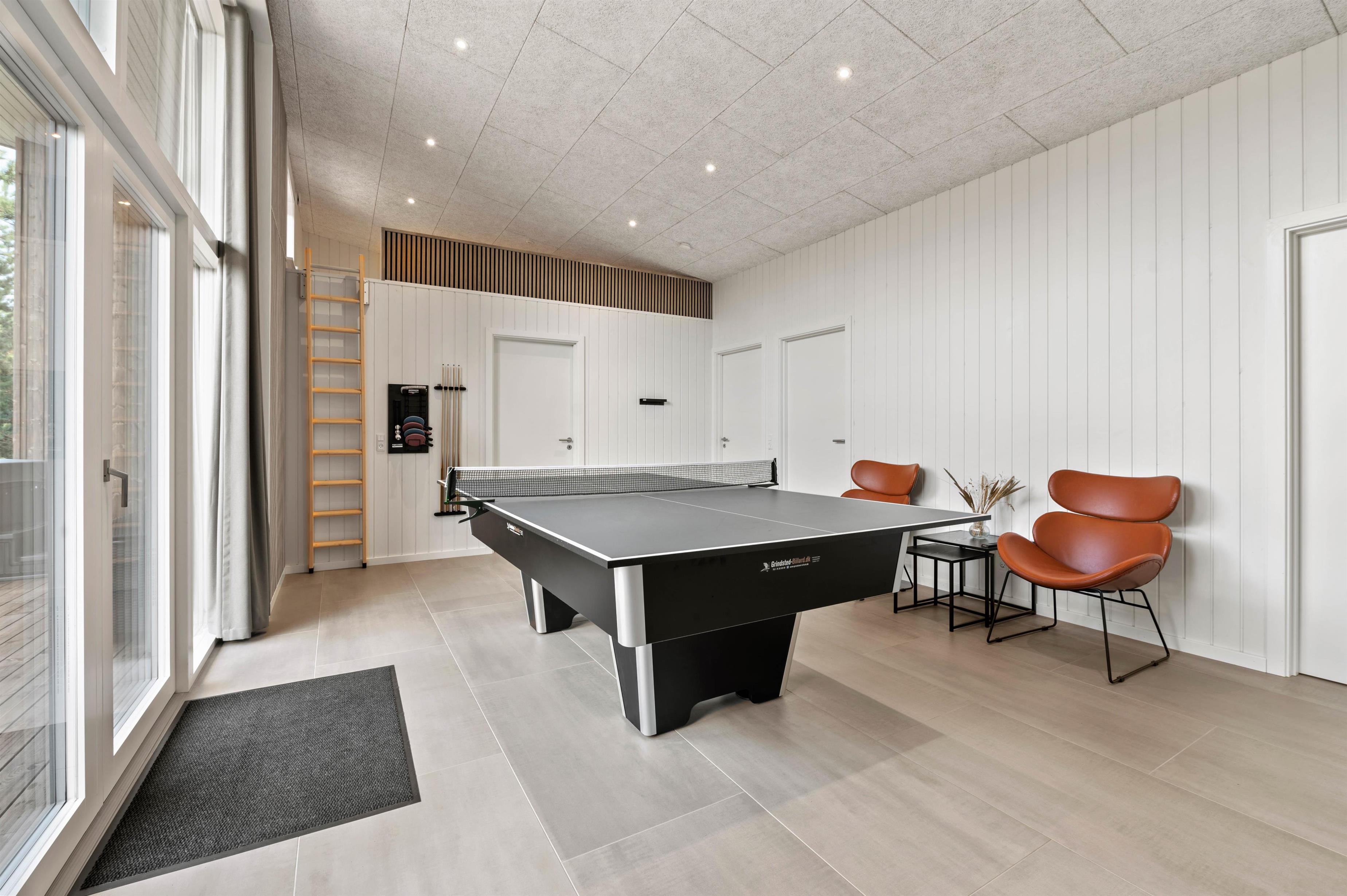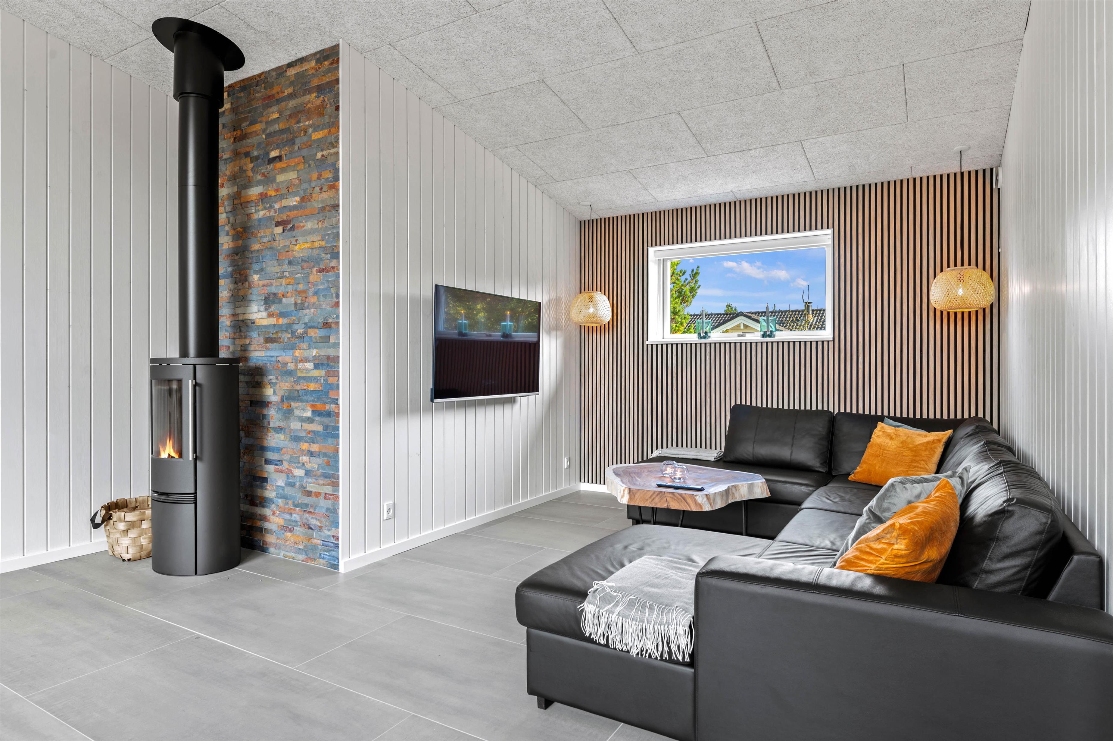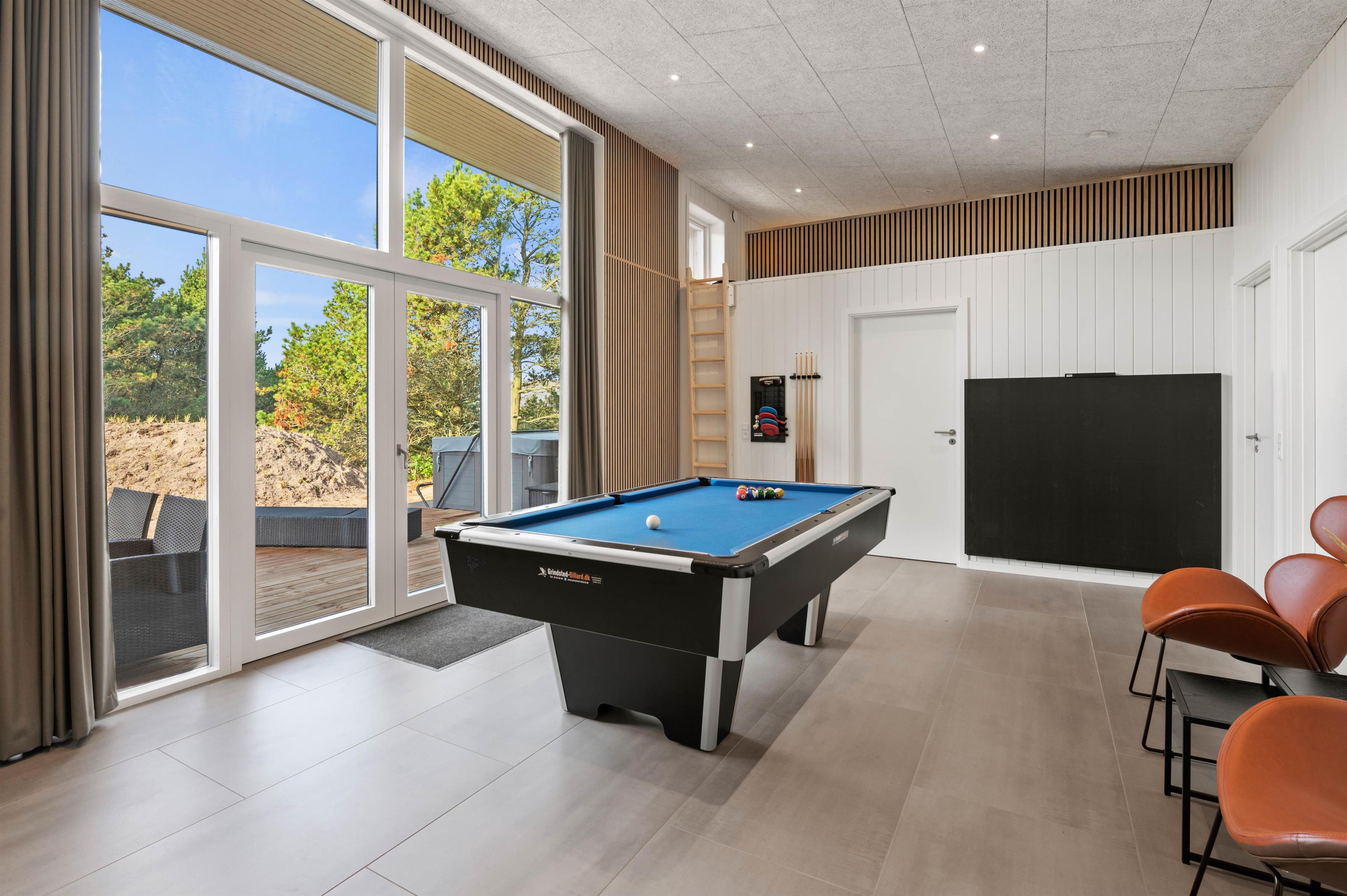 Det moderne indrettede feriehus har meget at byde på. I den rummelige stue kan du hygge dig med tv, arrangere en spilaften eller læse en god bog ved varmen fra brændeovnen. Mere fysiske aktiviteter, som bordtennis og billard foregår i aktivitetsrummet. Der er gulvvarme i stuen samt alle badeværelser, og energibesparende opvarmning fra varmepumpen.