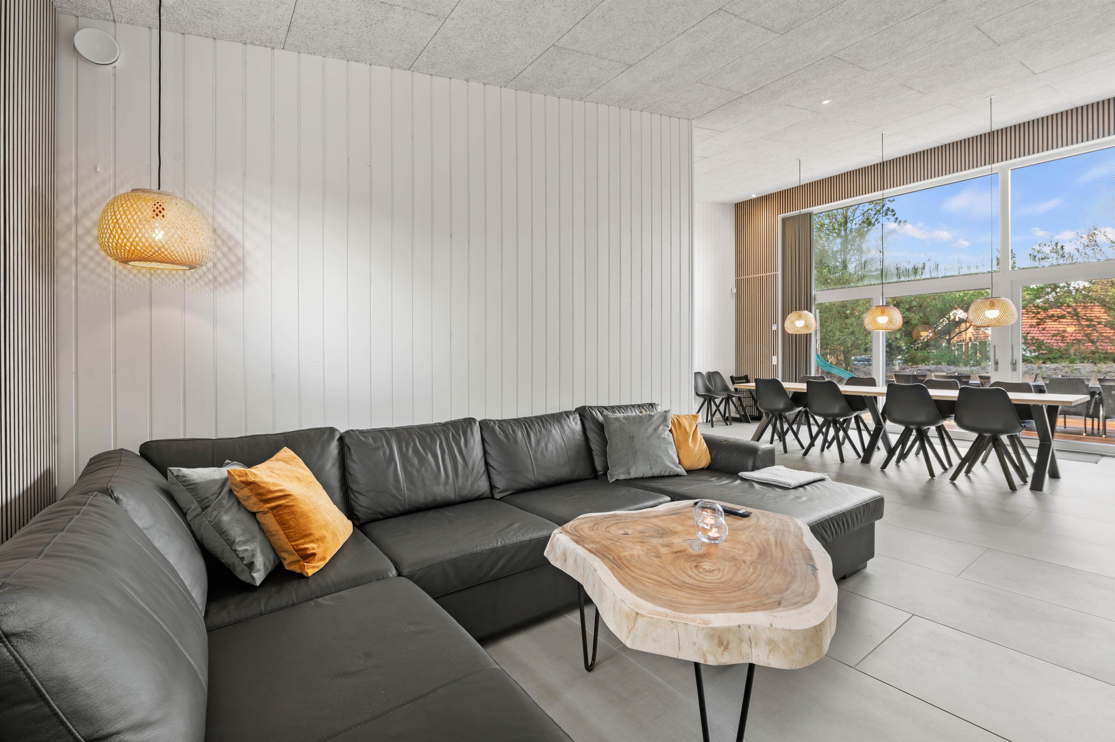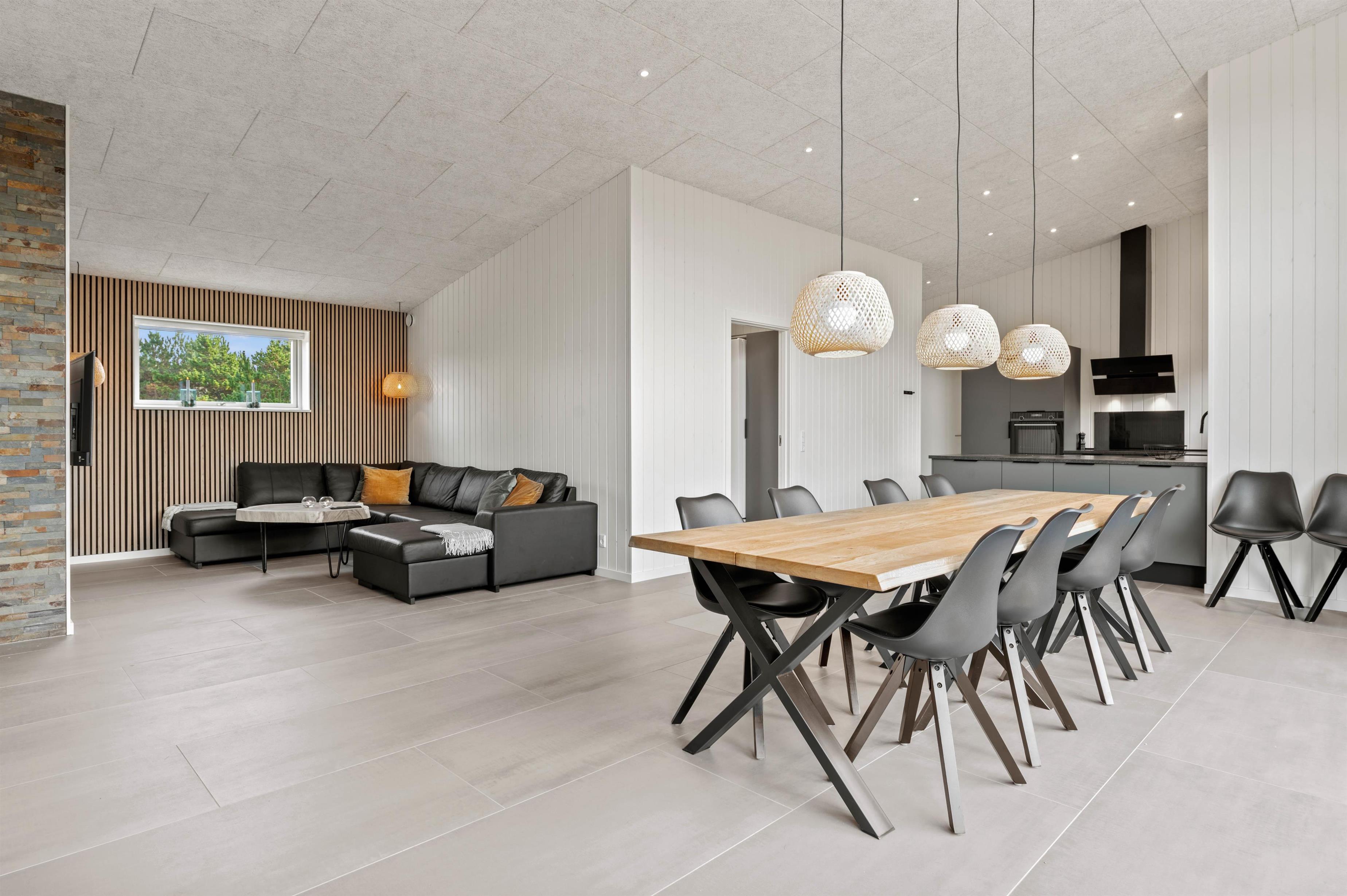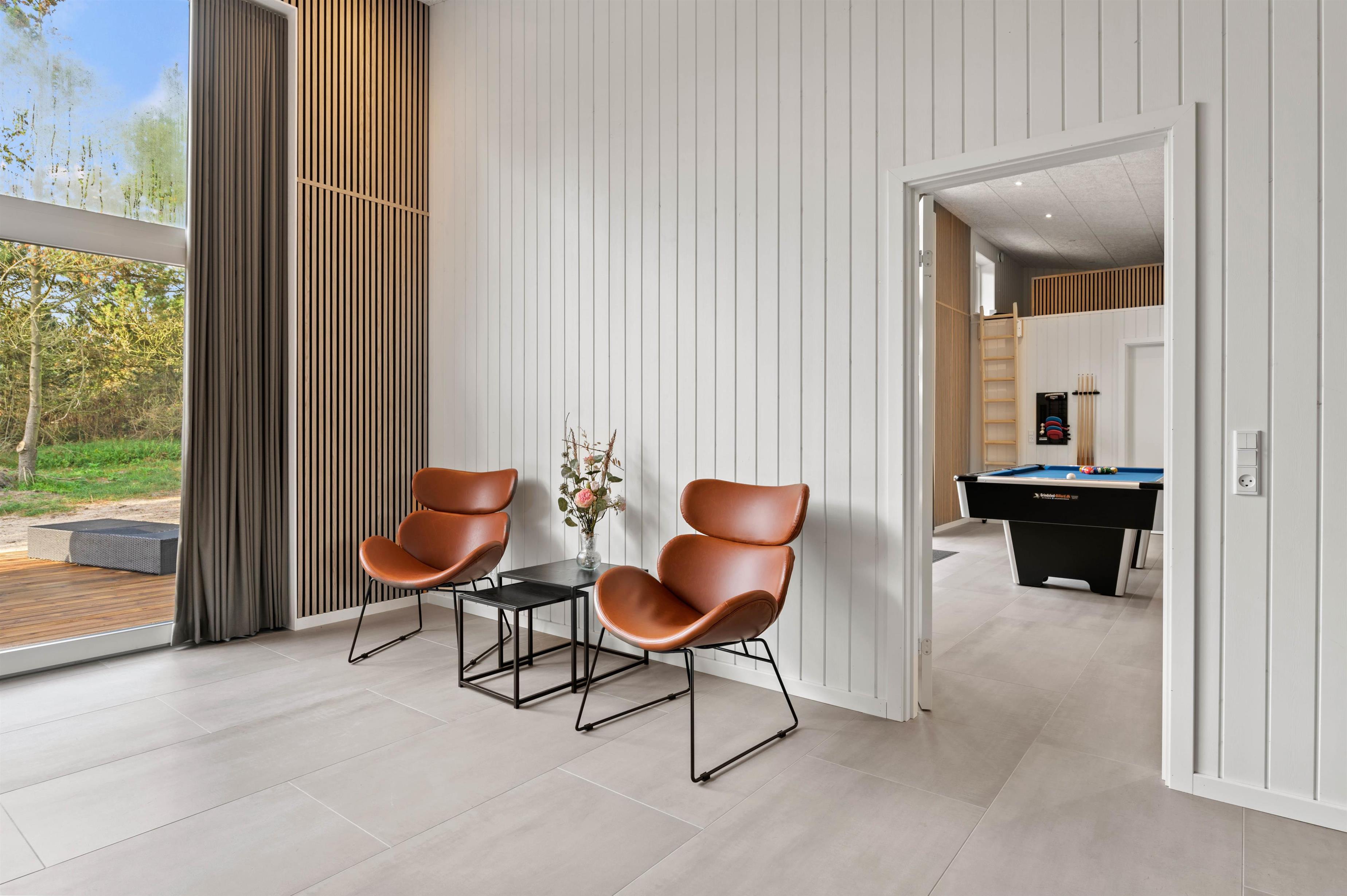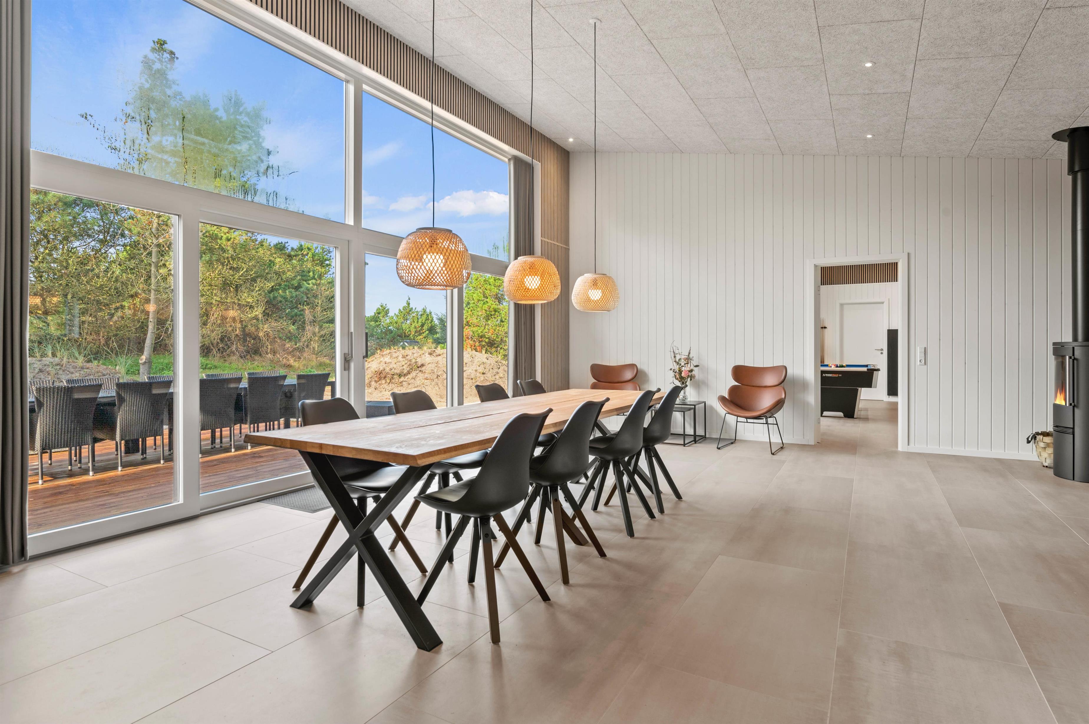 Det moderne indrettede feriehus har meget at byde på. I den rummelige stue kan du hygge dig med tv, arrangere en spilaften eller læse en god bog ved varmen fra brændeovnen. Mere fysiske aktiviteter, som bordtennis og billard foregår i aktivitetsrummet. Der er gulvvarme i stuen samt alle badeværelser, og energibesparende opvarmning fra varmepumpen.