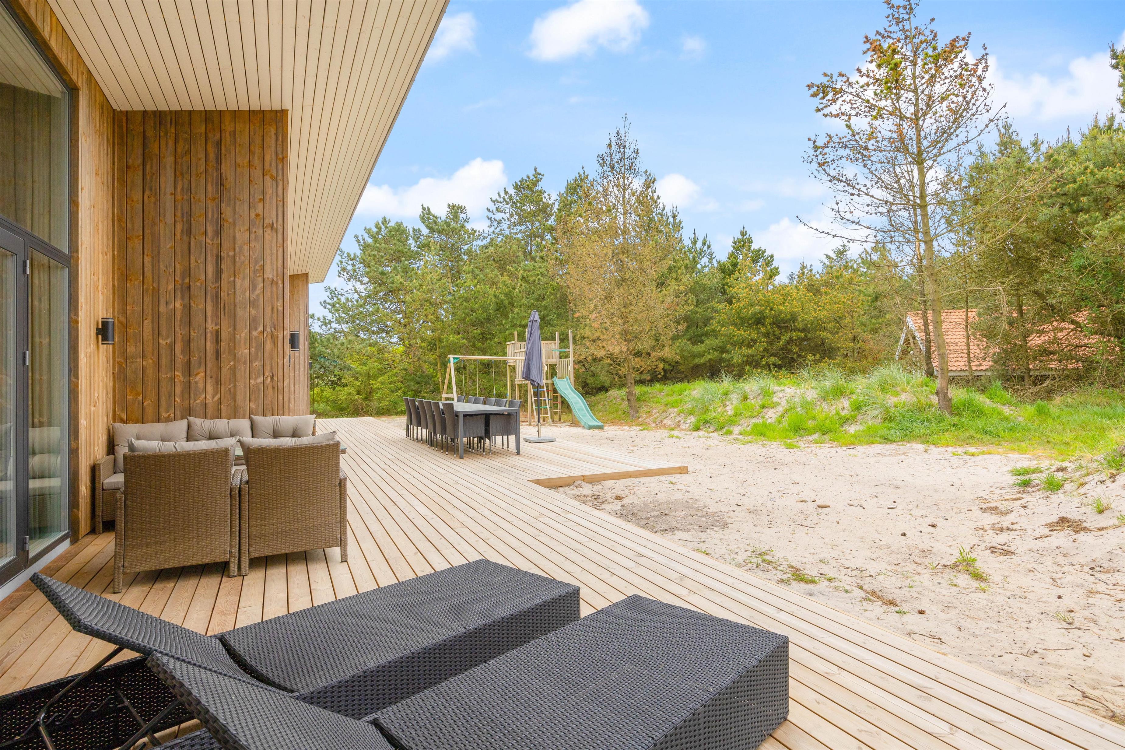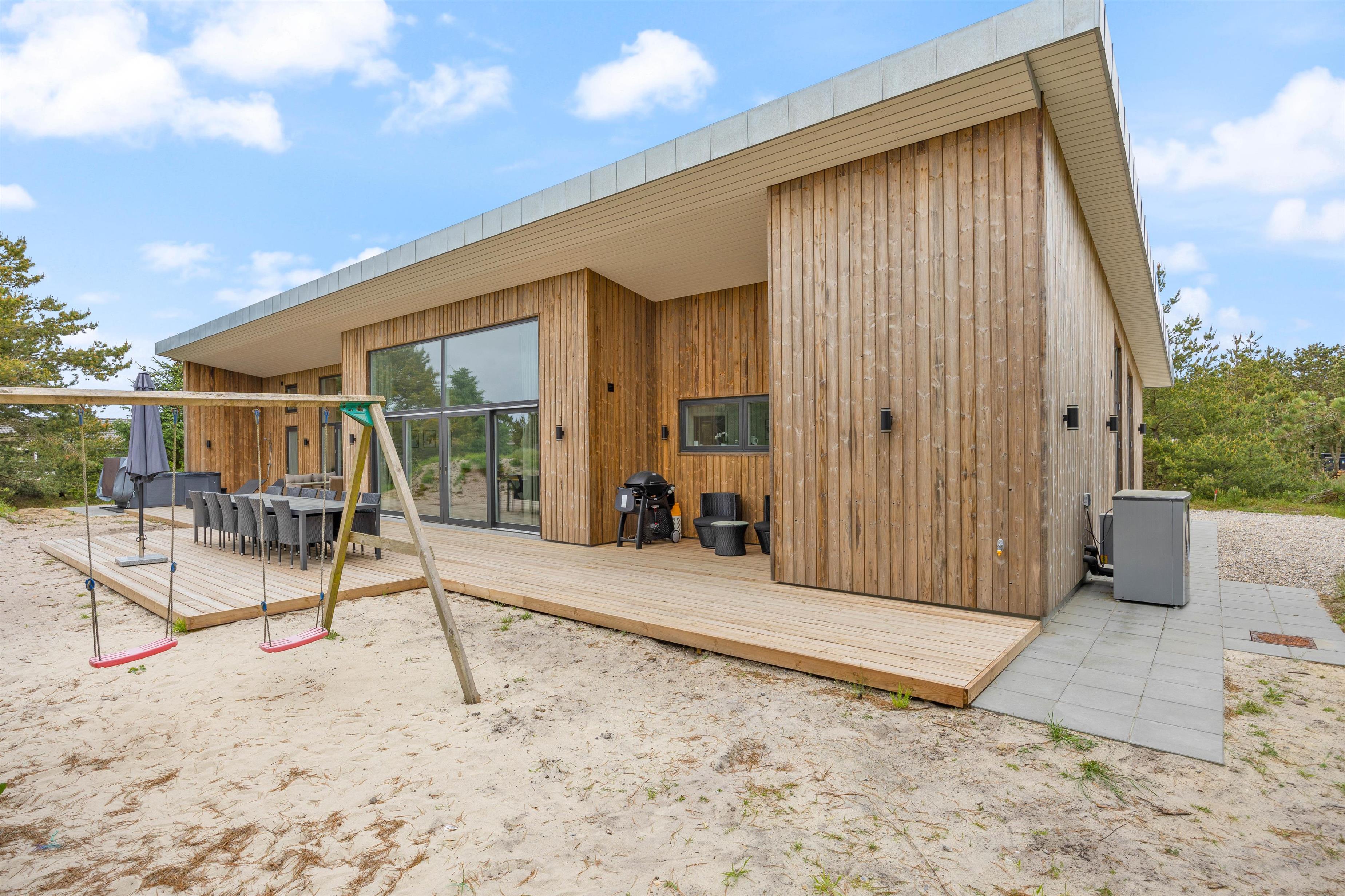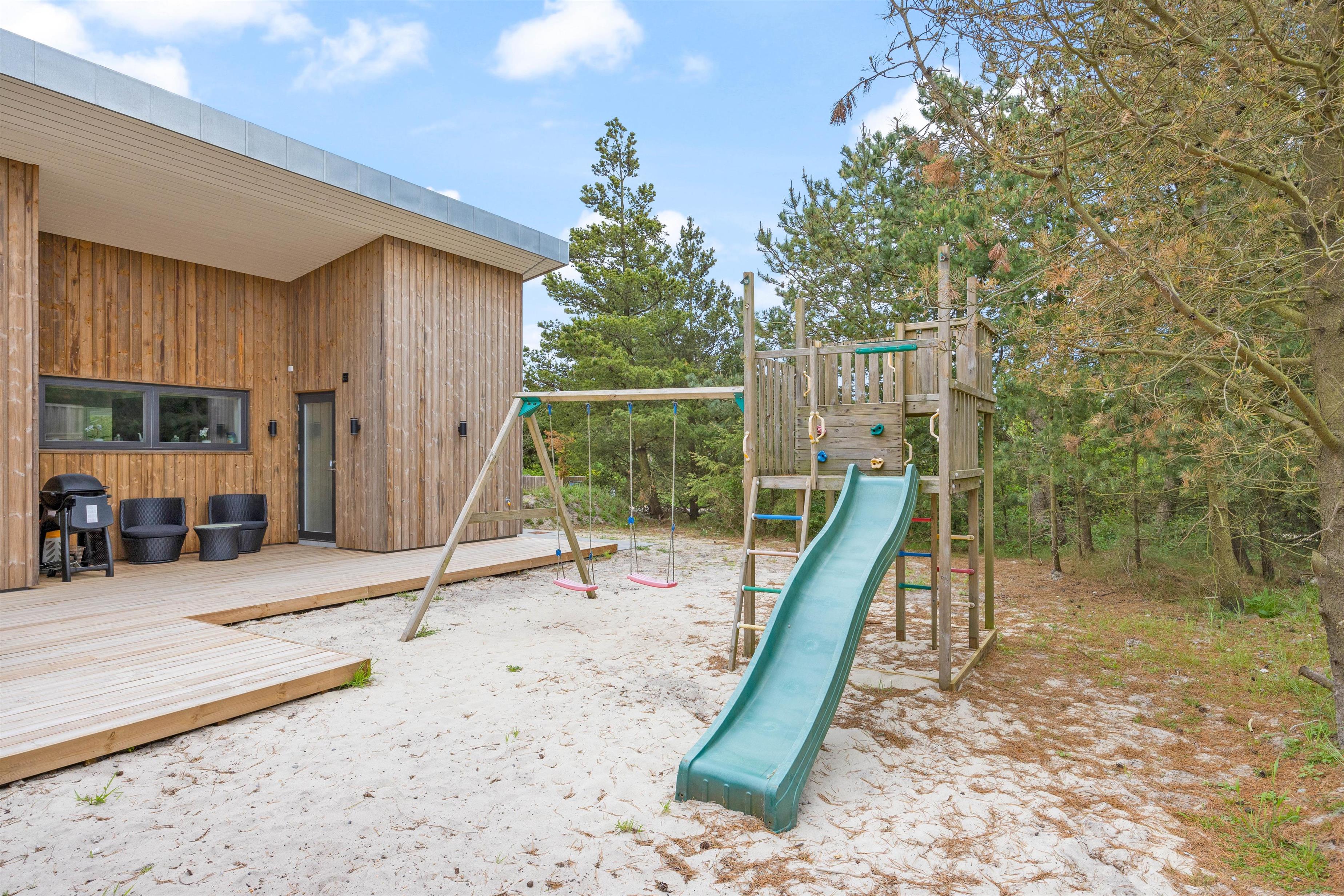 På den delvist afskærmede og delvist overdækkede terrasse kan du altid finde en rolig plet. Du kan sole dig på de komfortable terrassemøbler og liggestole, eller hvad med at benytte gasgrillen til en hyggelig grillaften med frisk fisk? Børnene kan gynge, imens maden tilberedes.