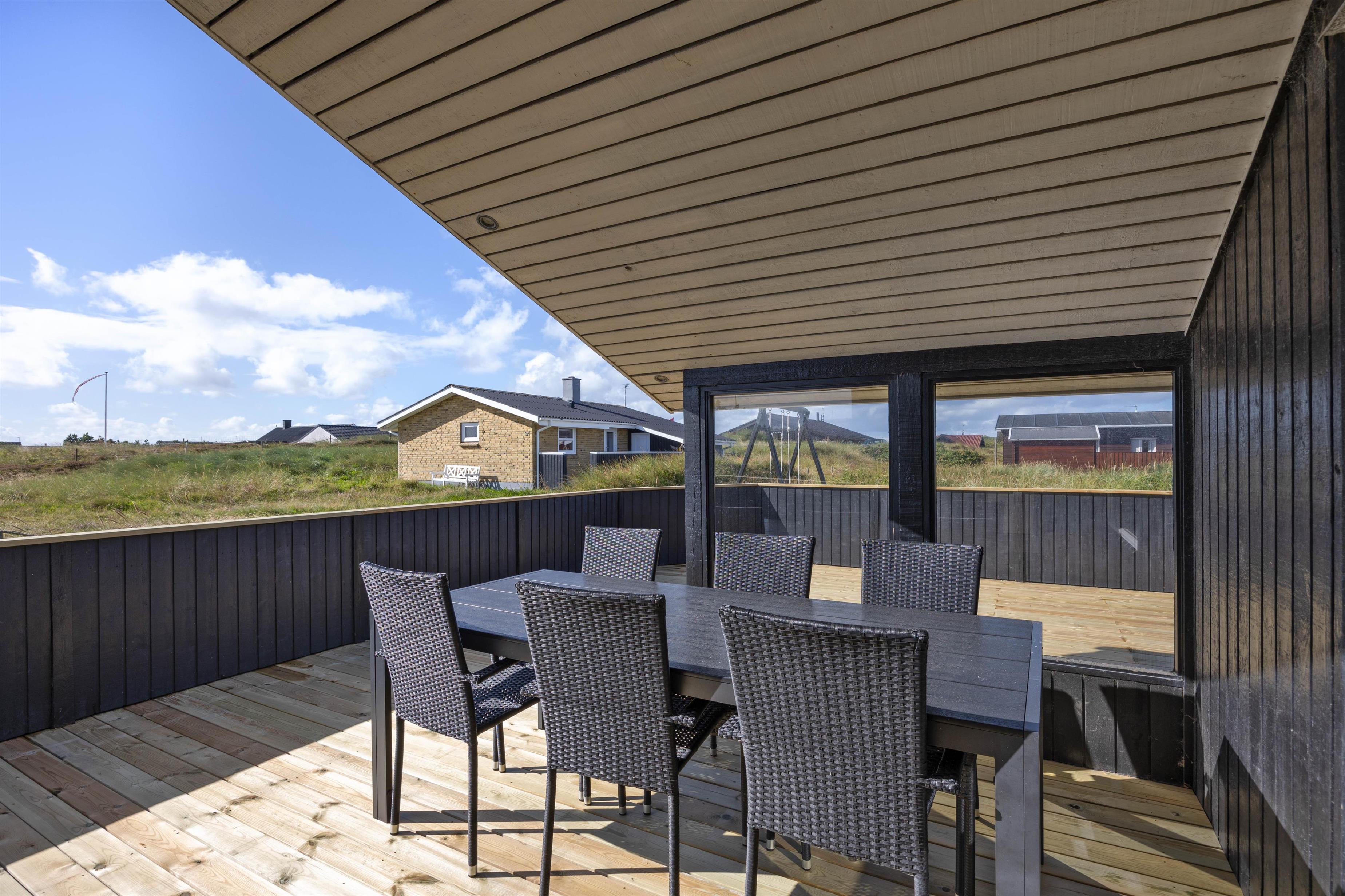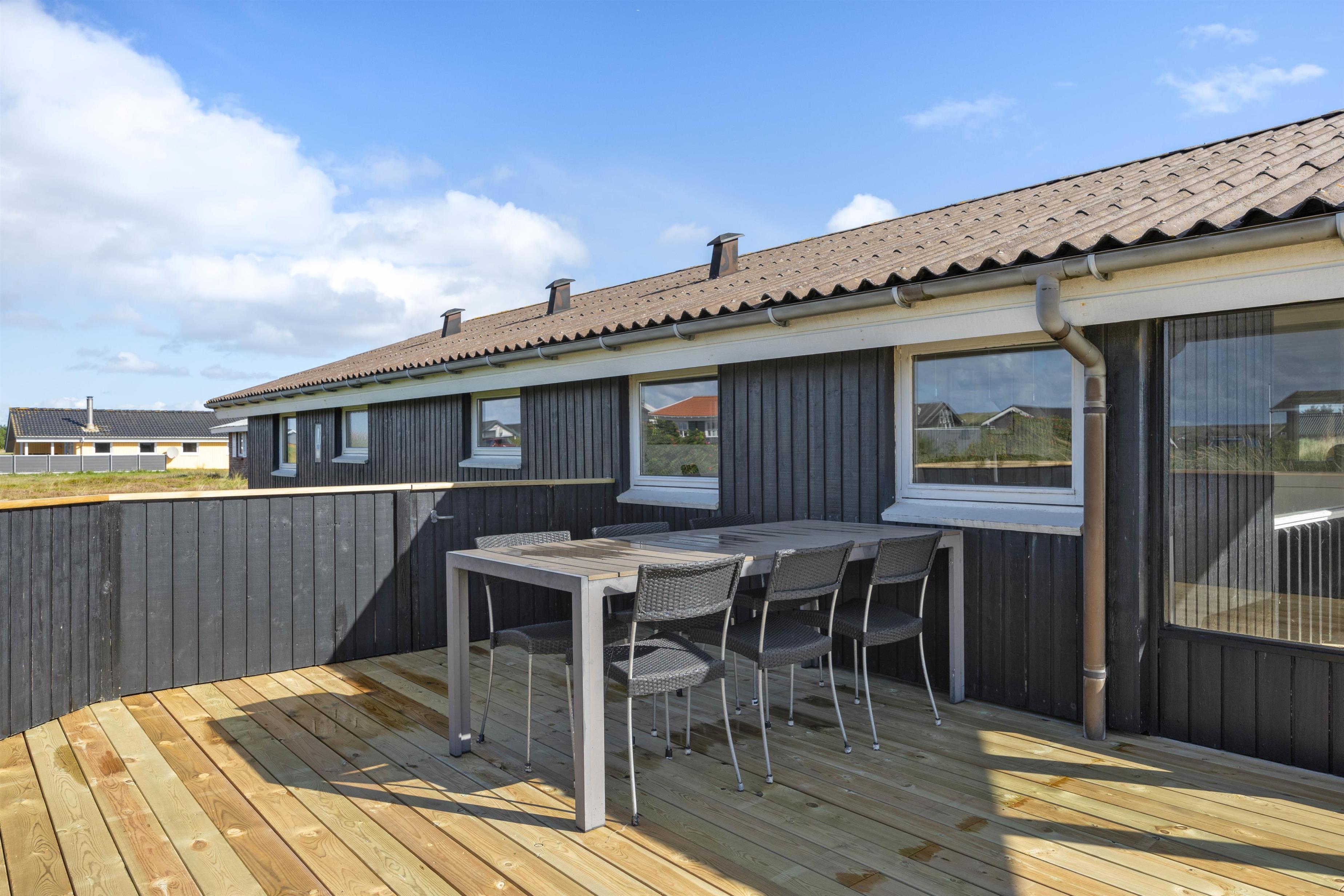 Feriehuset har en rigtig dejlig lukket terrasse, hvor I sagtens kan lade småbørn og hunde gå omkring på egen hånd, og hvor der er plads nok til, at hele familien kan hygge sig sammen og nyde sommervejret. Om aftenen er det oplagt at tænde op i grillen og tilberede lidt ekstra lækkert. Og da terrassen har en overdækket og afskærmet krog, kan I også hygge jer ved grillen, selvom vejret ikke helt spiller med.