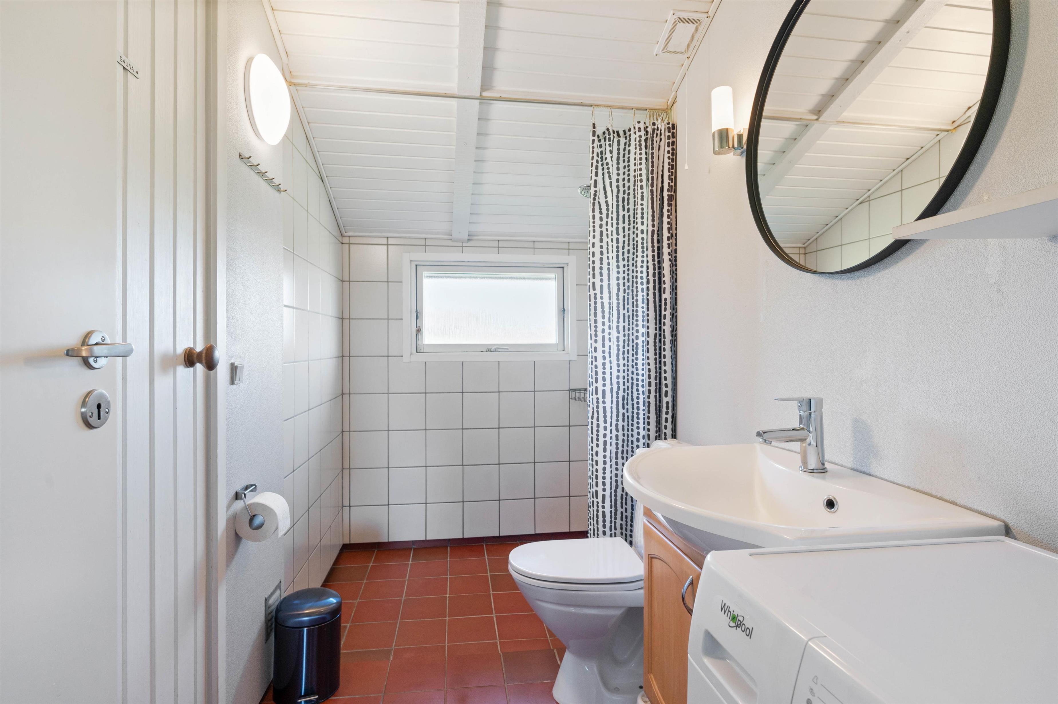 På sommerhusets badeværelse er der gulvvarme, og her finder I feriehusets sauna. Her er altså rig mulighed for afslapning og velvære i løbet af ferien. I feriehuset er der en vaskemaskine, så I har mulighed for at vaske tøj og håndklæder.