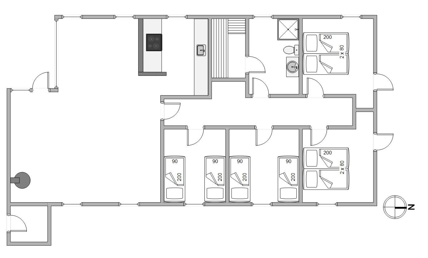 Sommerhuset har plads til op til 8 feriegæster, som til natten kan fordele sig på de 4 soveværelser. Heraf er 2 indrettet med dobbeltseng, mens de sidste værelser er indrettet med 2 enkeltsenge på hvert værelse.
