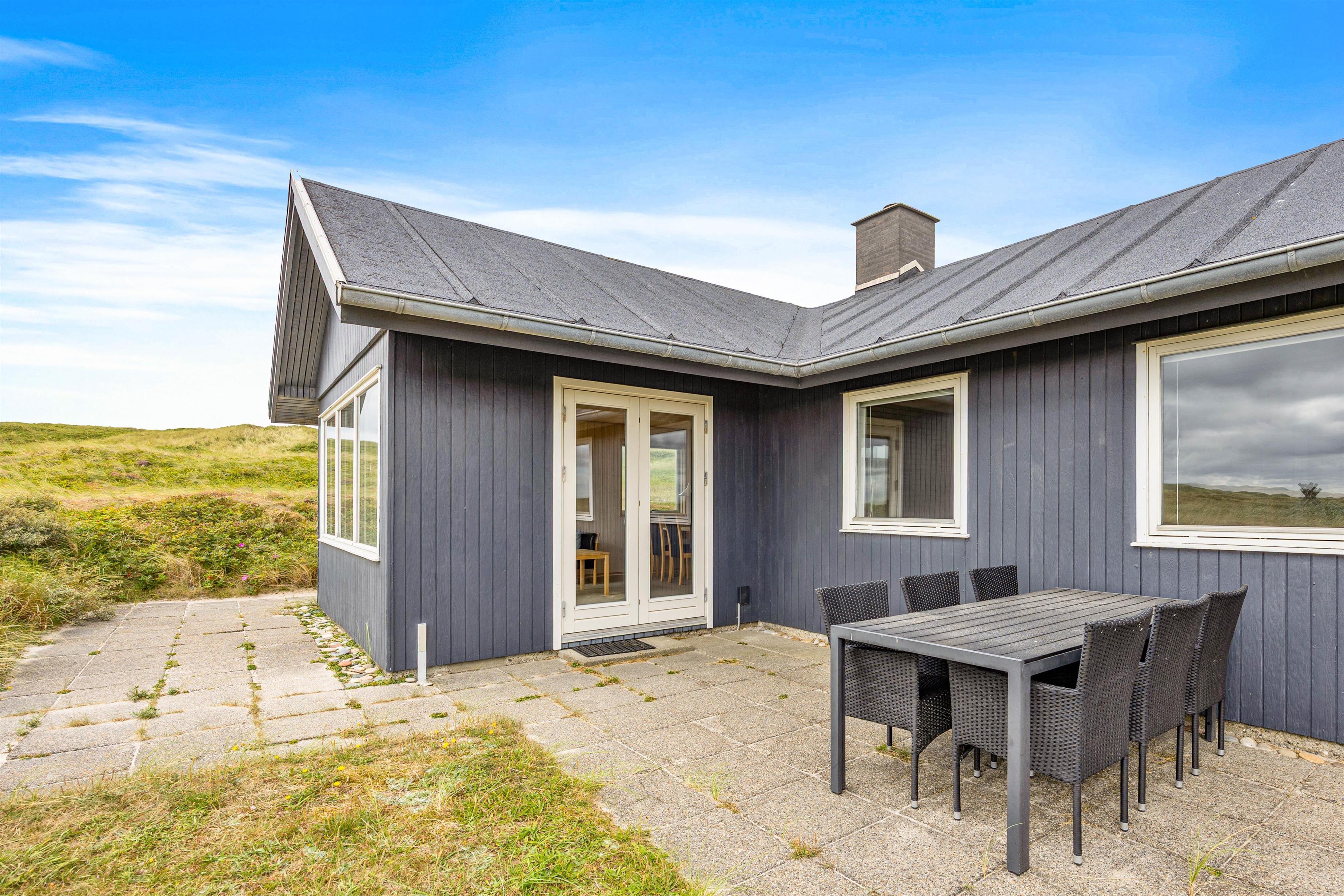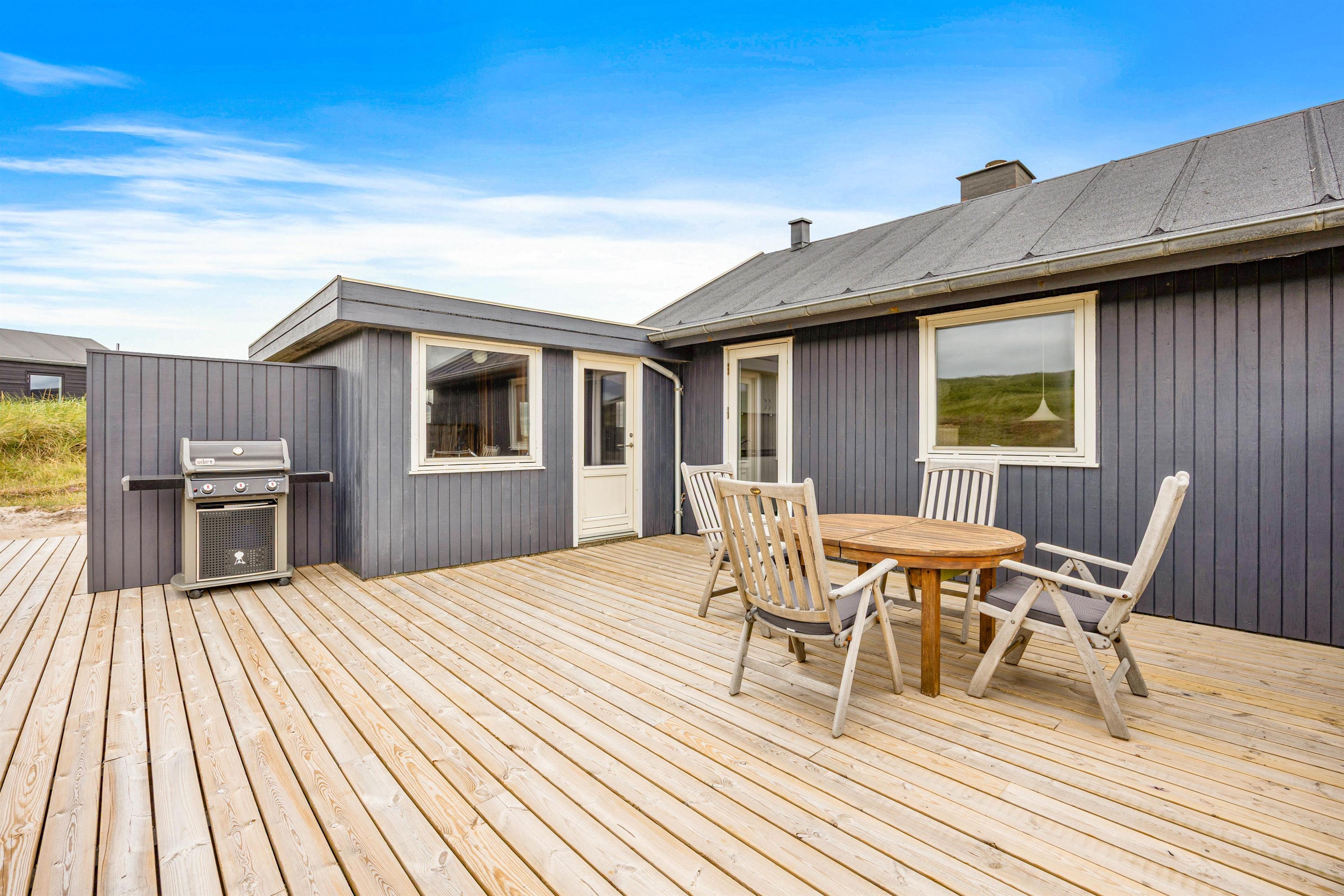 På feriehusets delvist afskærmede terrasse kan du finde en rolig plet til afslapning med en bog eller en kølig drink. Her er havemøbler, solvogne og parasol, så skulle I få lyst til en grillaften i den nedgående sol, er det også en oplagt mulighed. På den 1.750 kvadratmeter store naturgrund kan I udforske Vestkystens særegne plante- og dyreliv, og slappe helt af.