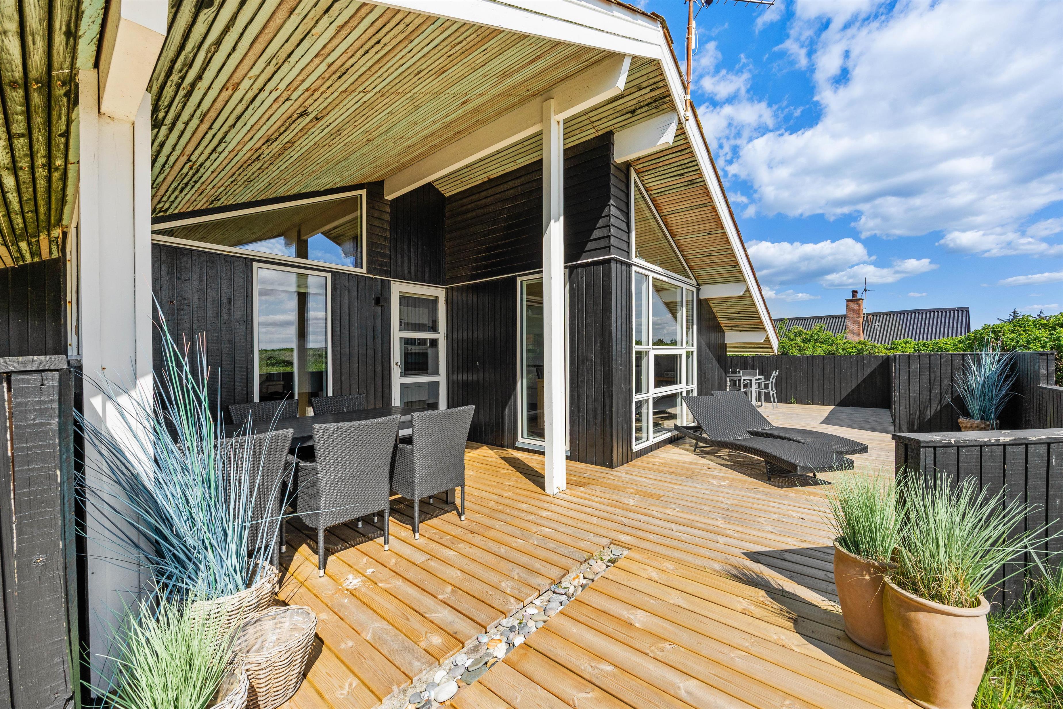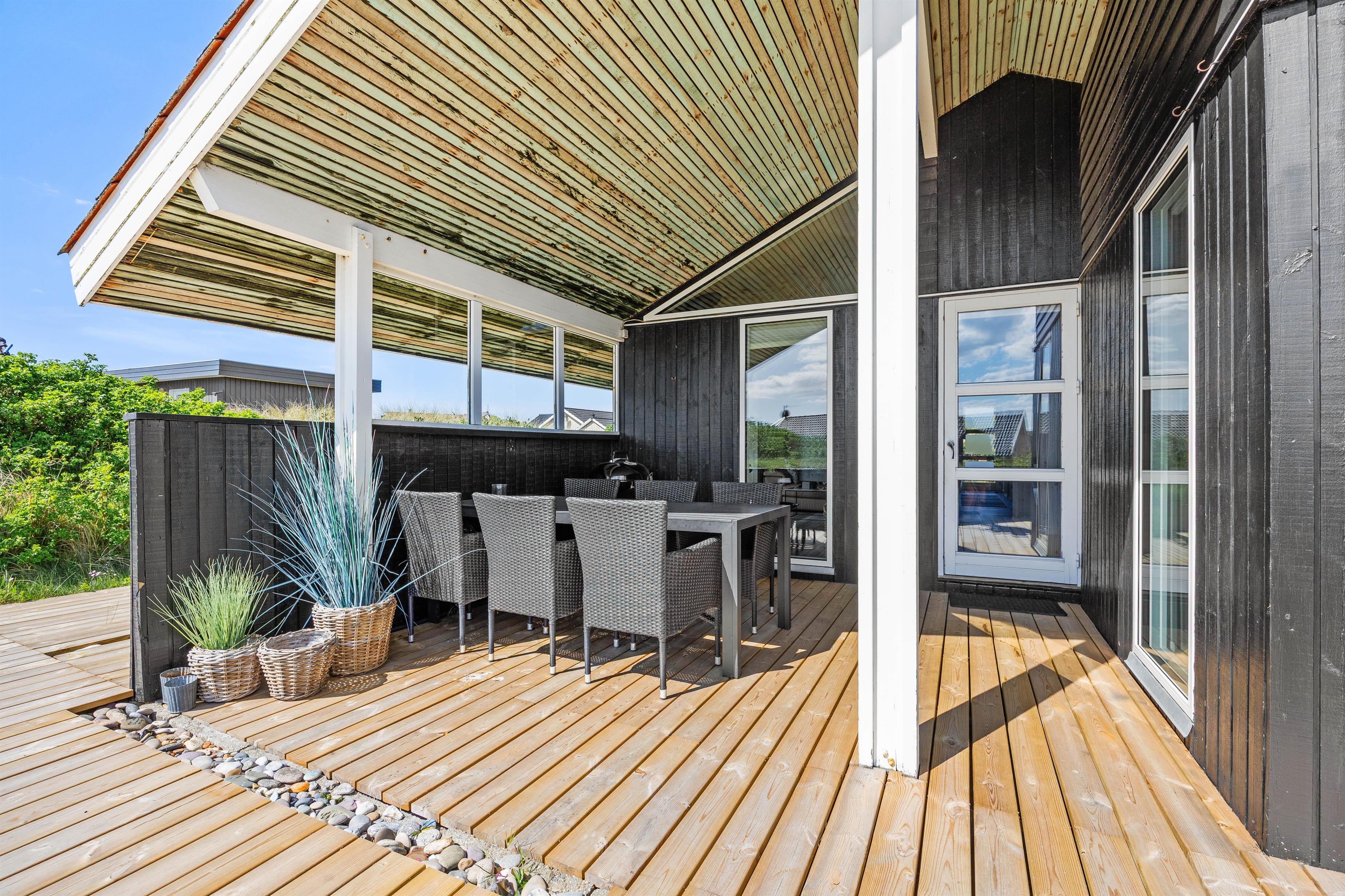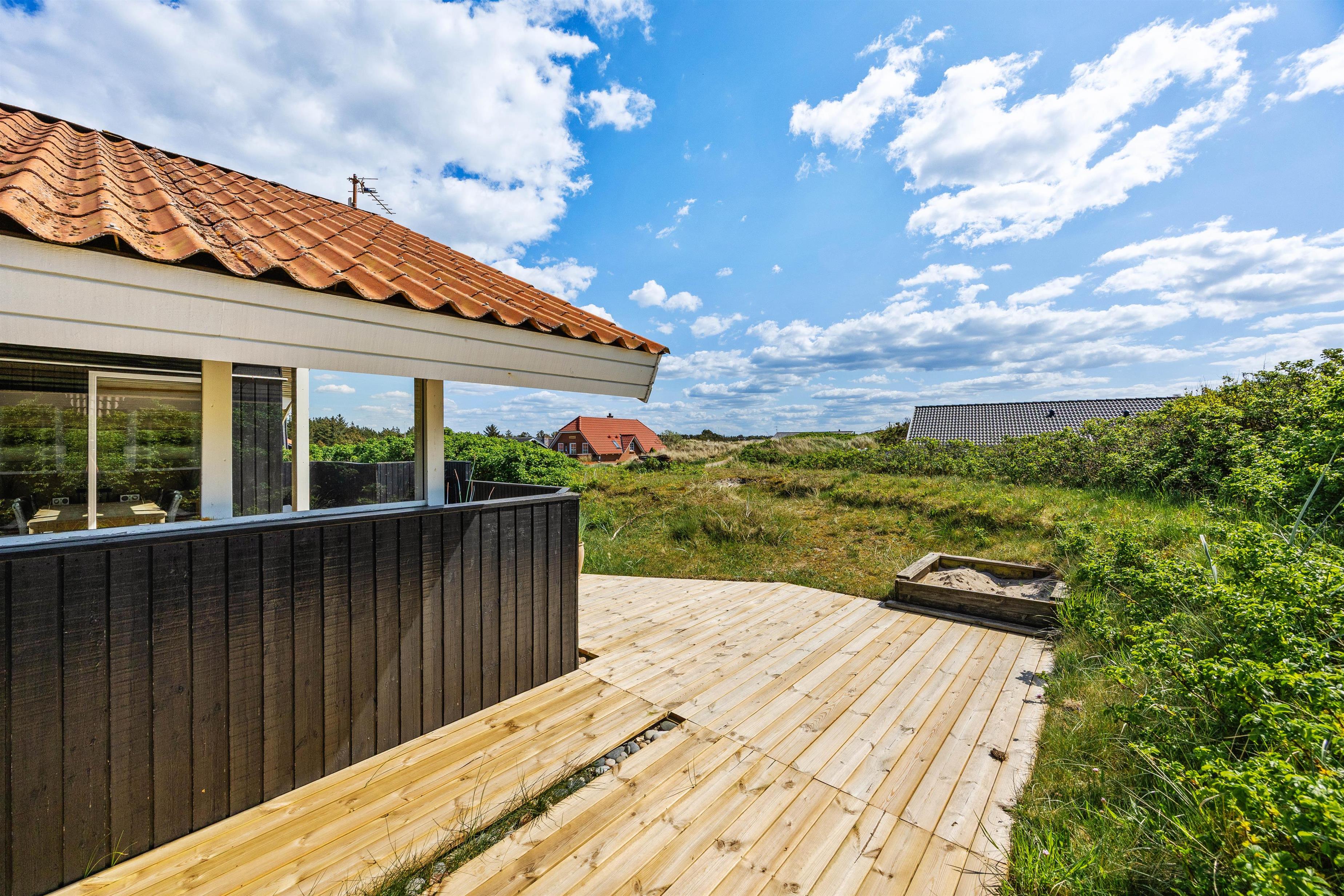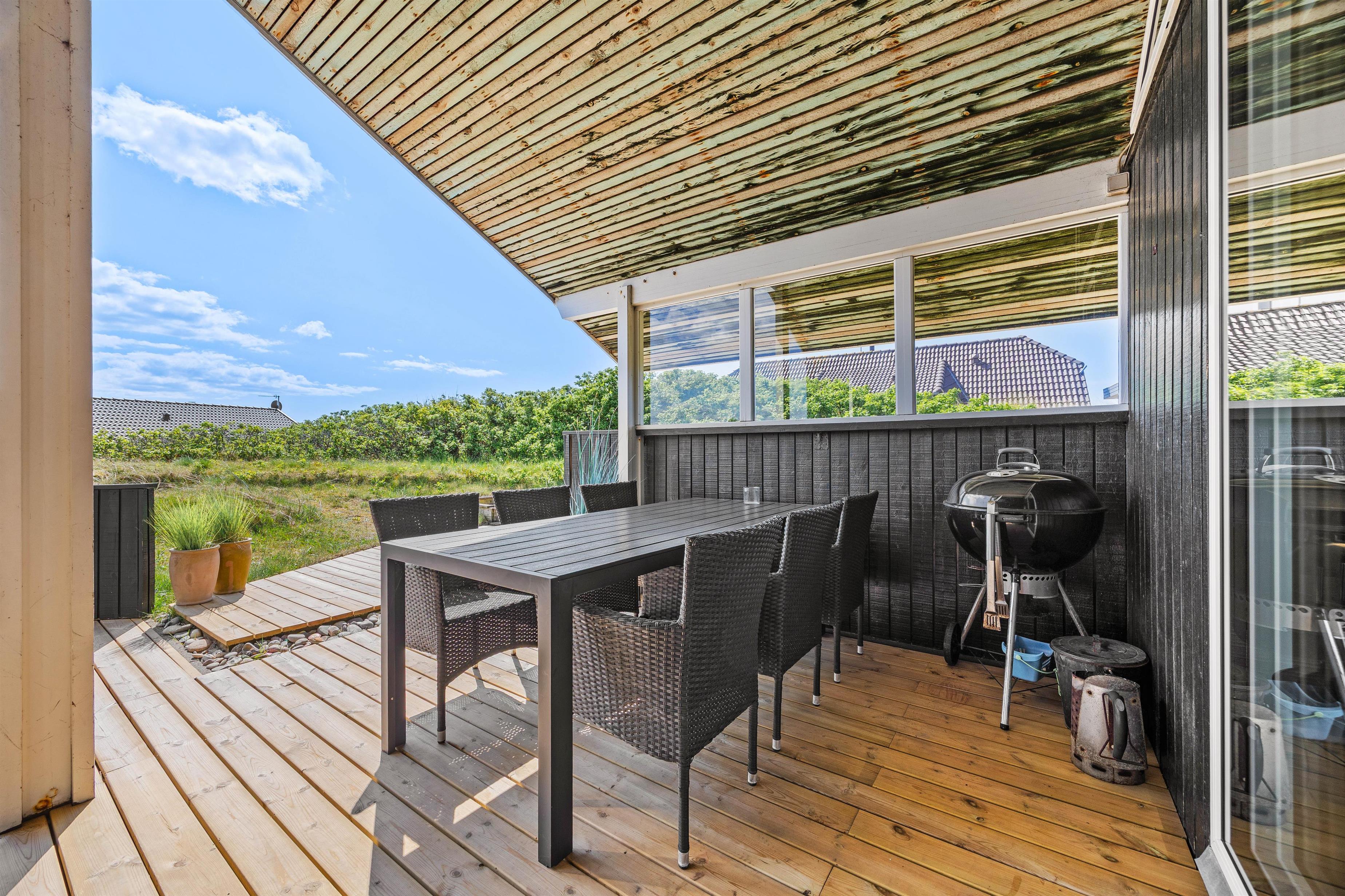 Med udgang fra stuen finder I feriehusets sydvestvendte terrasse. Udelivet kan nydes i mange afskygninger, da terrassen både er åben, overdækket og afskærmet, så der skulle være en krog for enhver smag, og de lange sommeraftener kan fortsat nydes efter duggens fald. De mindste er der også tænkt på i form af sandkasse, så de kan lege, mens de voksne slapper af på terrassen.