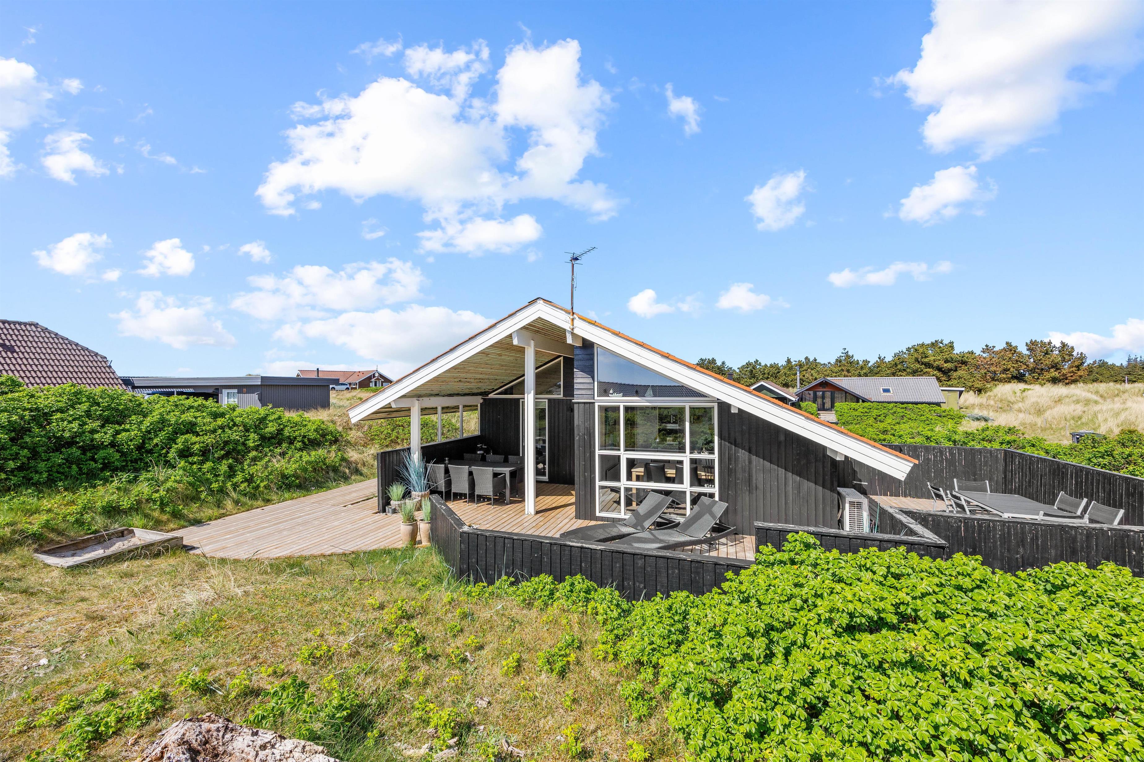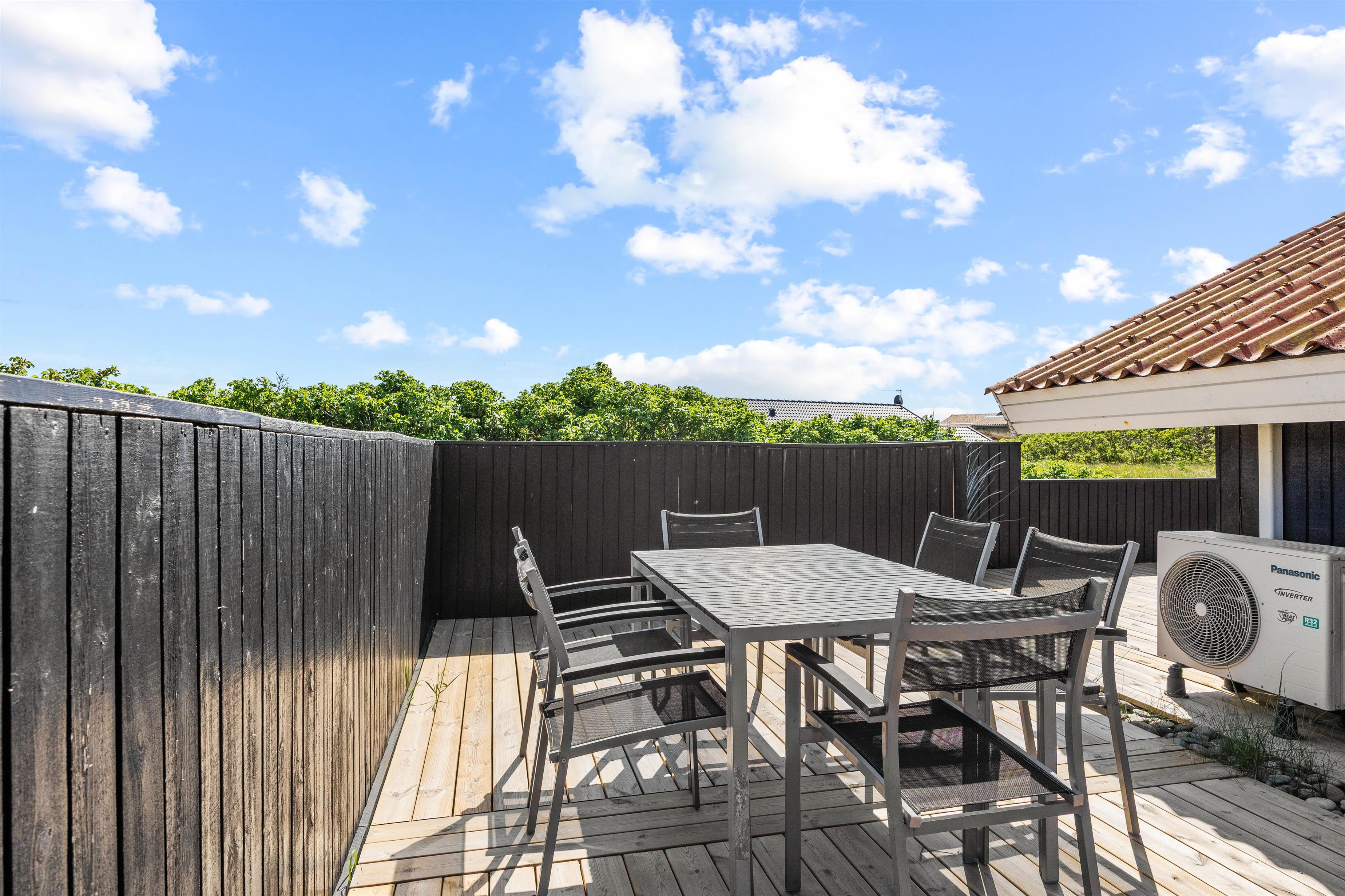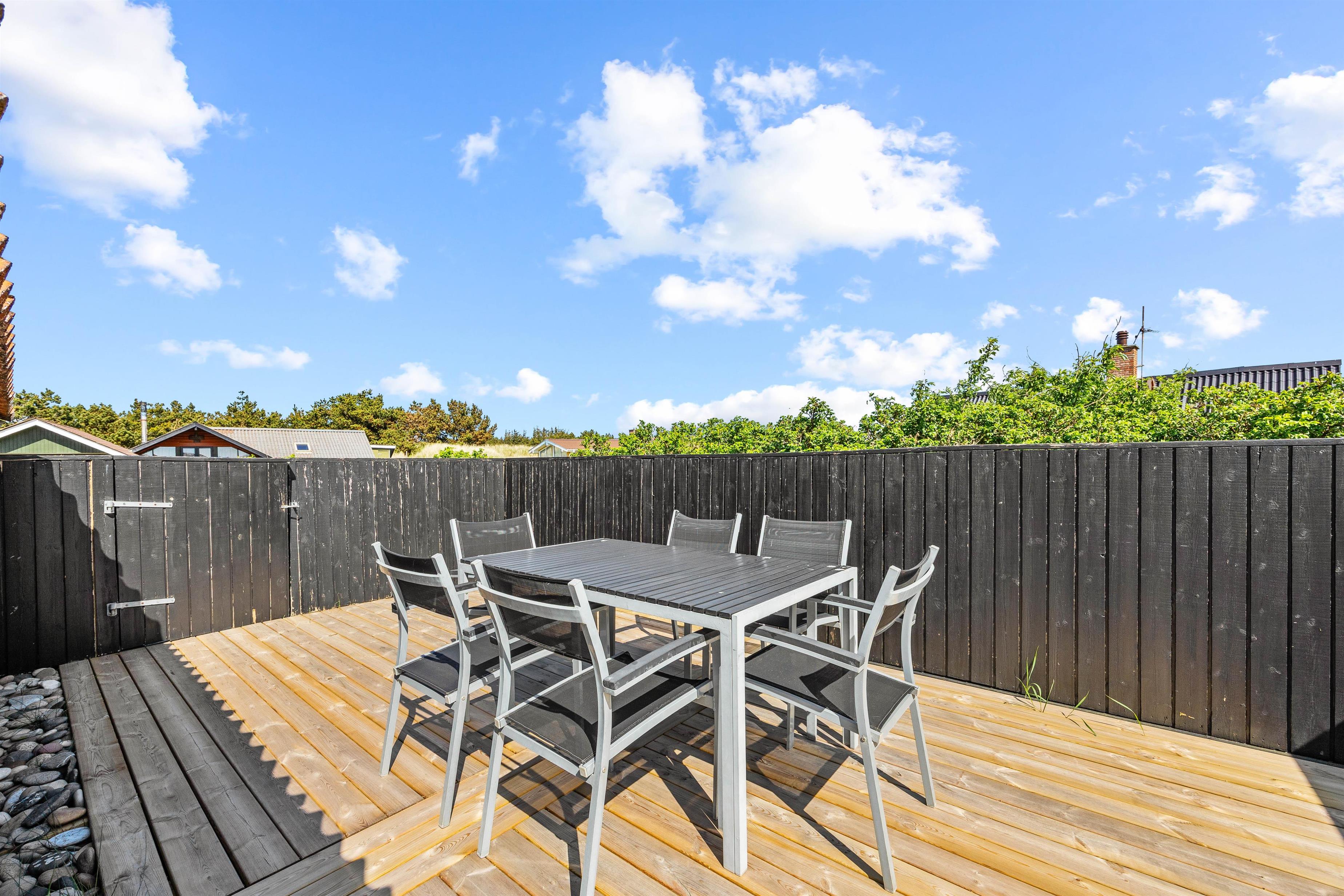 Med udgang fra stuen finder I feriehusets sydvestvendte terrasse. Udelivet kan nydes i mange afskygninger, da terrassen både er åben, overdækket og afskærmet, så der skulle være en krog for enhver smag, og de lange sommeraftener kan fortsat nydes efter duggens fald. De mindste er der også tænkt på i form af sandkasse, så de kan lege, mens de voksne slapper af på terrassen.