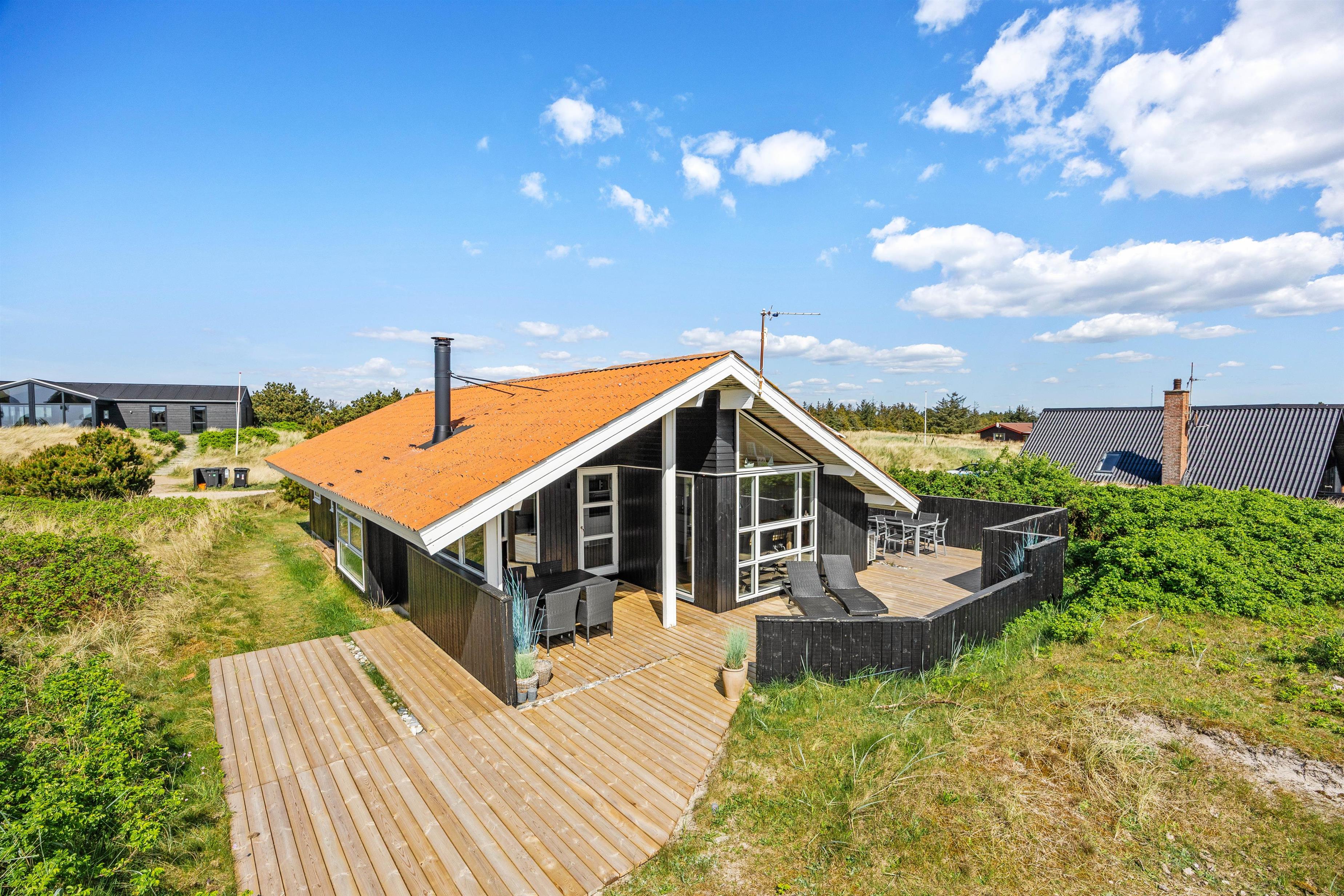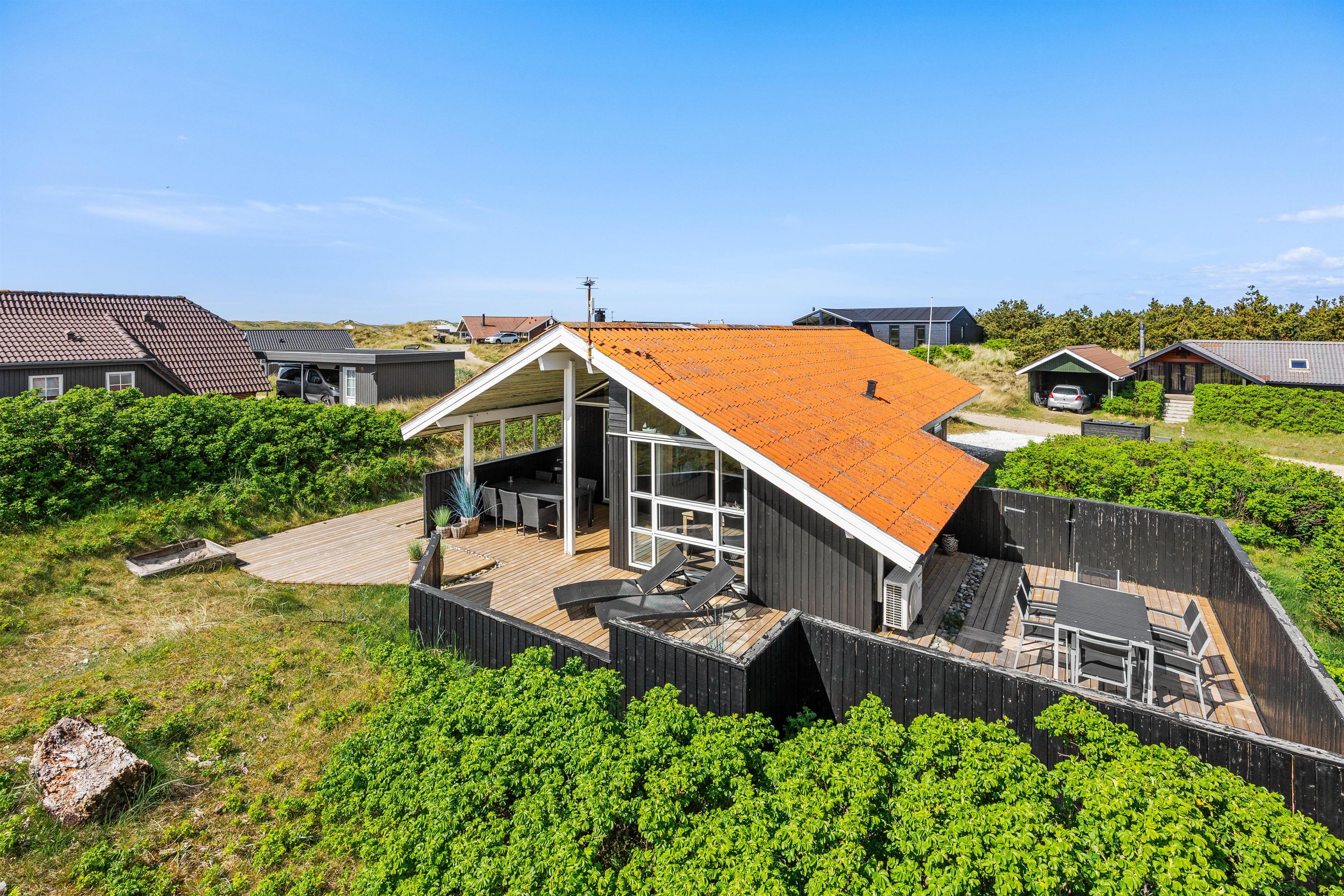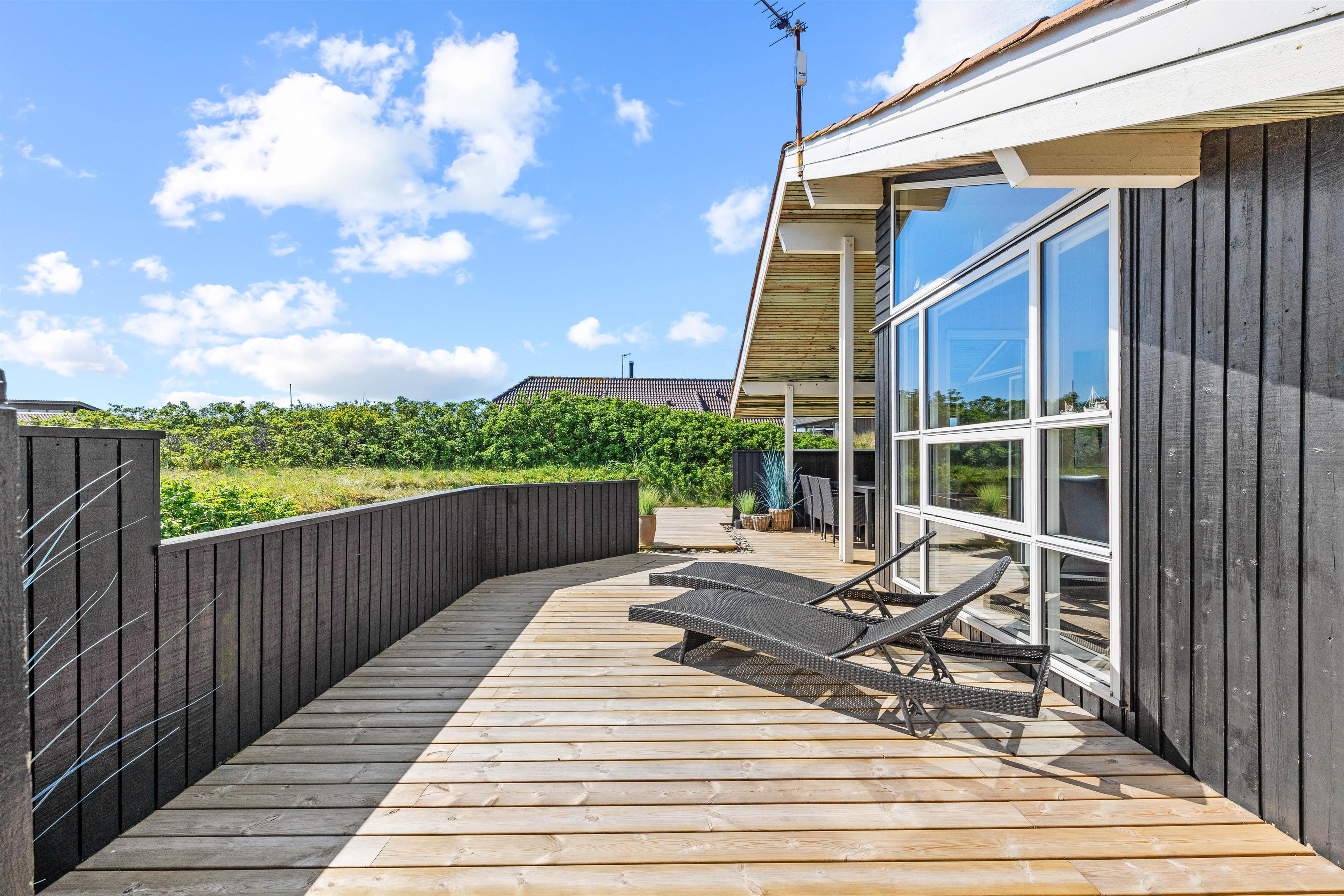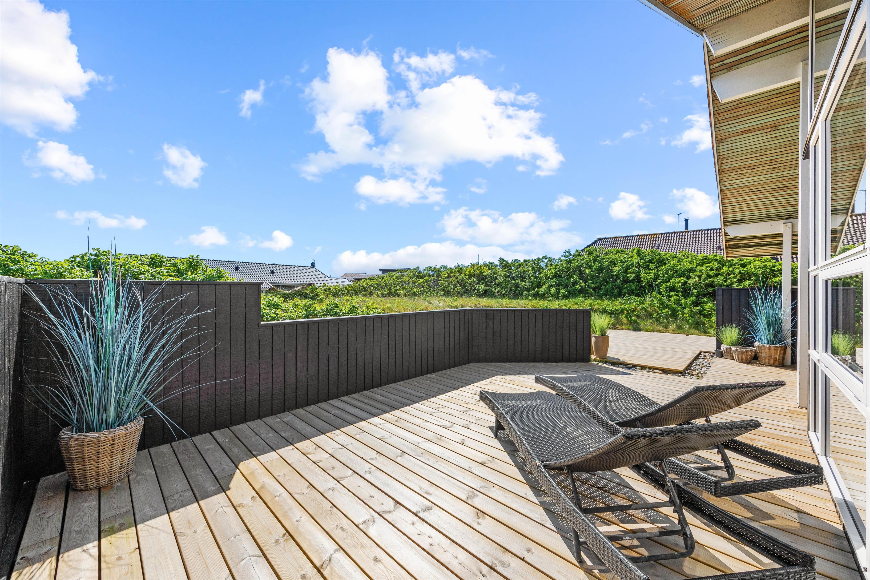 Med udgang fra stuen finder I feriehusets sydvestvendte terrasse. Udelivet kan nydes i mange afskygninger, da terrassen både er åben, overdækket og afskærmet, så der skulle være en krog for enhver smag, og de lange sommeraftener kan fortsat nydes efter duggens fald. De mindste er der også tænkt på i form af sandkasse, så de kan lege, mens de voksne slapper af på terrassen.