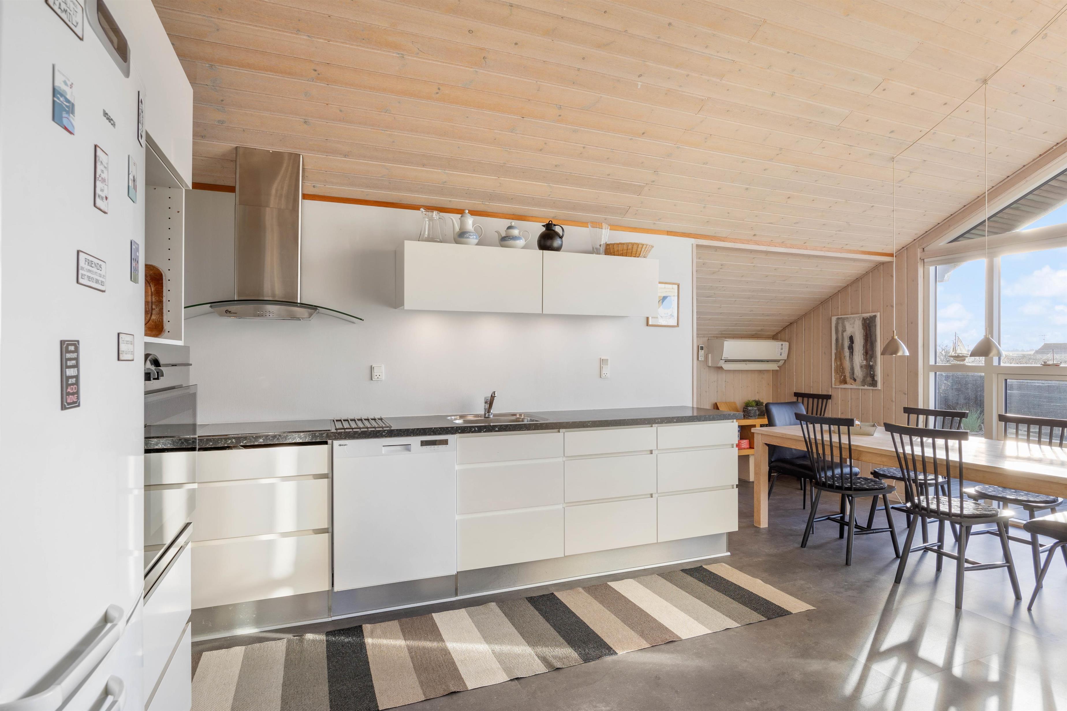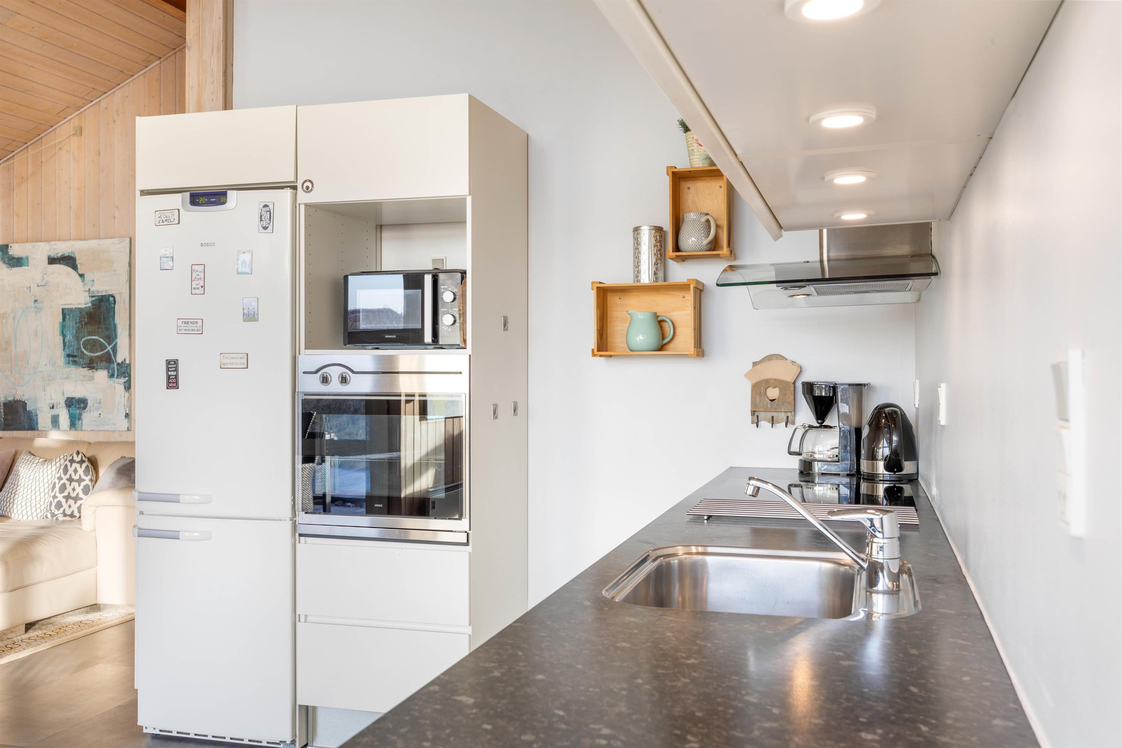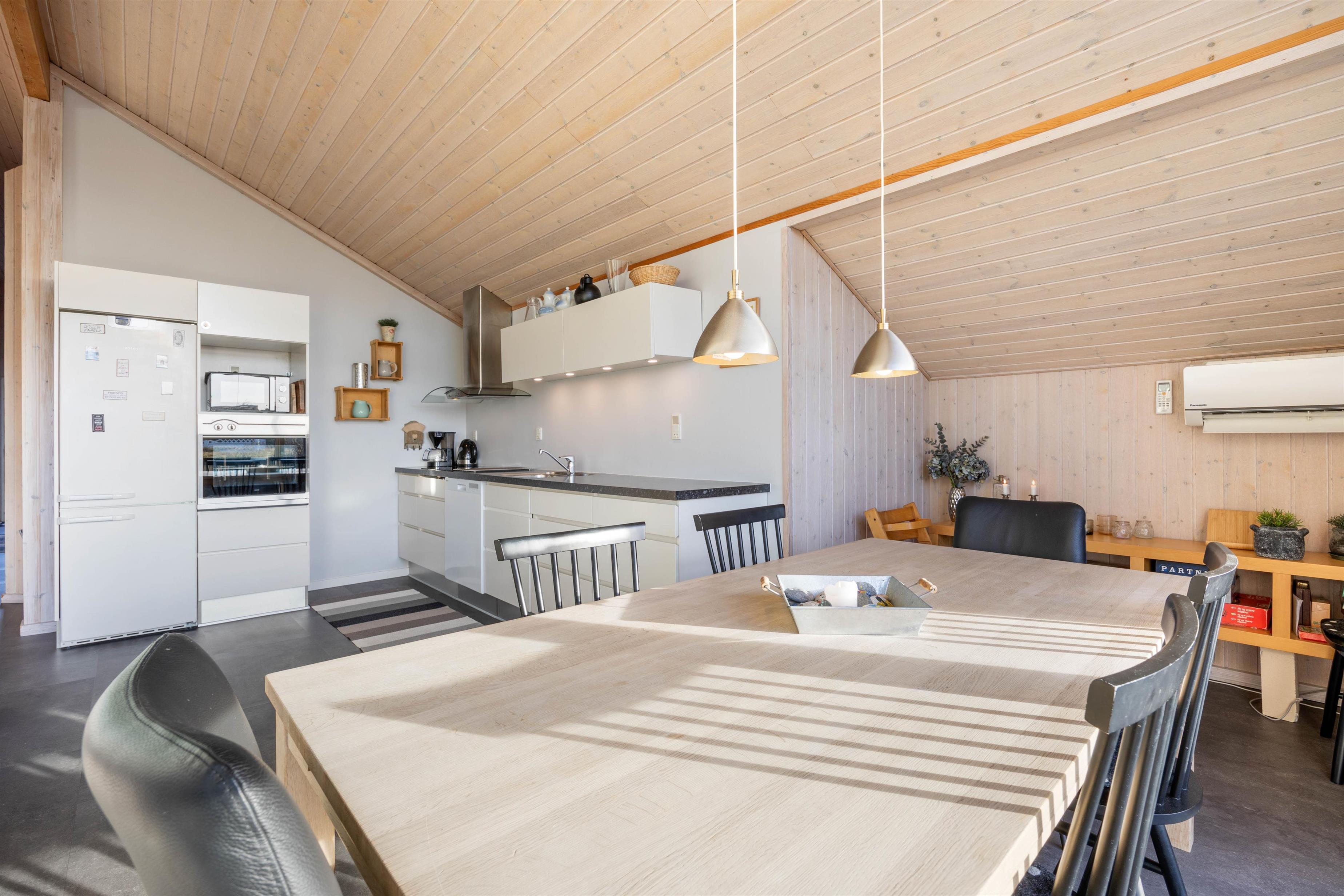 Sommerhuset er delvis renoveret i 2020. I køkkenet finder I opvaskemaskine, mikroovn og induktionskomfur – faciliteter, der letter køkkentjansen, så kokken også kan slappe af i ferien. Køkkenalrum og opholdsstue ligger i åben forbindelse, og herfra er der udgang til sydvestvendt terrasse.