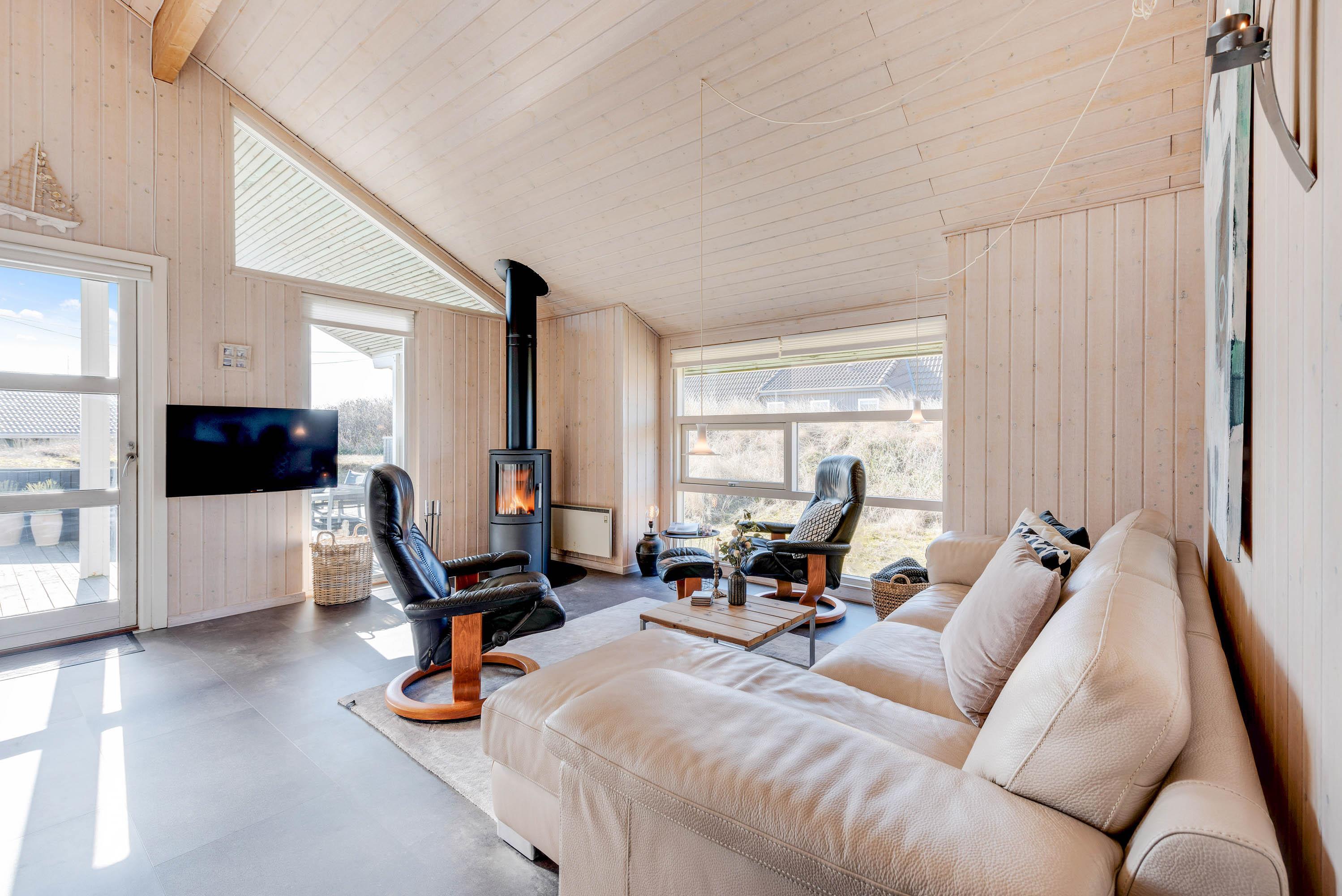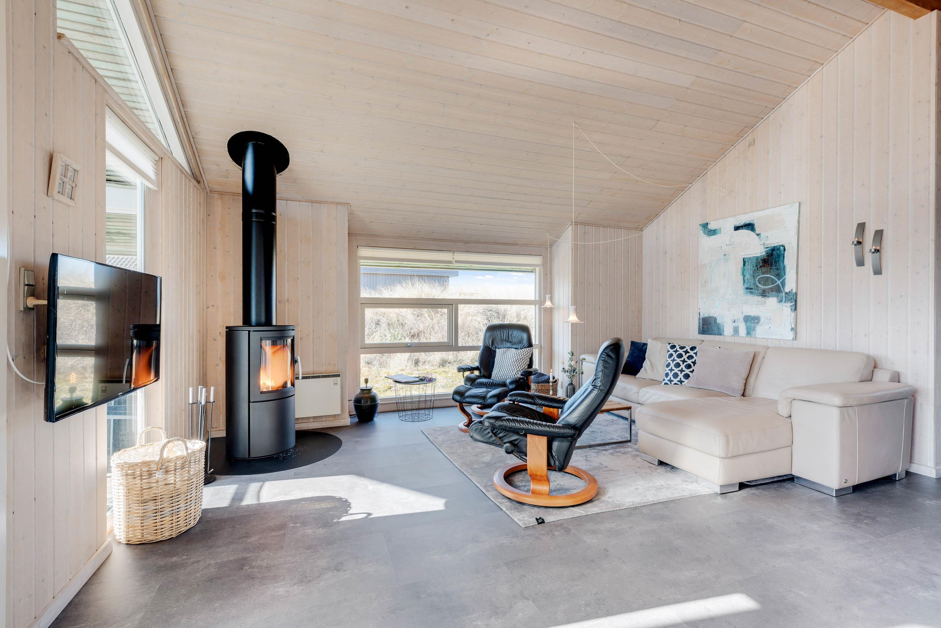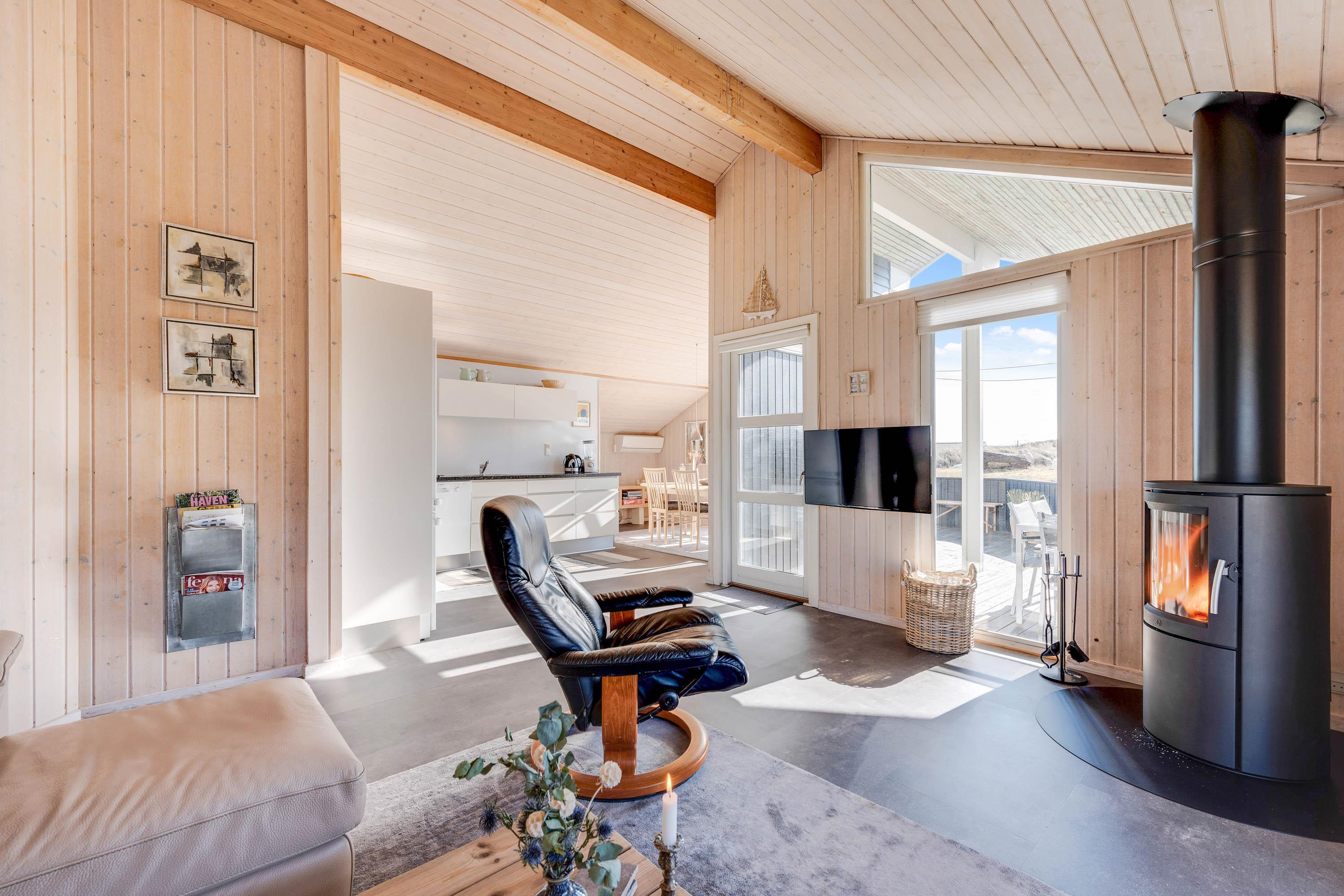 Centralt placeret i stuen finder I brændeovnen, der ud over hygge sørger for behagelig temperatur sammen med den miljøvenlige luft-til-luft varmepumpe.