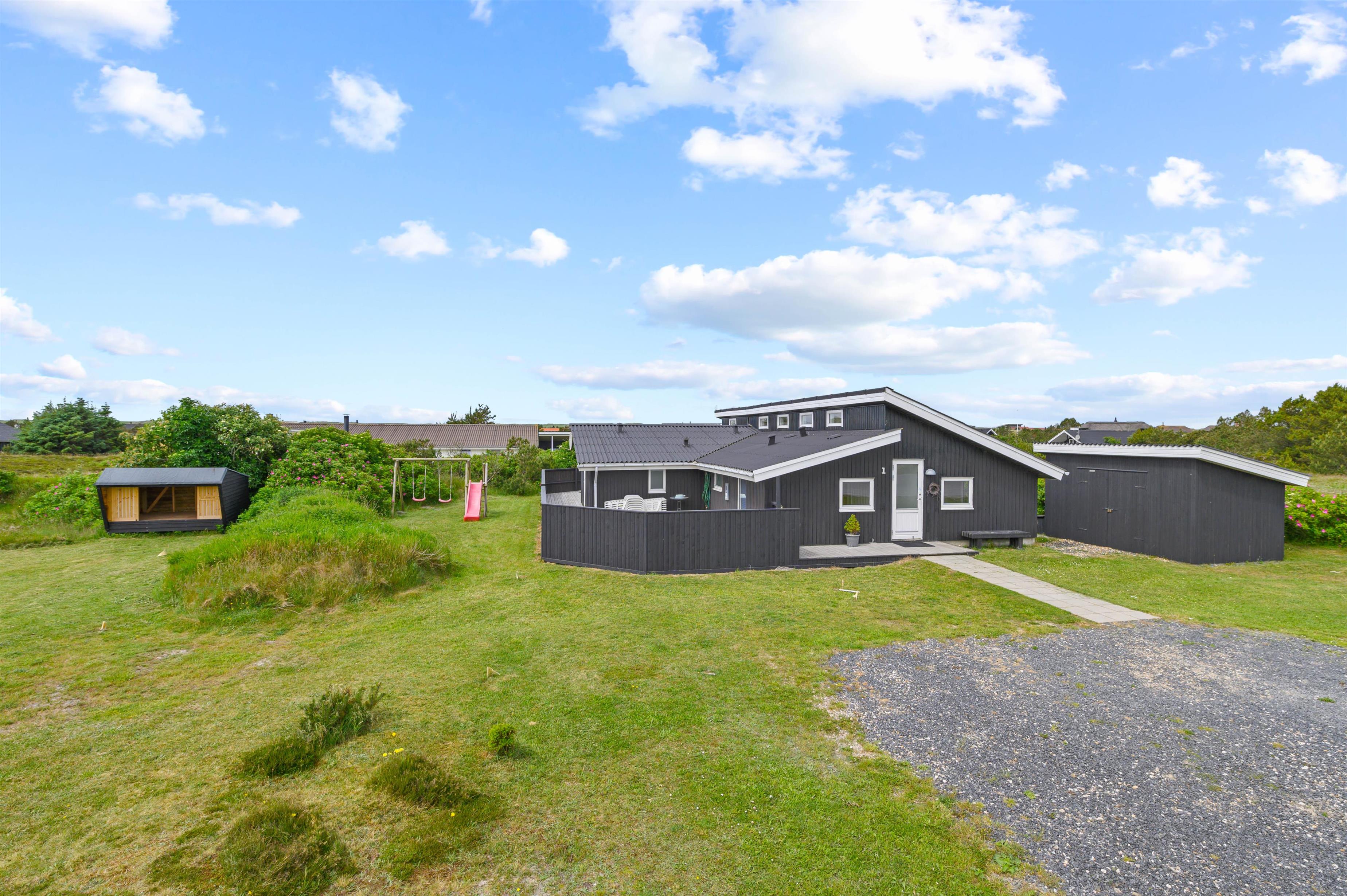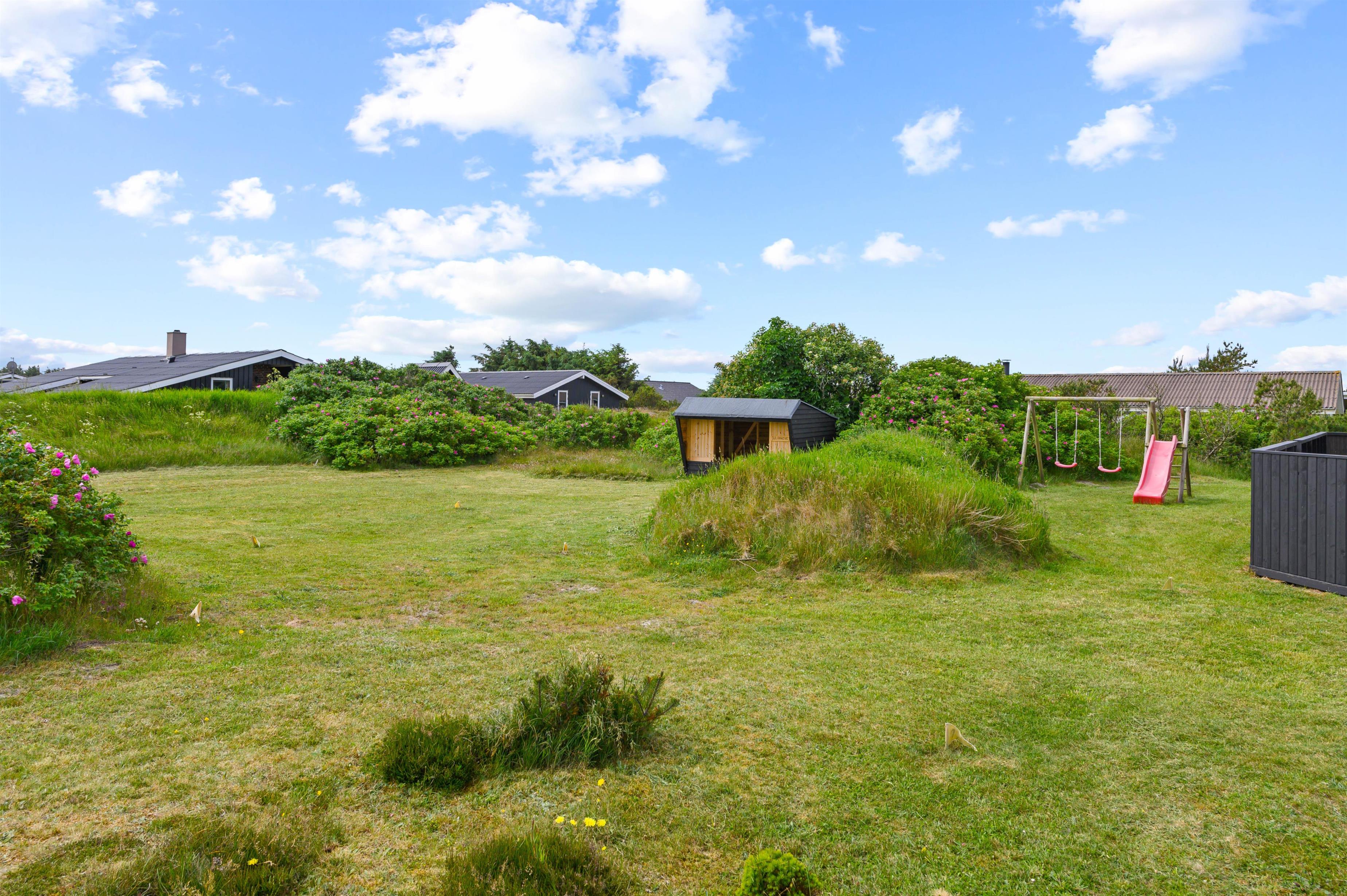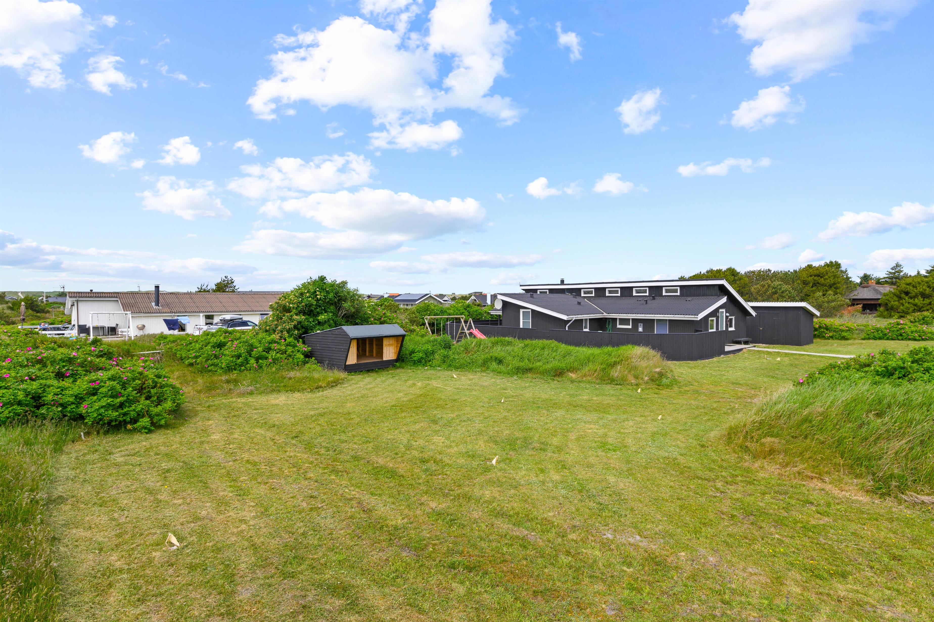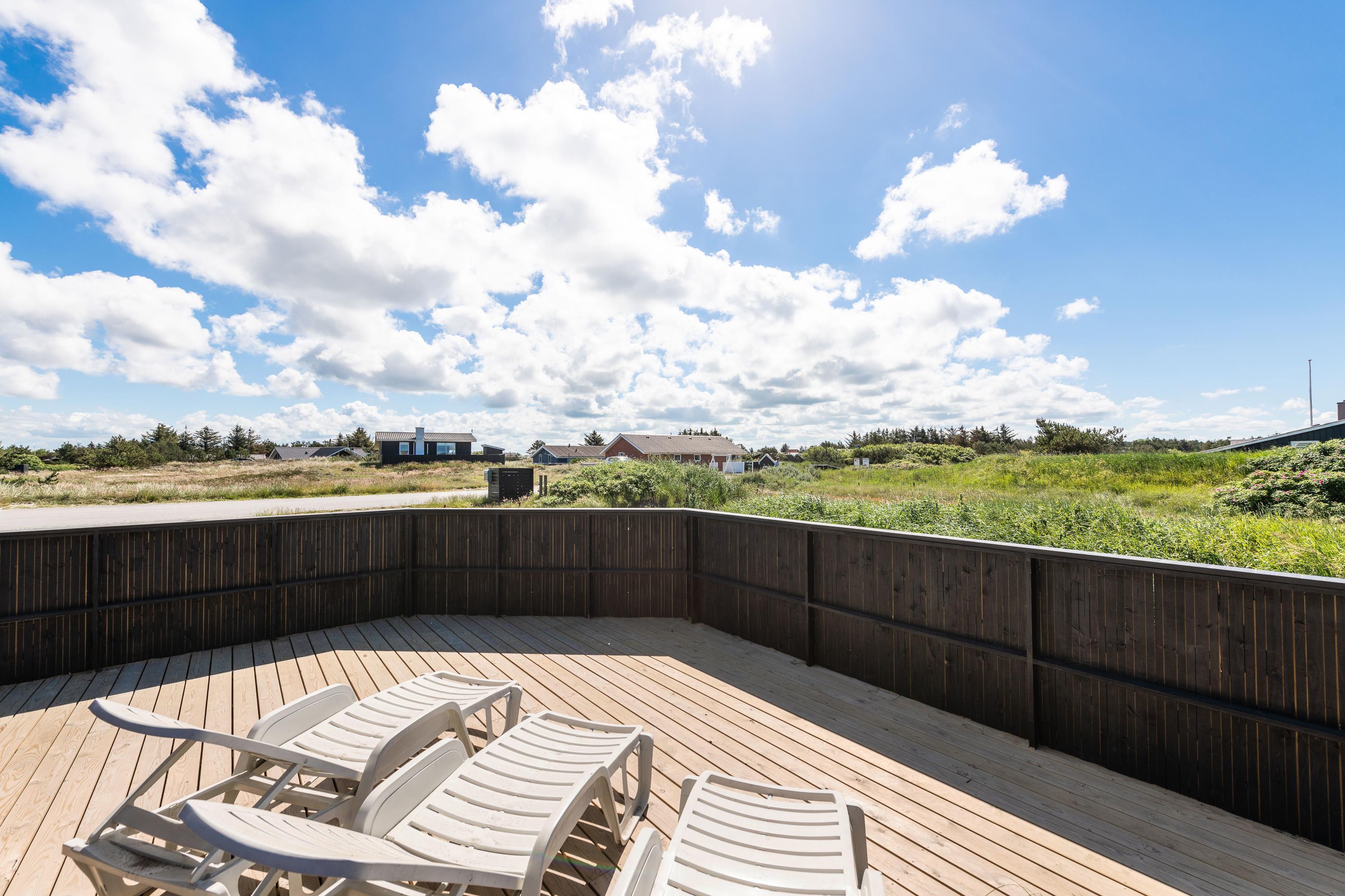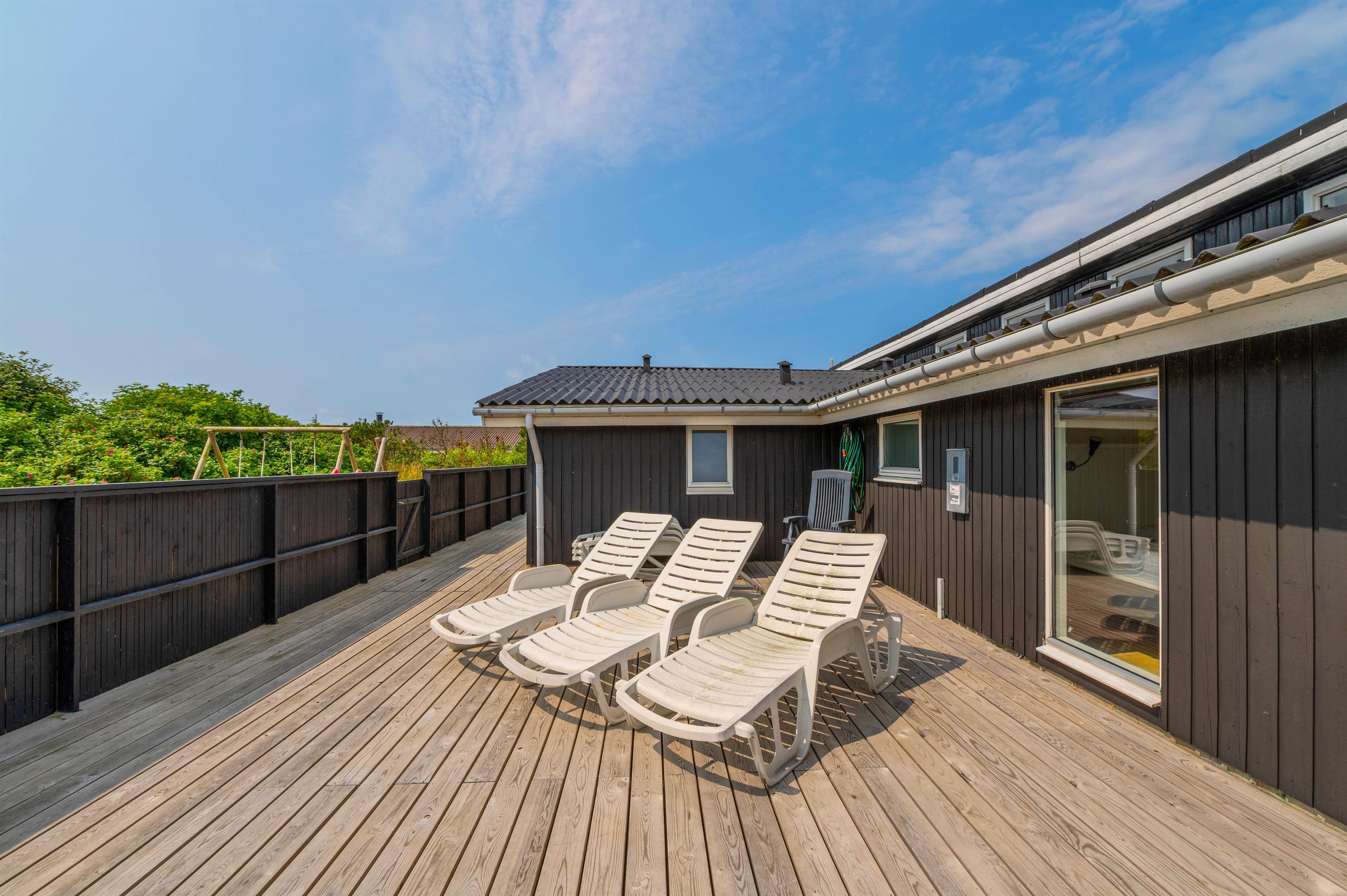 Sommerhuset er omgivet af en stor, lukket terrasse mod øst, syd og vest, hvor I nemt kan lade både børn og hunde lege frit. På terrassen finder I et vildmarksbad, hvor der kan sidde op til 6 personer og måske nyde en stjerneklar aften nede fra det varme vand og med Vesterhavets brusen i baggrunden.