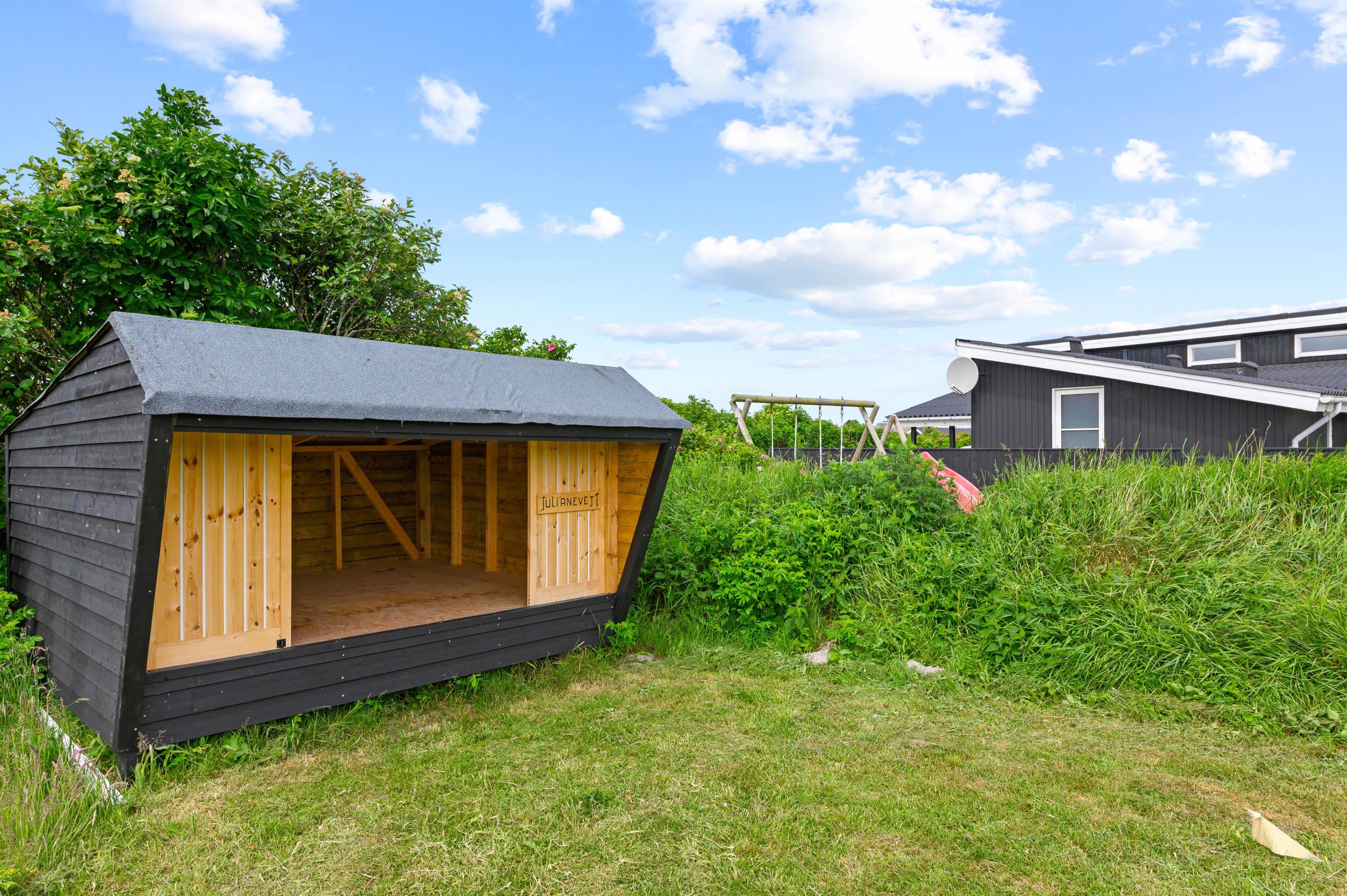 Som et ekstra plus er der en fin shelter ved sommerhuset, hvor I kan sove på en lun sommernat og vågne op til fuglenes kvidren.