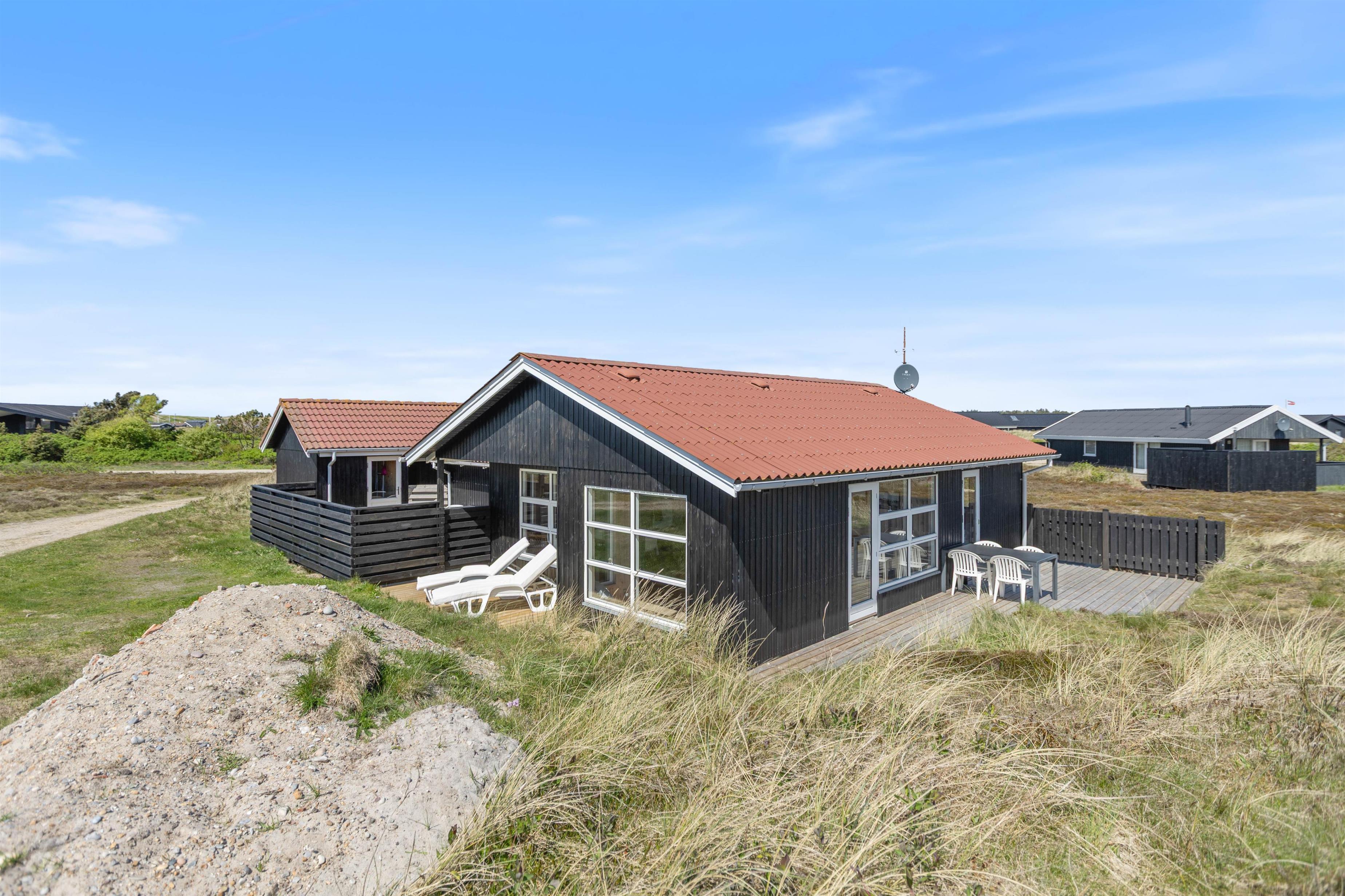 Feriehuset har flere terrasser omkring sommerhuset. Her kan I spise morgenmad på den østlige terrasse om morgenen og starte grillen på den vestlige terrasse om aftenen, hvorfra I kan se solnedgangen bag klitterne. På terrassen er der rig mulighed for at finde læ, da terrassen både er afskærmet og delvist overdækket.