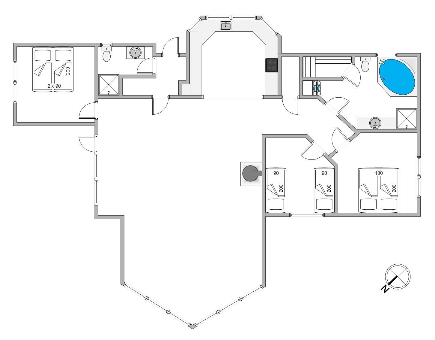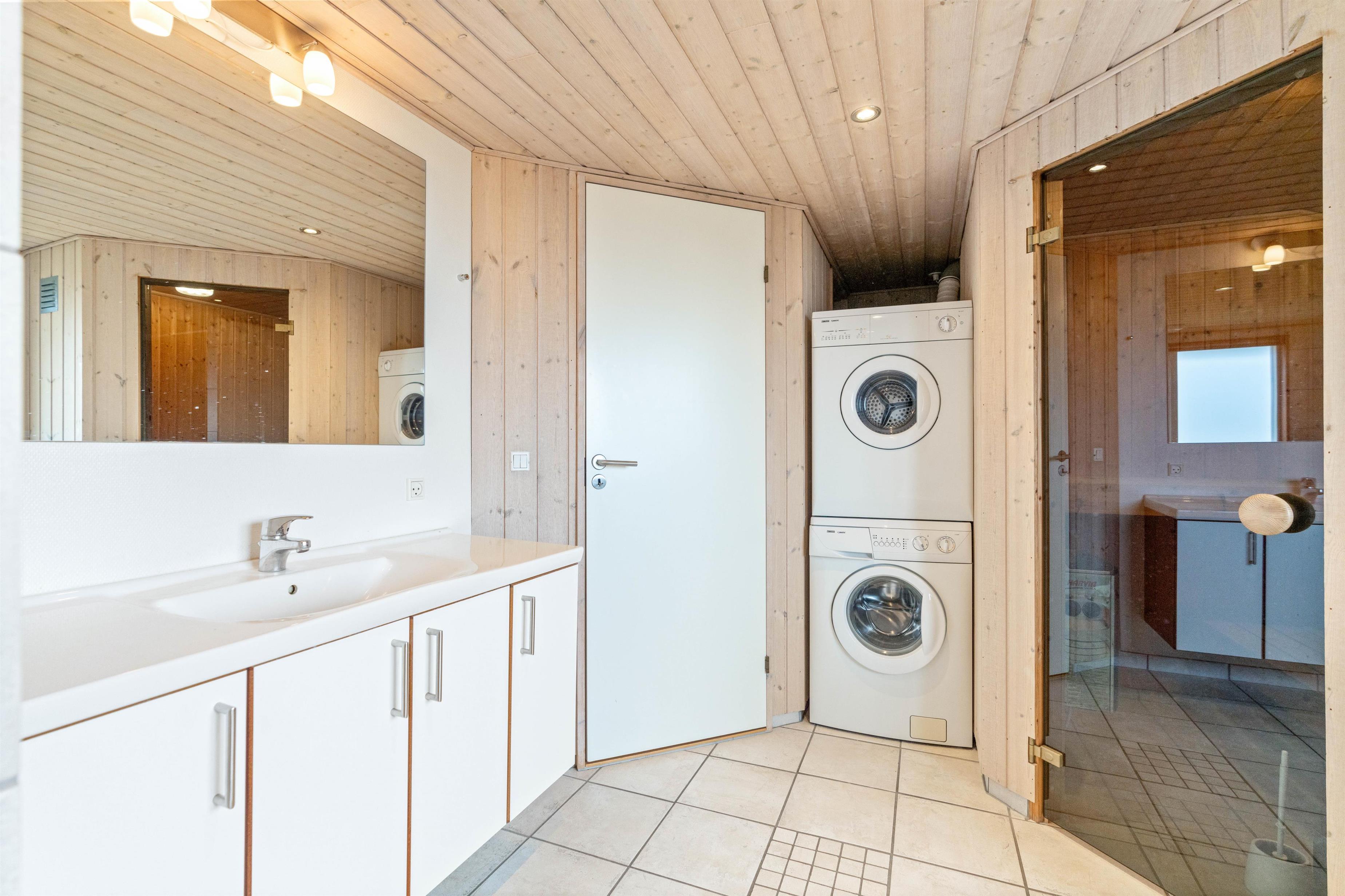 Derudover er der 3 soveværelser, 2 af værelserne er med dobbeltsenge og det sidste med 2 enkelt senge. Der er 2 badeværelser med bruseniche og gulvvarme. Det store badeværelse har desuden spabad og en sauna, så I har god mulighed for velvære og afslapning i løbet af ferien. Desuden er der både vaskemaskine samt tørretumbler i feriehuset, så I kan vaske lidt håndklæder.