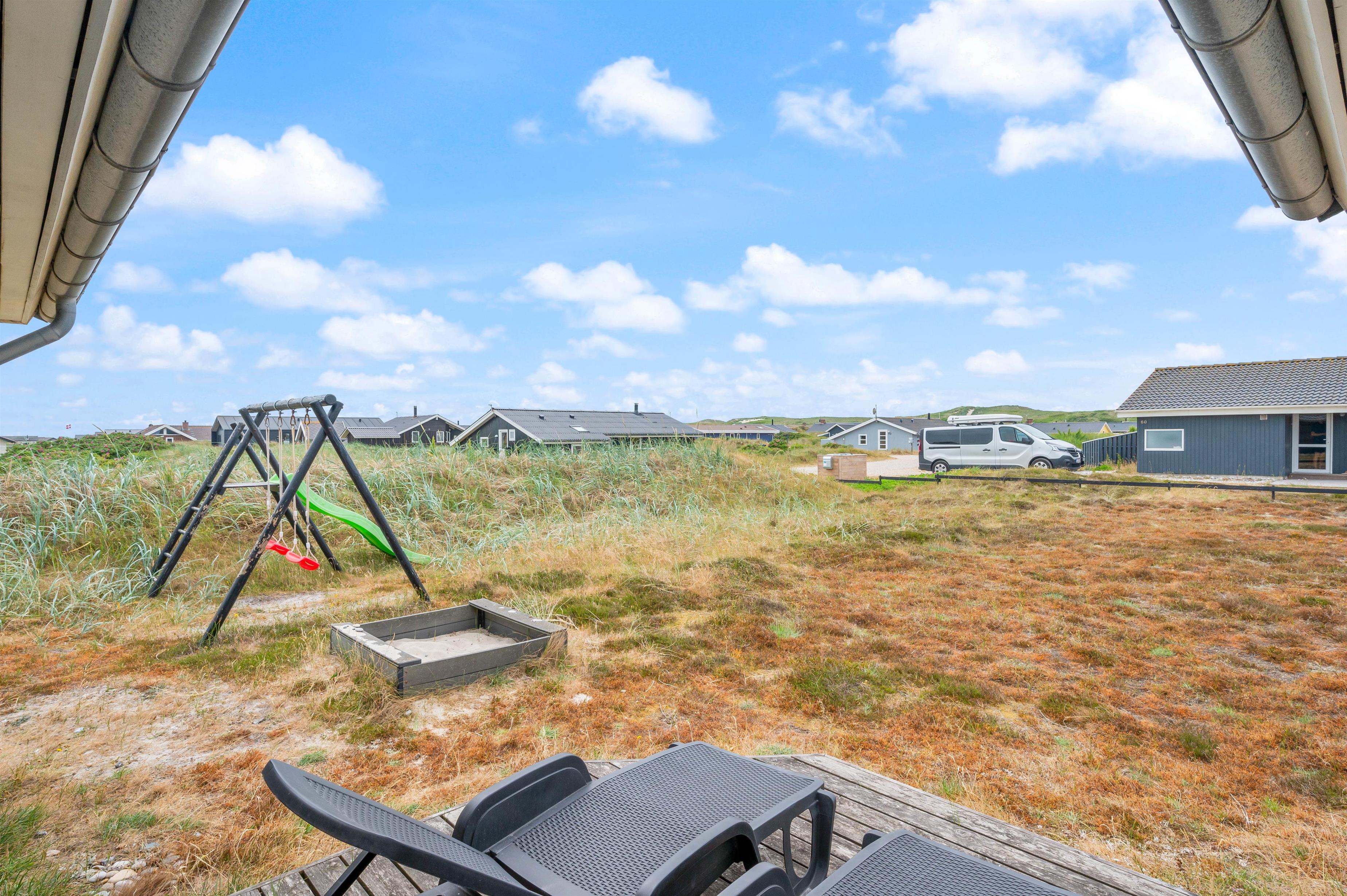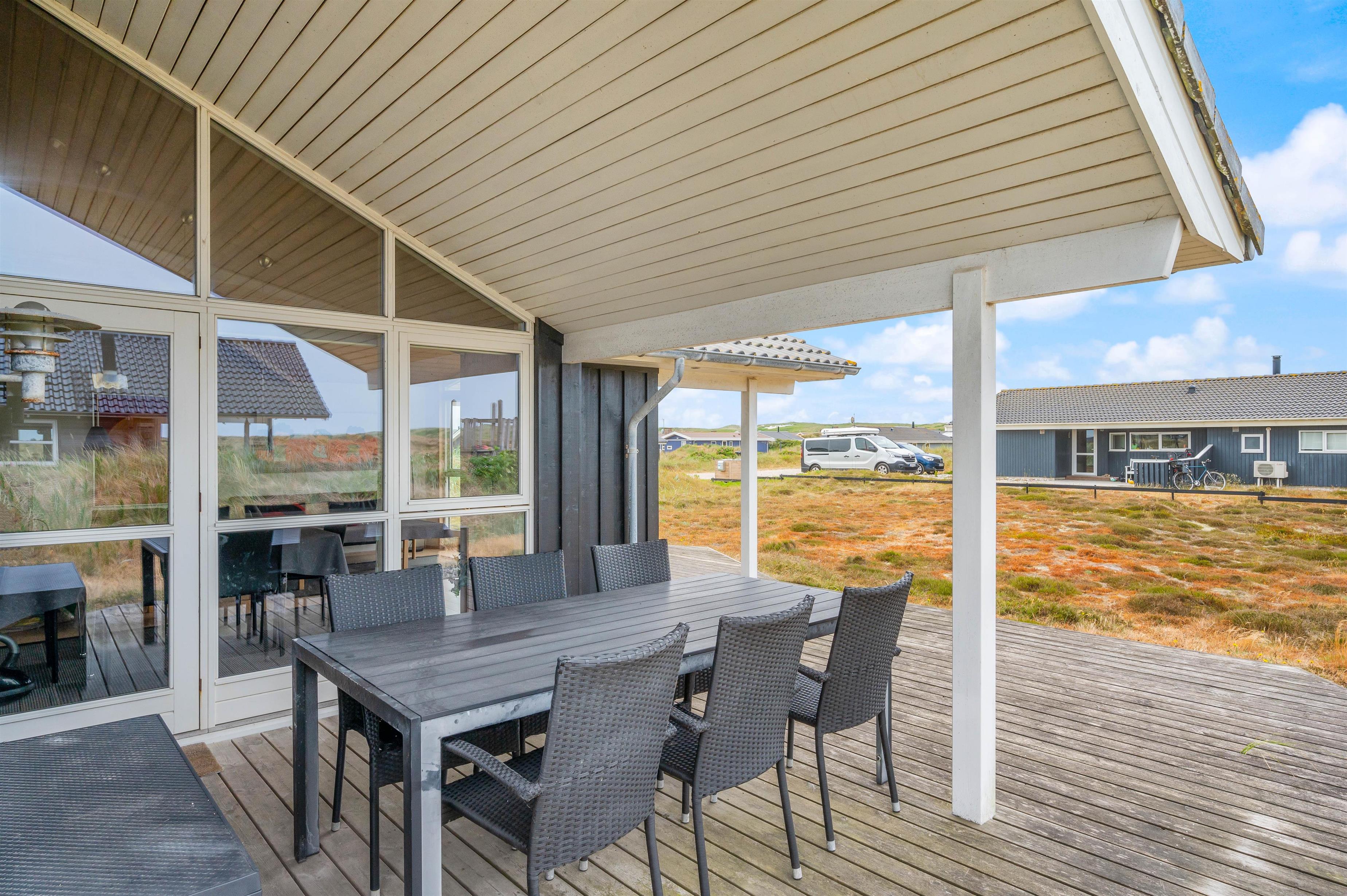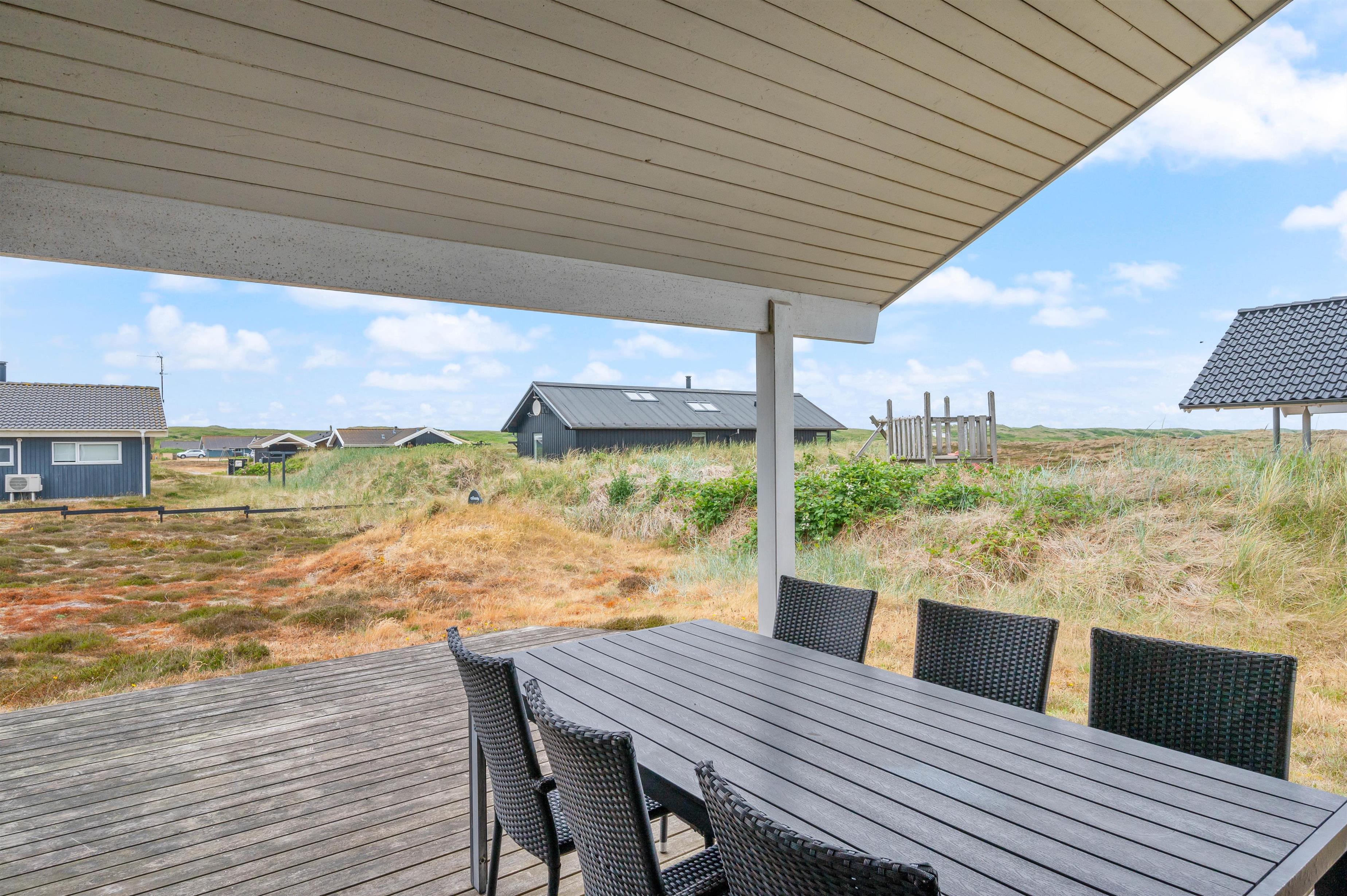 Der er terrasser på 3 sider af feriehuset. En sammenhængende træterrasse mod nord og mod vest, hvor de begge er delvist overdækkede. Derudover er der en god terrasse mod øst, som er læfyldt placeret mellem hus og udhus og derfor ideel på dage med meget vind. En god feriedag skal naturligvis afsluttes med grillhygge på terrassen. Mens bøfferne grilles, kan familiens yngste benytte sig af sommerhusets sandkasse og gyngestativ.