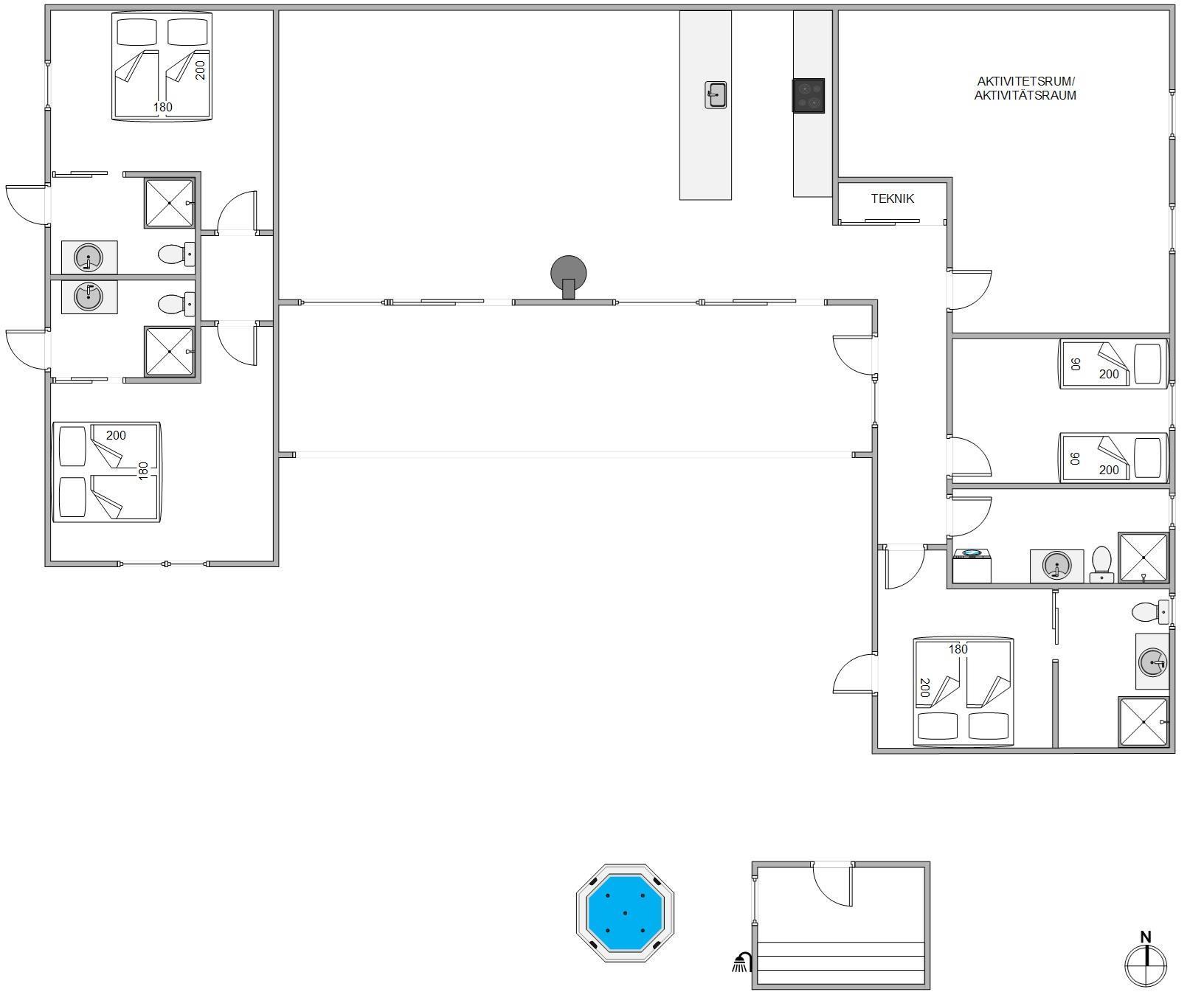 Der er i den grad dømt luksusferie i dette skønne aktivitetshus. Den store, delvist overdækkede terrasse er i sig selv et wellness-mekka med et udendørs spabad med plads til alle. Efter en afslappende stund i den varme jacuzzi kan I få en kold skyller under den udendørs bruser.