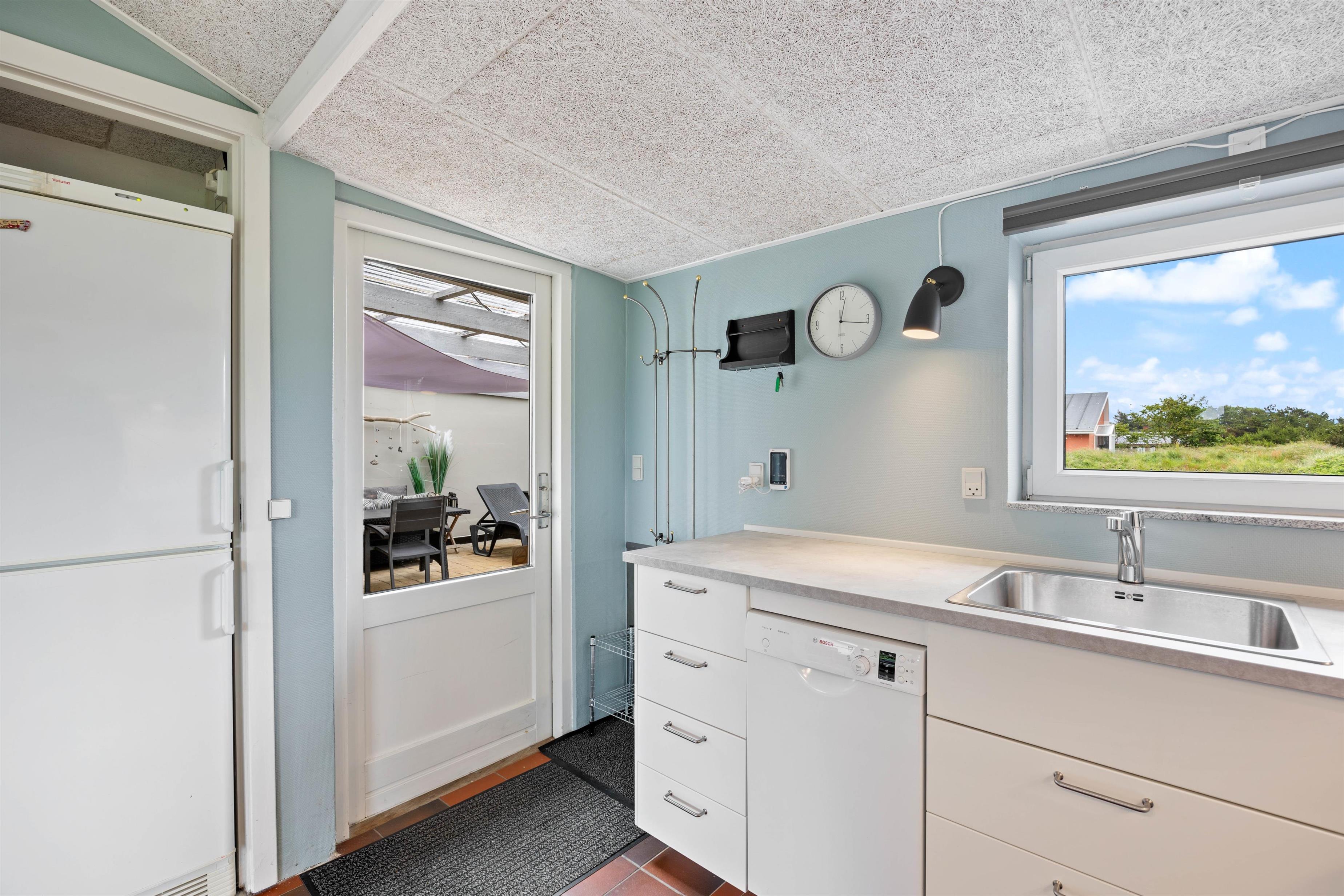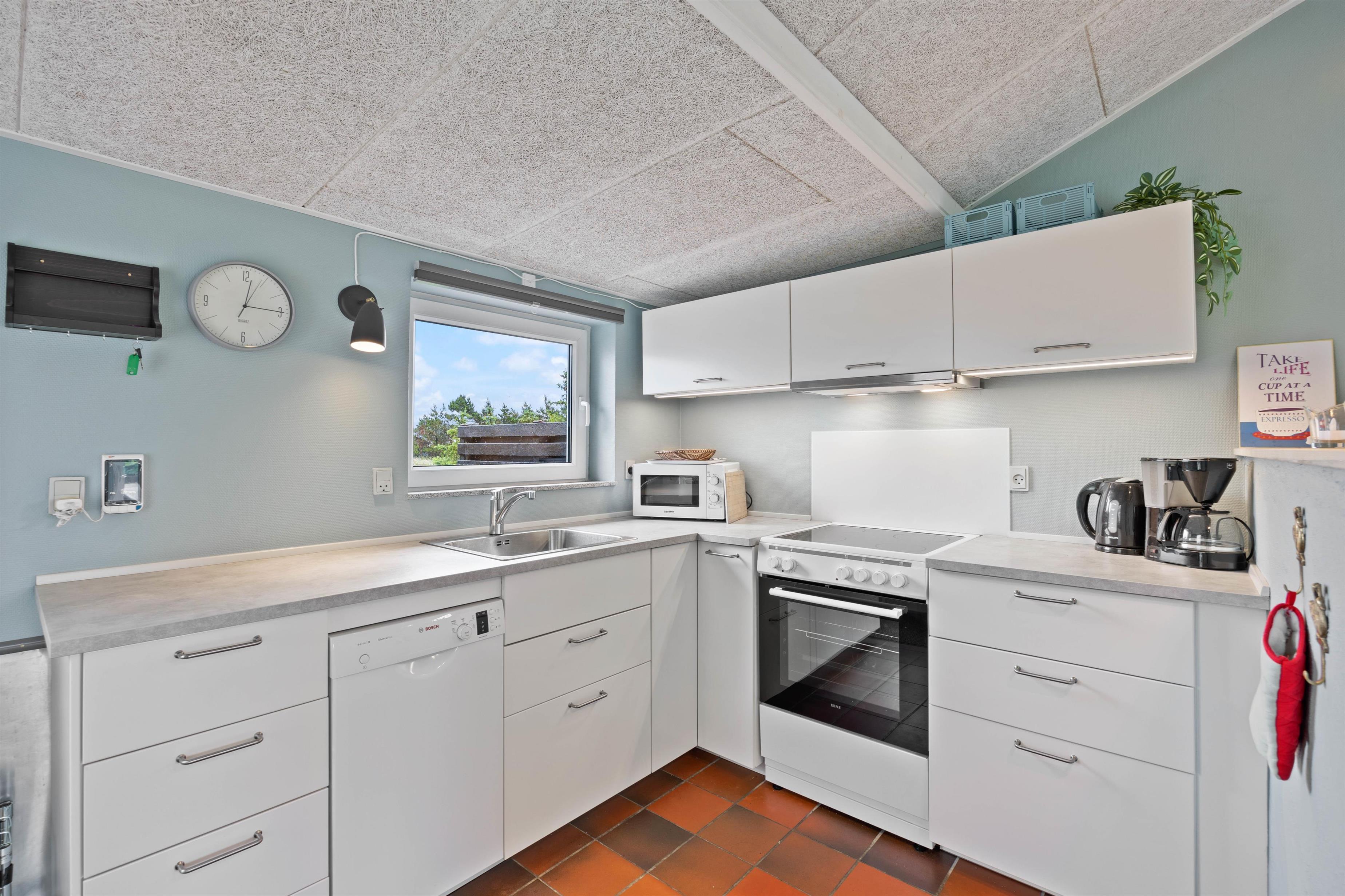 Så snart I træder ind i dette sommerhus på Rauhesvej 12 kan ferien og afslapningen starte. Stuen ligger i åben forbindelse til køkkenet, som inviterer jer til fælles madlavning, mens børnene kan spille brætspil ved spisebordet. Det praktisk udstyrede køkken har også en opvaskemaskine og lystfiskerne bliver glade for den 80 liter fryser. Her har I plads til fiskene, I selv har fanget.