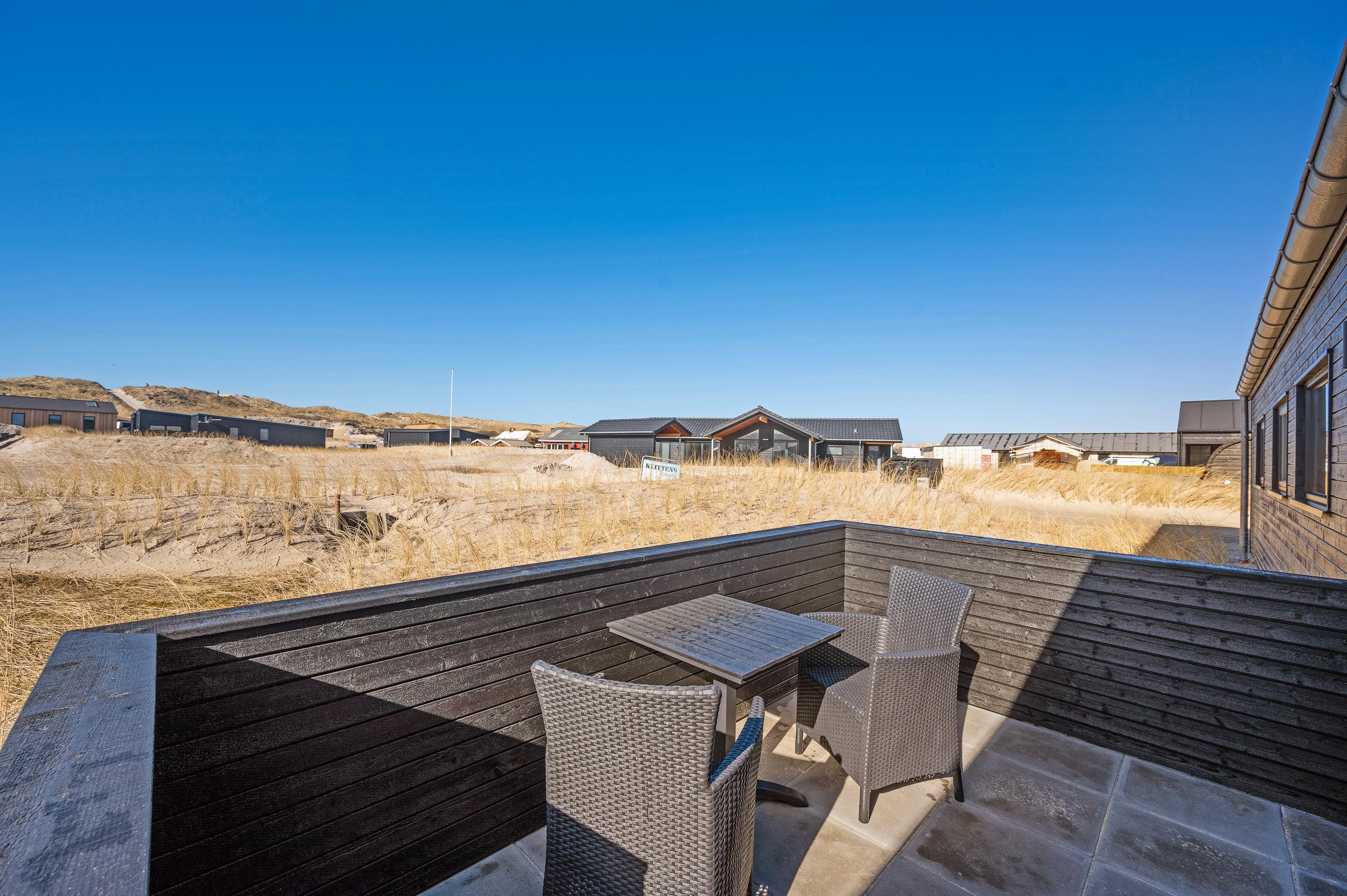 Næsten hele vejen rundt om sommerhuset løber en stor, lækker terrasse med alsidige muligheder for at nyde den friske luft og den flotte natur. Hele terrassen er lukket, og fra stuen træder I ud på en stor, overdækket og afskærmet del, hvor I altid kan finde ly og læ – især praktisk til de hyggelige grillaftener. Her finder I også en udebruser, så I kan skylle jer efter en tur på stranden (kan benyttes fra april til november).