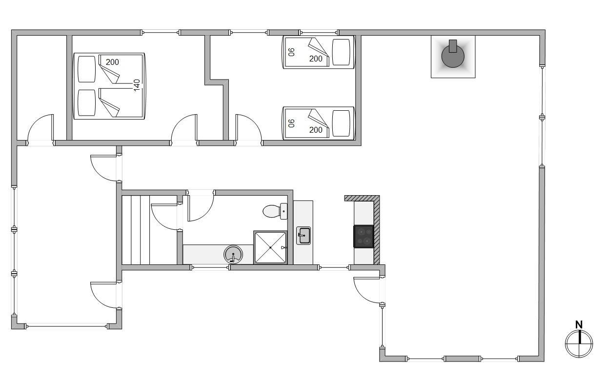 Feriehusets samlingspunkt er stuen, som ligger i åben forbindelse til køkken og spiseplads. I stuen er der en brændeovn, som både spreder varme og en ekstra hyggelig feriestemning på en regnvejrsdag. Sommerhuset har også en udestue, hvorfra I har en skøn udsigt til det naturskønne område.