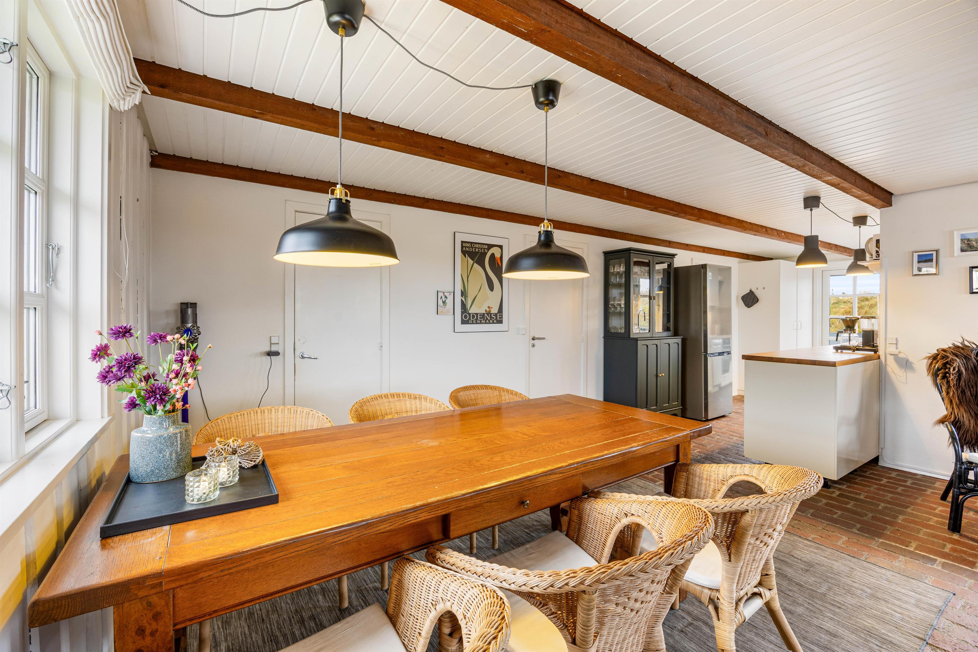 Kun 350 meter skiller jer fra den brede sandstrand, som byder på imponerende naturoplevelser hele året rundt – heriblandt de smukkeste solnedgange. Den lokale købmand i Bjerregård ligger 10 minutters gang fra ferieadressen, og her kan I hver morgen hente nybagte rundstykker til morgenbordet, eller lidt lækkert til en hyggelig aften på sofaen.