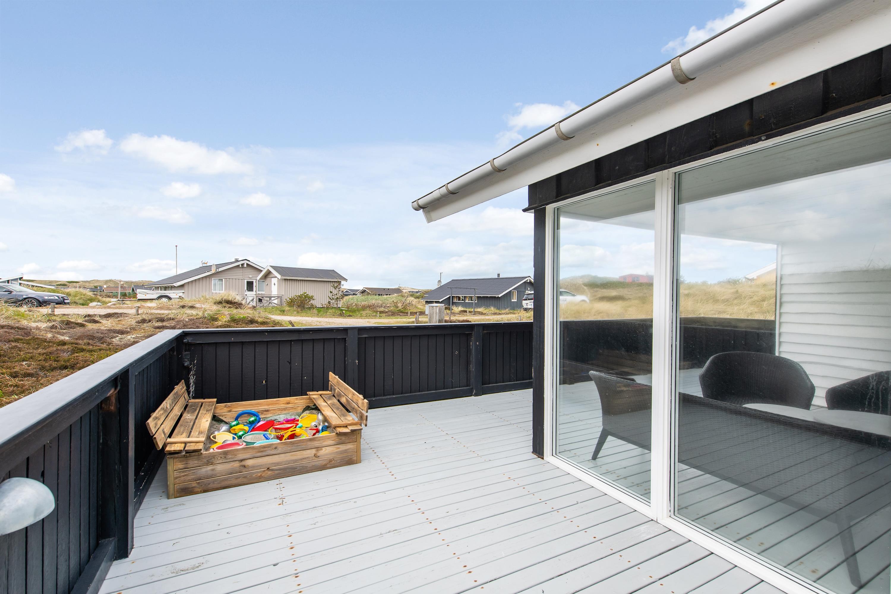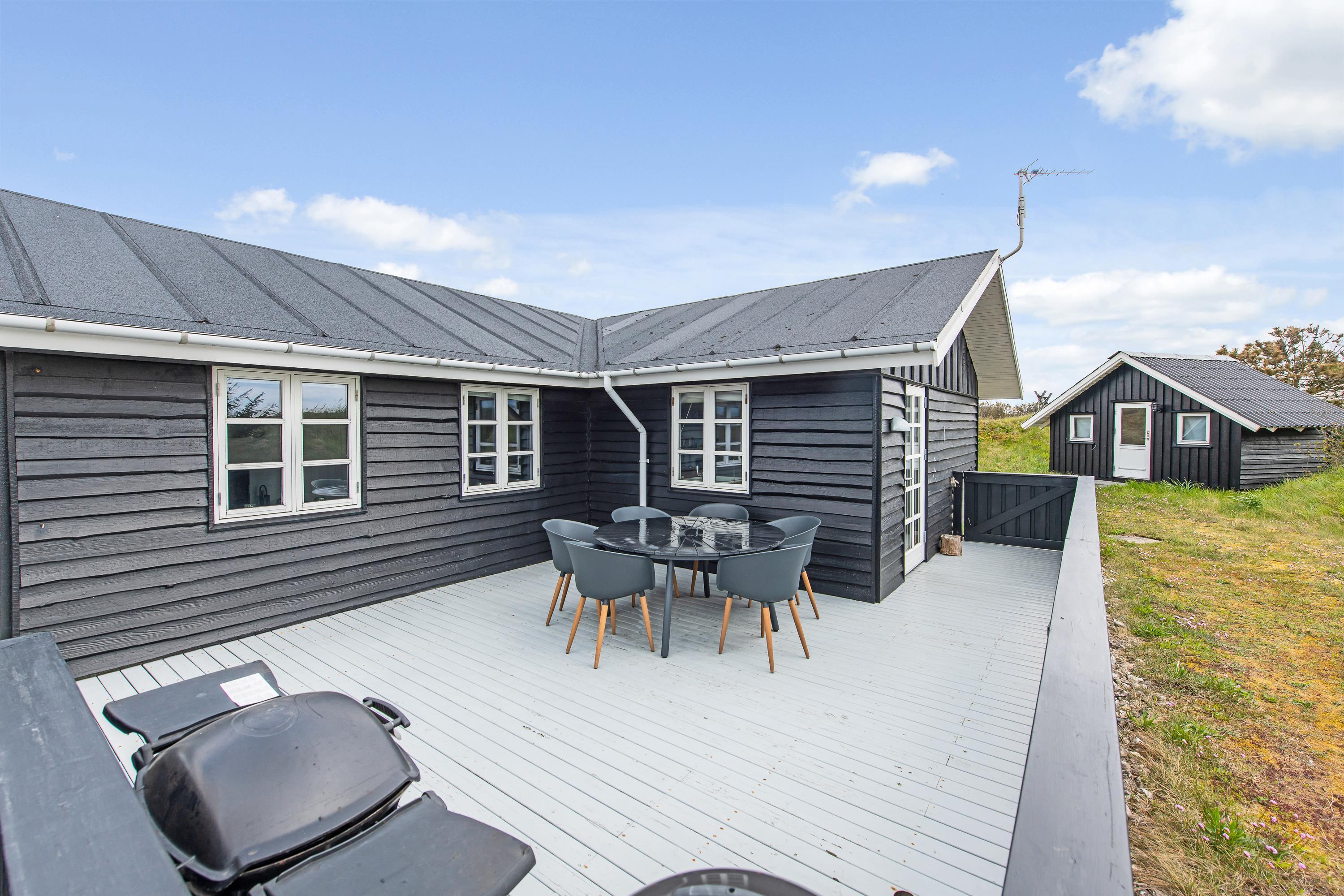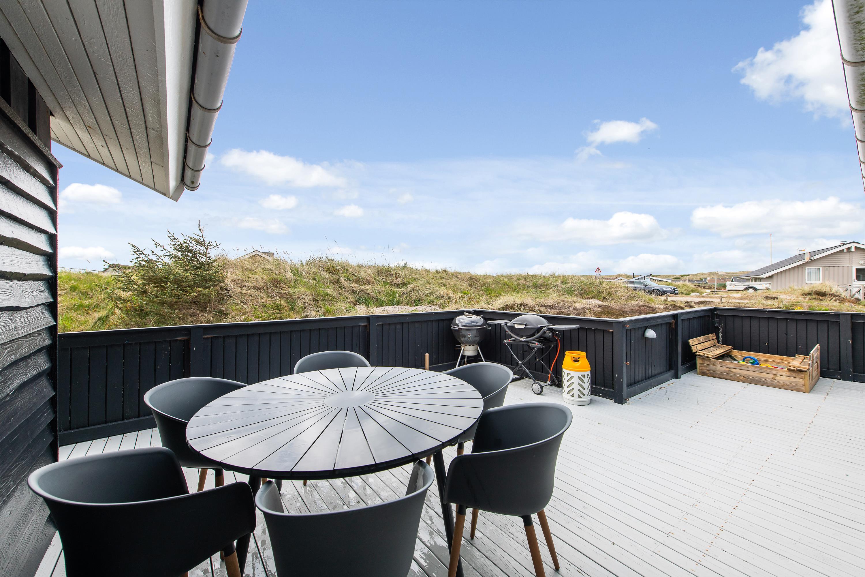 Halvvejs rundt om sommerhuset løber en lukket, delvist overdækket træterrasse. Her er der masser af hyggelige kroge, hvor I kan sidde og nyde solen i ro og fred. Lav en god grillmiddag på en lun sommeraften, da der både er gasgrill og kulgrill ved huset, og nyd middagen i den lune aftensol, mens morgendagens planer bliver lagt.