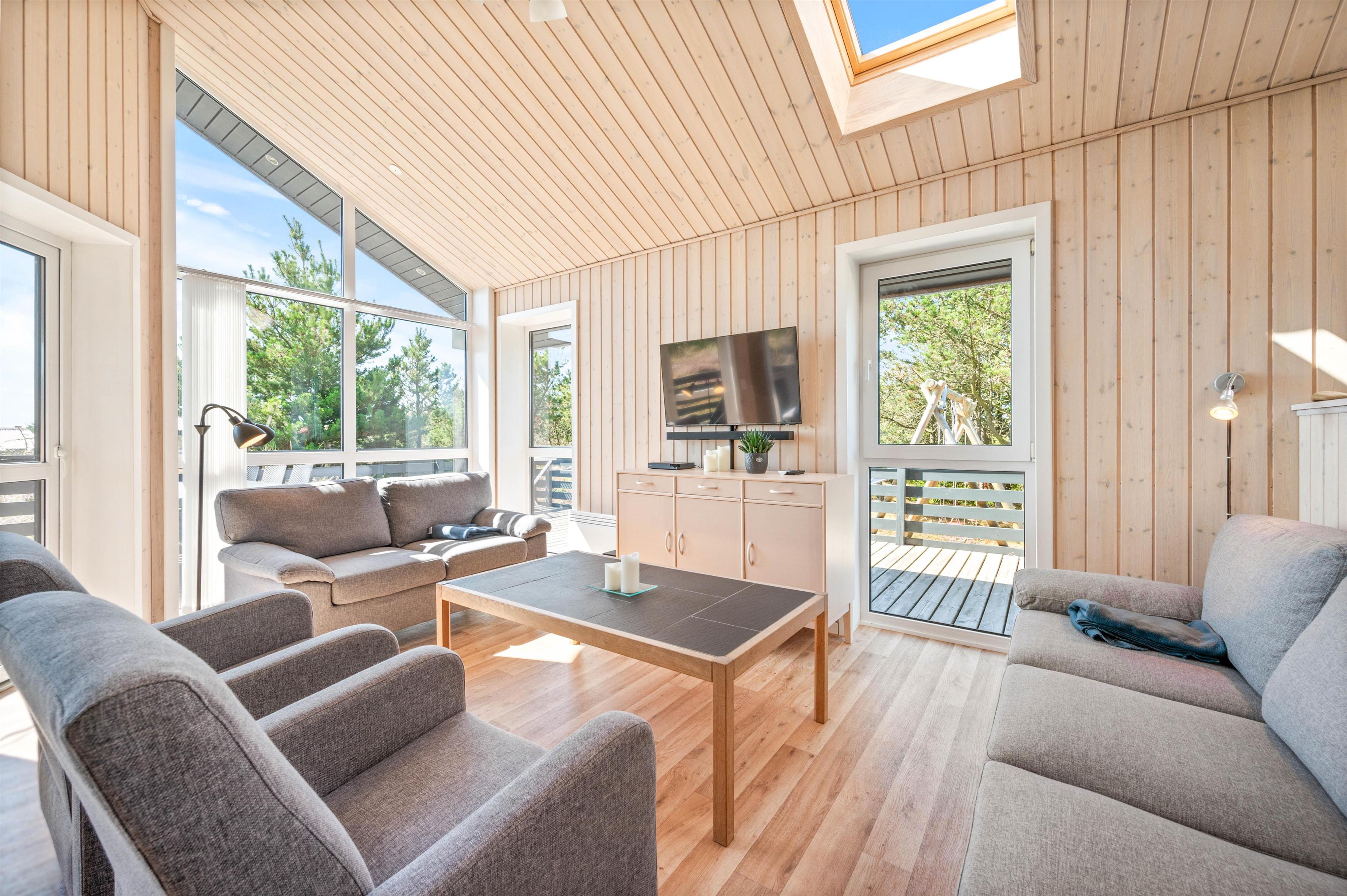 Den hyggelige opholdsstue indbyder til mange gode stunder med hele familien. Her kan I samles i sofaerne, mens brændeovnen spreder varme og sætter prikken over i'et til den helt rigtige feriestemning. Sommerhuset har desuden en energibesparende varmepumpe, som I med fordel kan benytte jer af til at holde en behagelig temperatur i rummet.