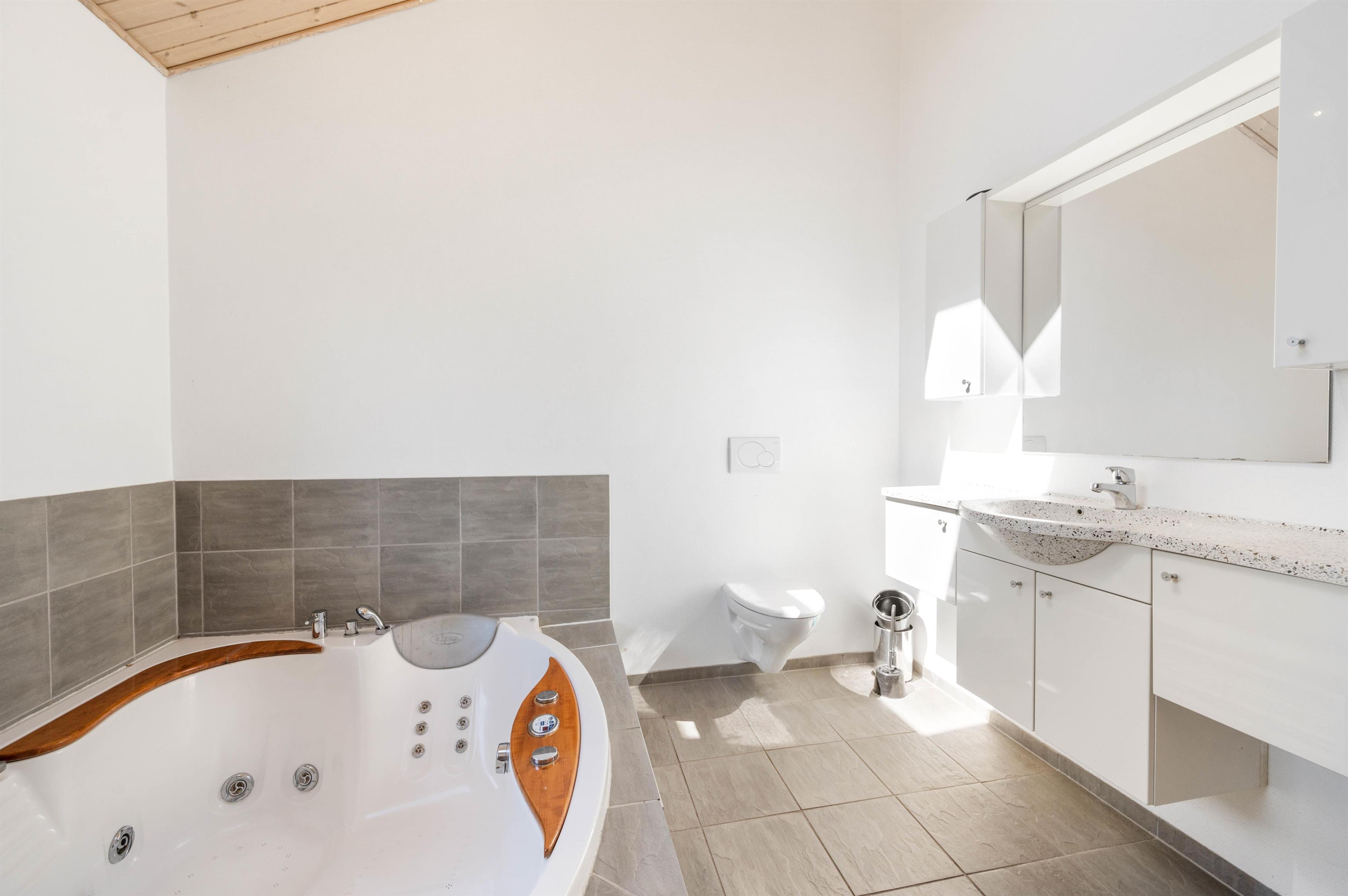 Sommerhuset har 2 badeværelser, hvoraf det ene er udstyret med toilet, bruser, boblebad og sauna. Det andet med bruser og toilet. Begge badeværelser har desuden gulvvarme, så I ikke fryser fødderne.