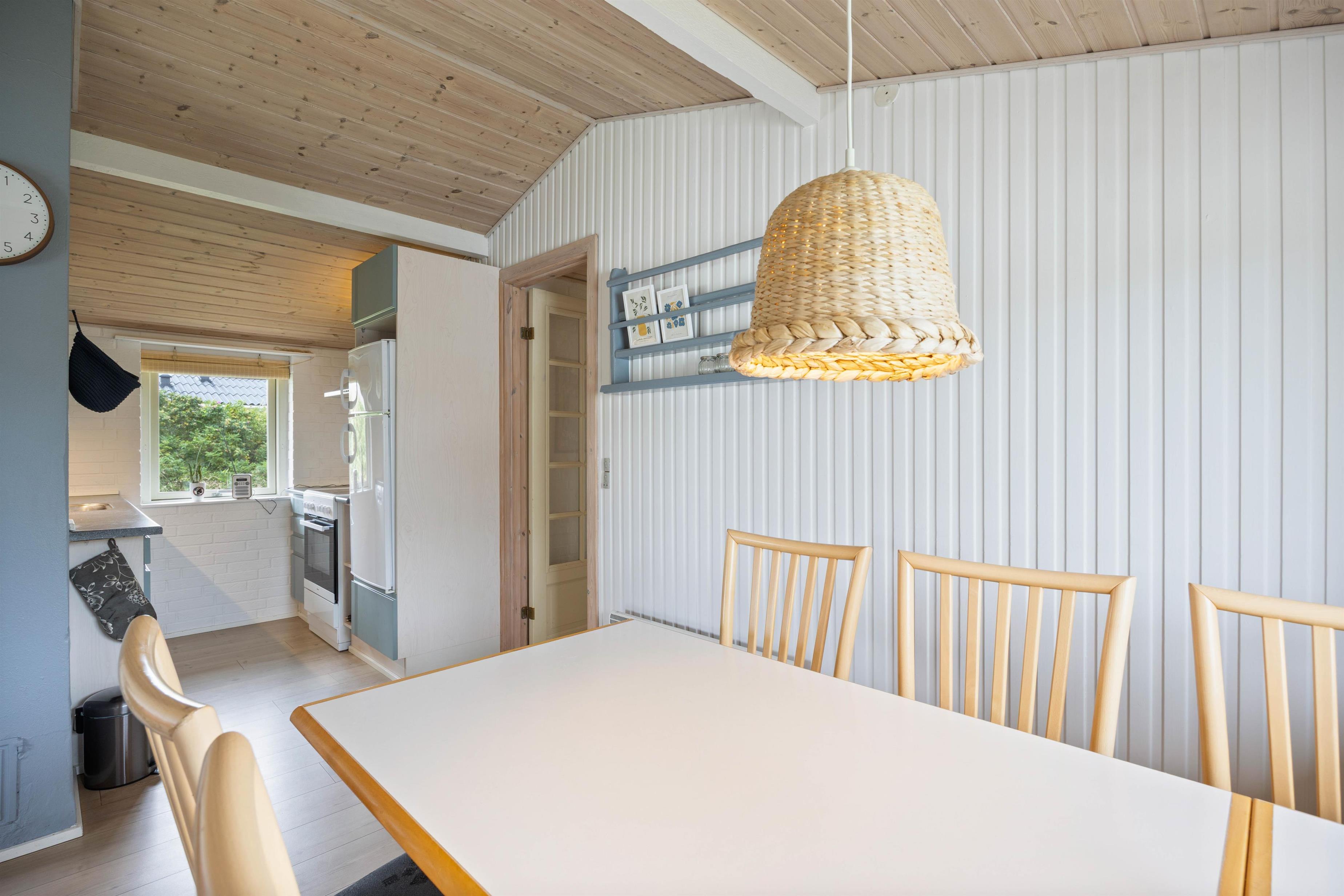 I sommerhuset på Midtvej 20 kan I hygge jer. Området med åbent køkken i forbindelse med spise- og opholdsstue bliver hurtigt samlingspunktet. Tænd op i brændeovnen om aftenen eller på kølige dage, og nyd samværet i stuen, hvor man kan trække sig tilbage med en god bog, eller bare nyde udsigten til den sydvendte terrasse og naturgrunden. Det pæne lille køkken indeholder alt, hvad I behøver for at tilberede lækre hjemmelavede måltider, som I nyder ved spisebordet.