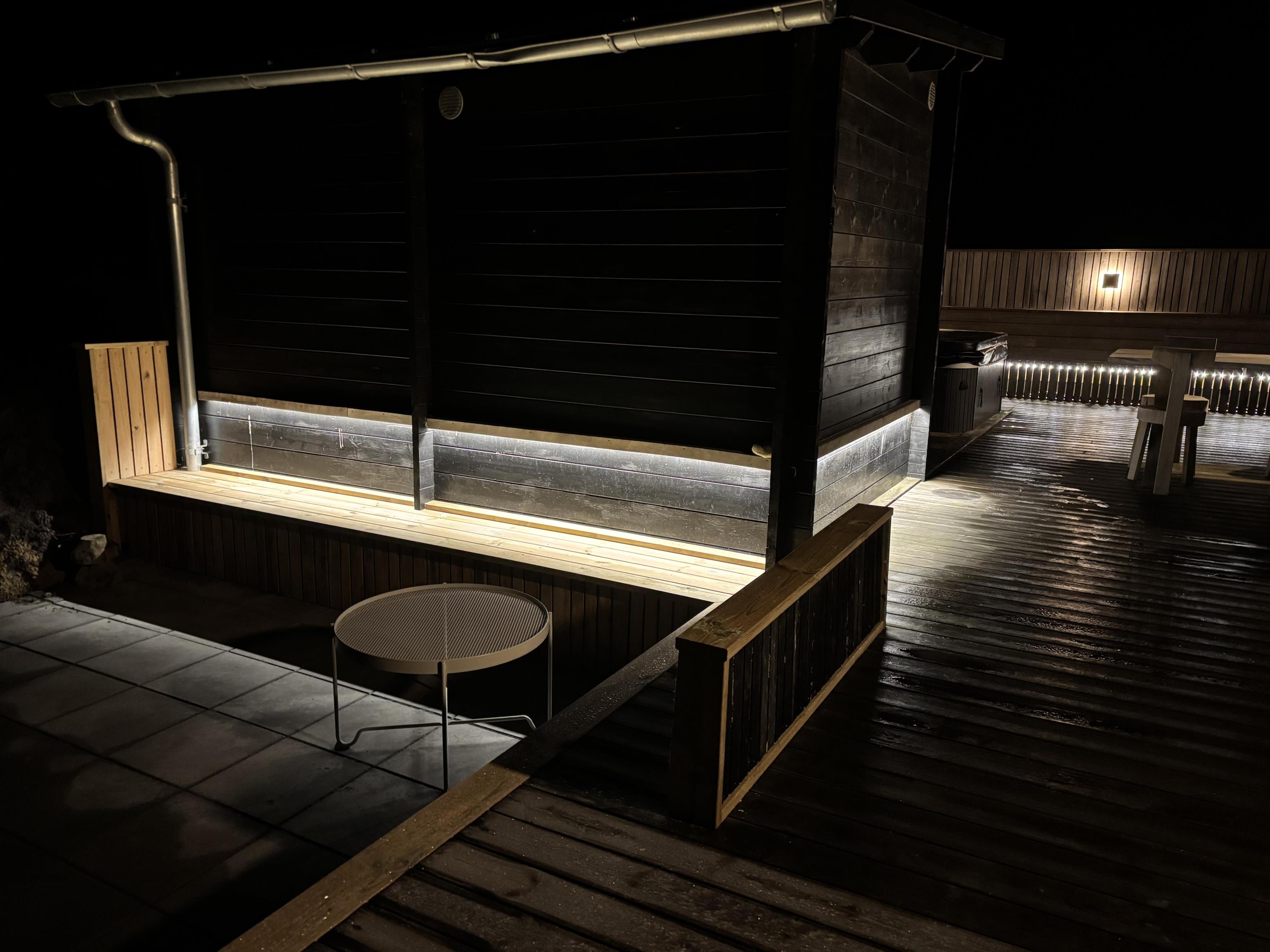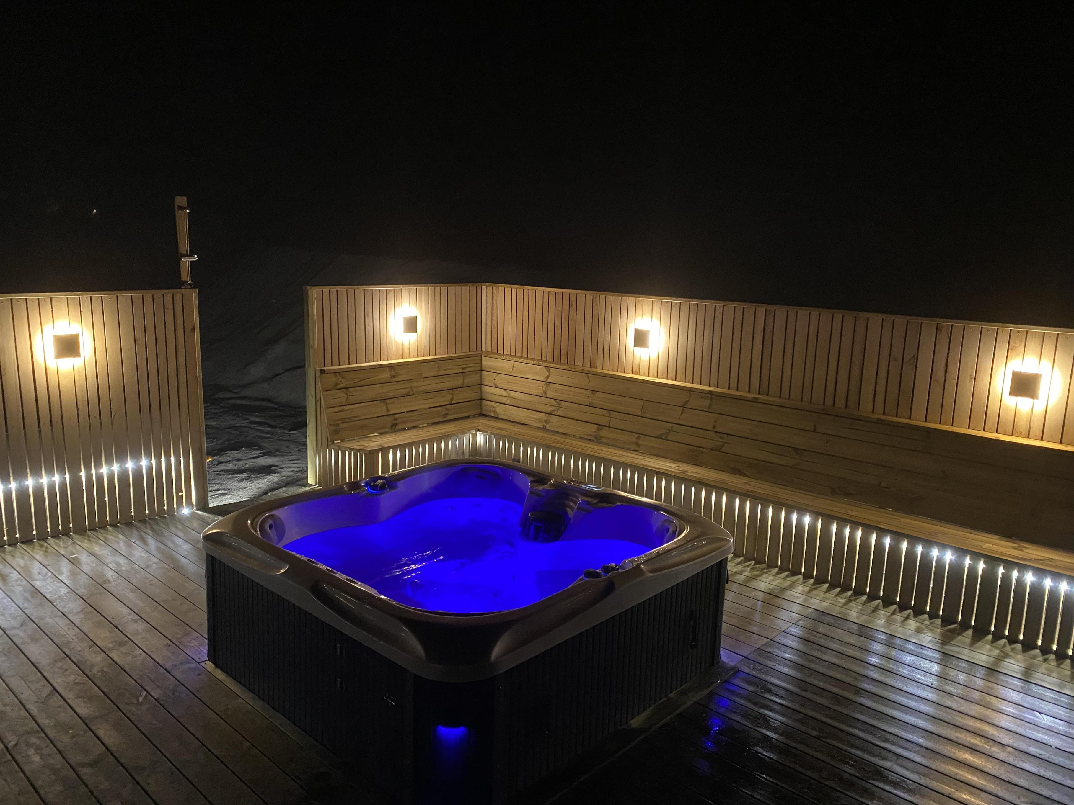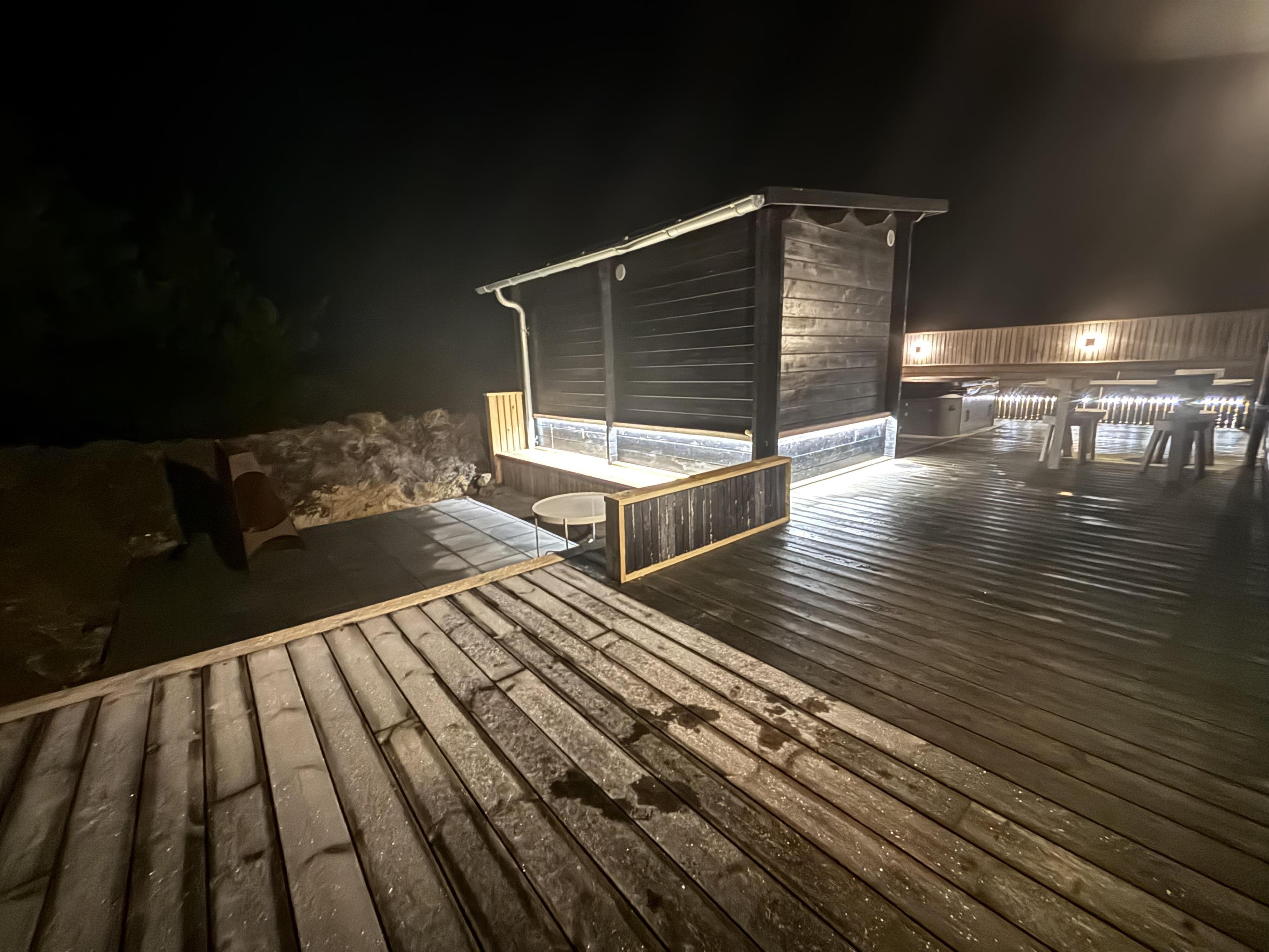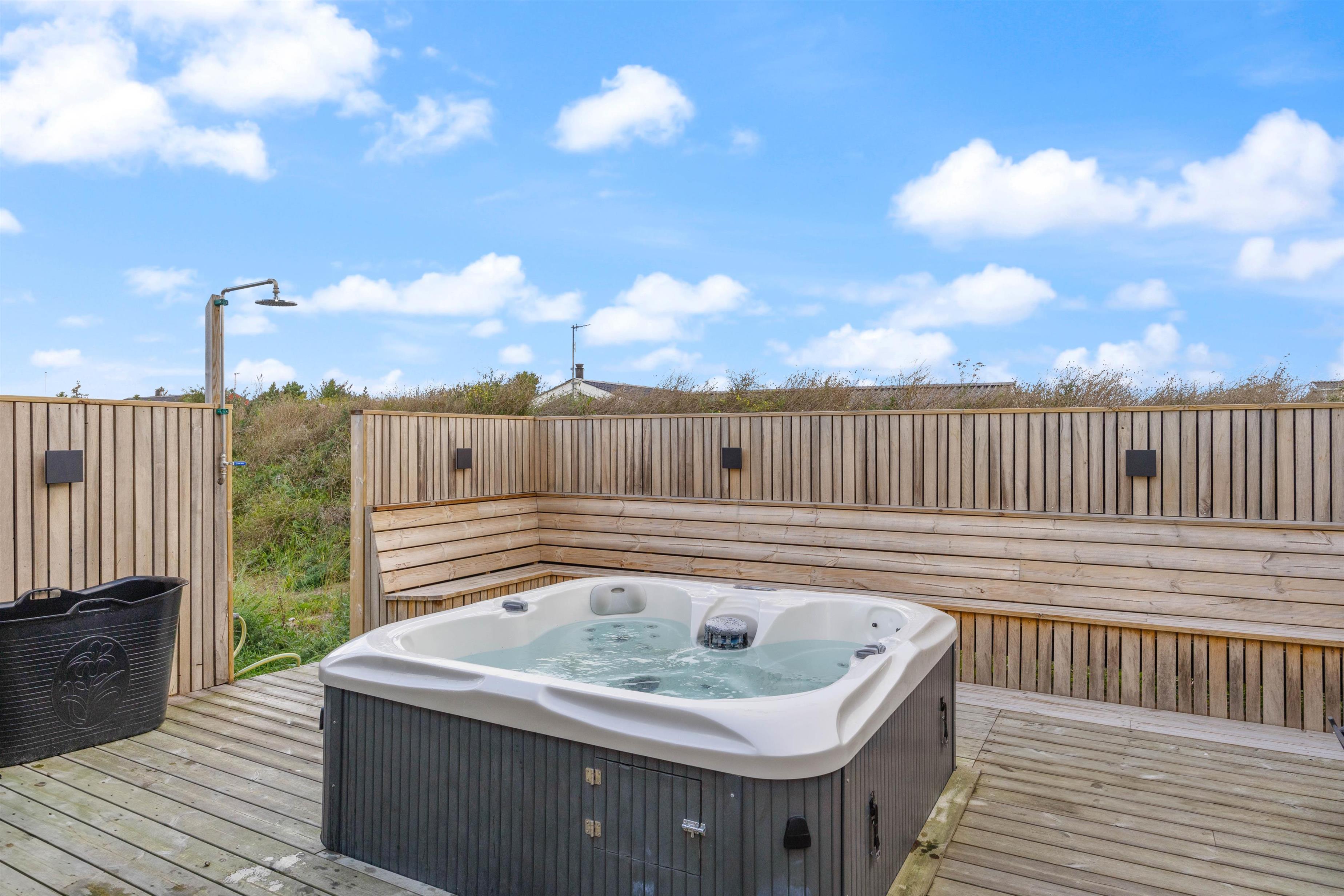 Rammerne er altså sat for en ferie med masser af wellness og velvære. Ikke mindst på den store terrasse, hvor et 5 pers-udendørs spabad og en sauna står klar til at give jer de skønneste, afslappende ferieoplevelser. Efter en tur i udespaen eller saunaen kan I skylle jer under den udendørs bruser (fra april til november).