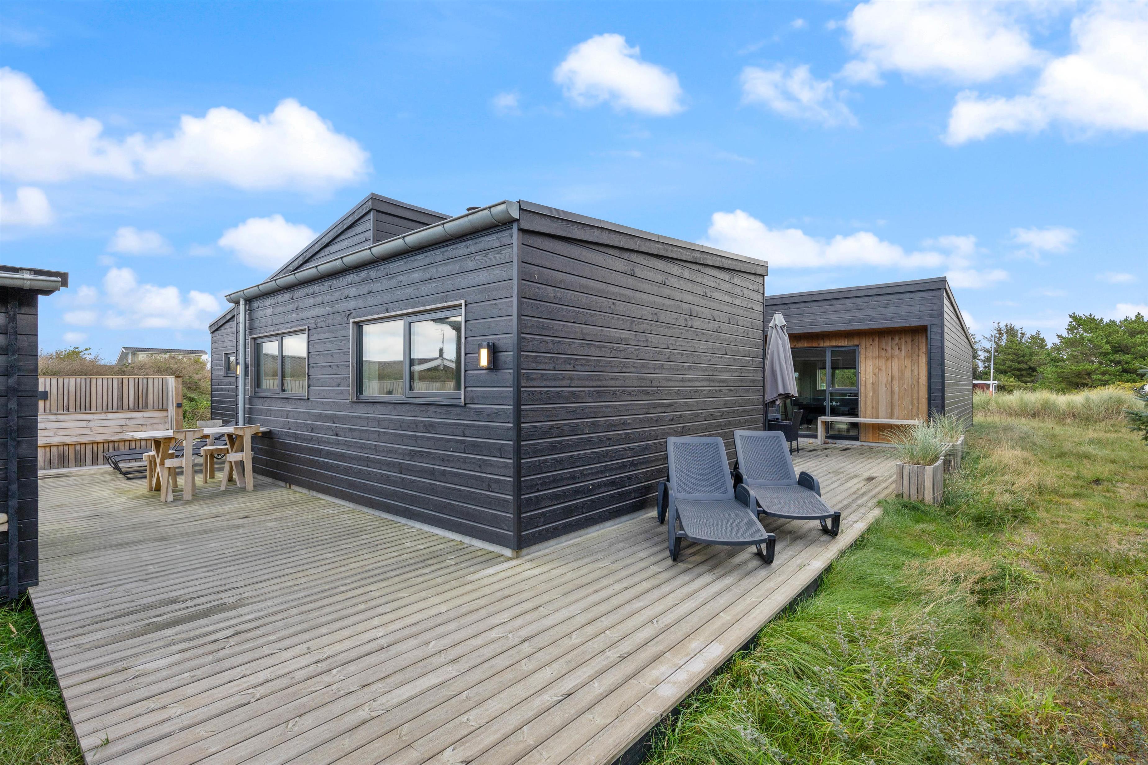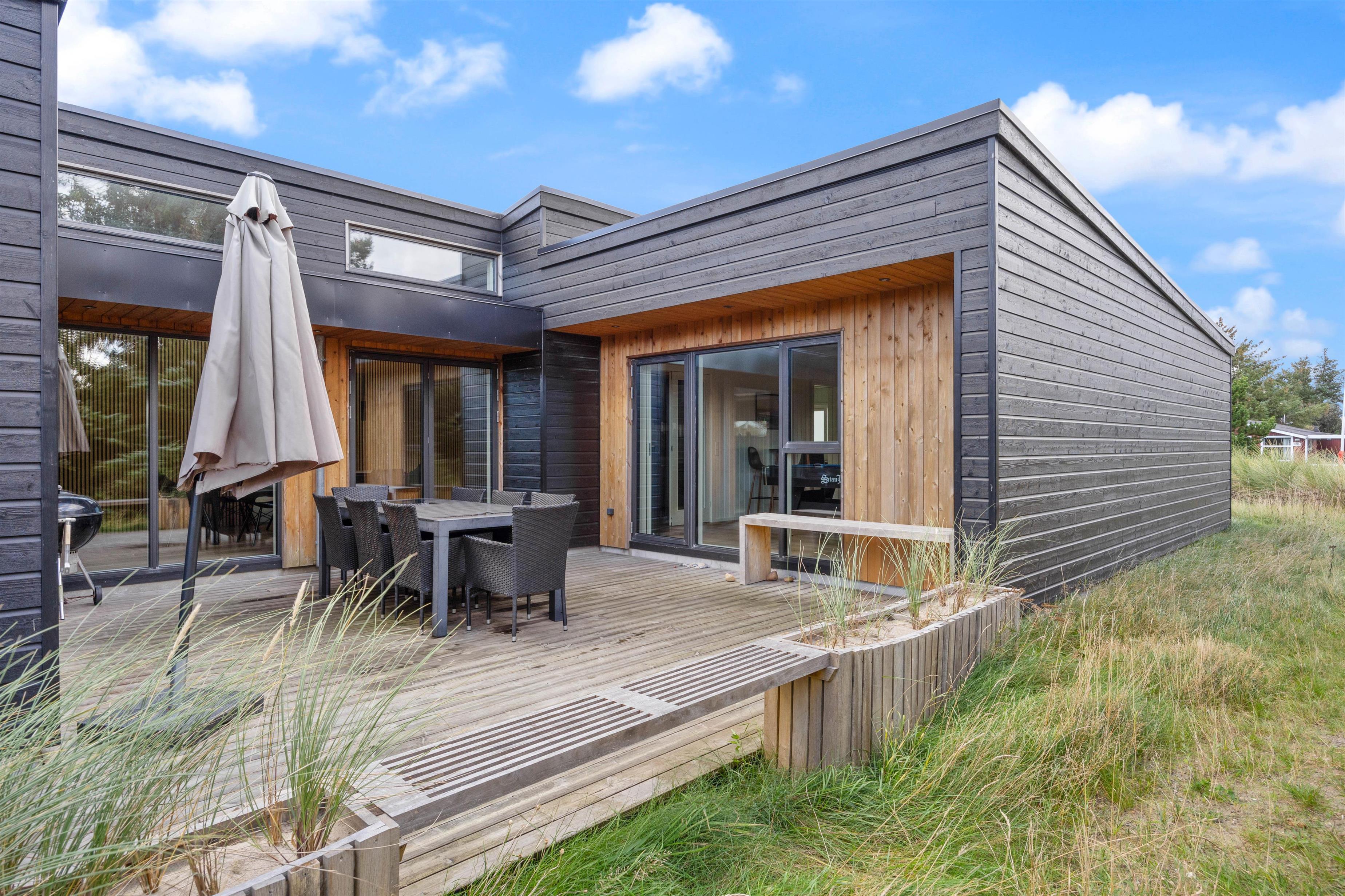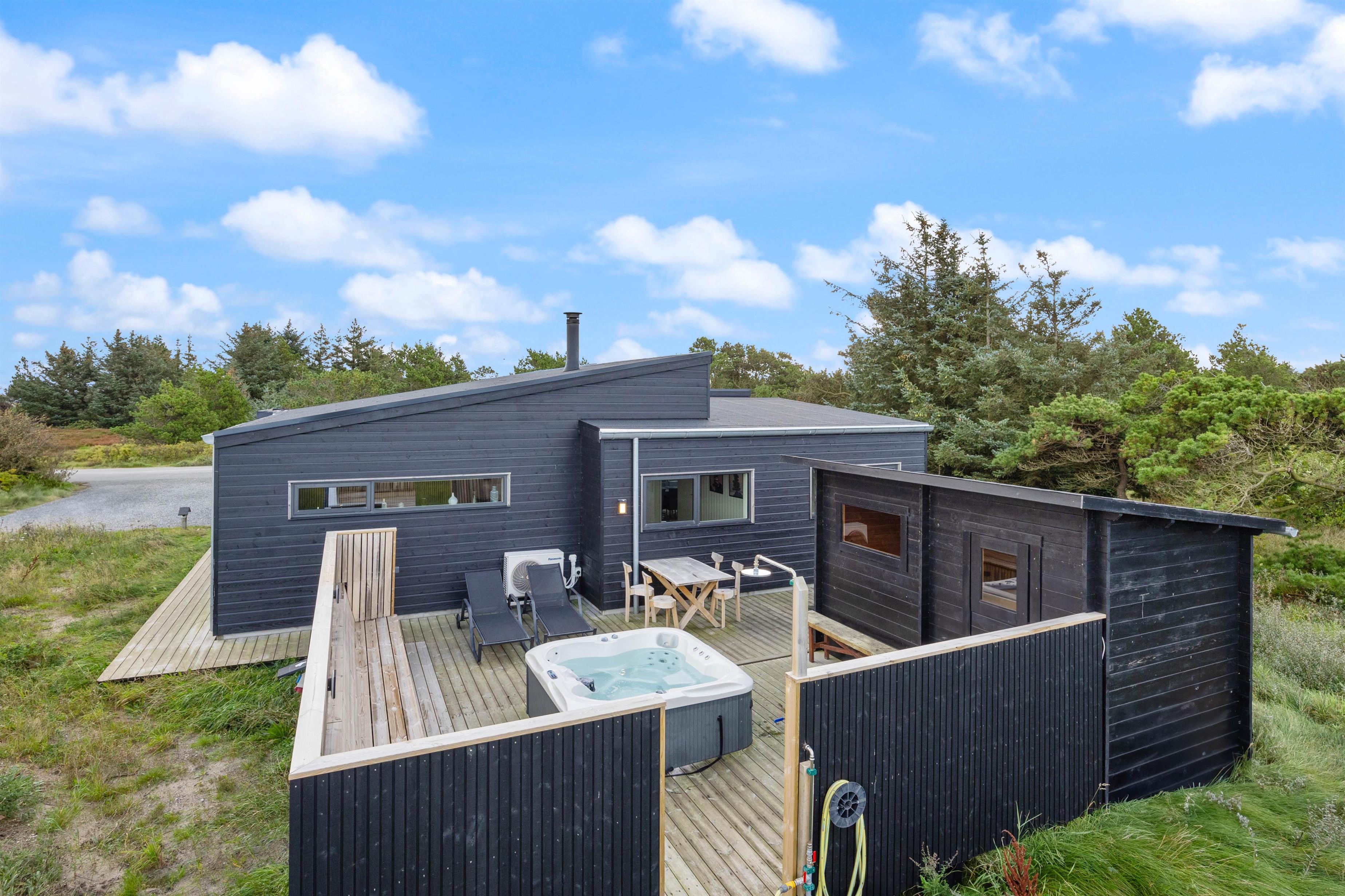 Dette femstjernede feriehus i Bjerregård inviterer til en luksuriøs ferie ved Vesterhavet med noget for enhver smag. Den moderne og stilfulde indretning til 8 personer indbefatter blandt andet et stort aktivitetsrum med billard, bordfodbold og airhockey. Prikken over i’et er det fantastiske udendørsområde med udendørs spabad og sauna på terrassen.