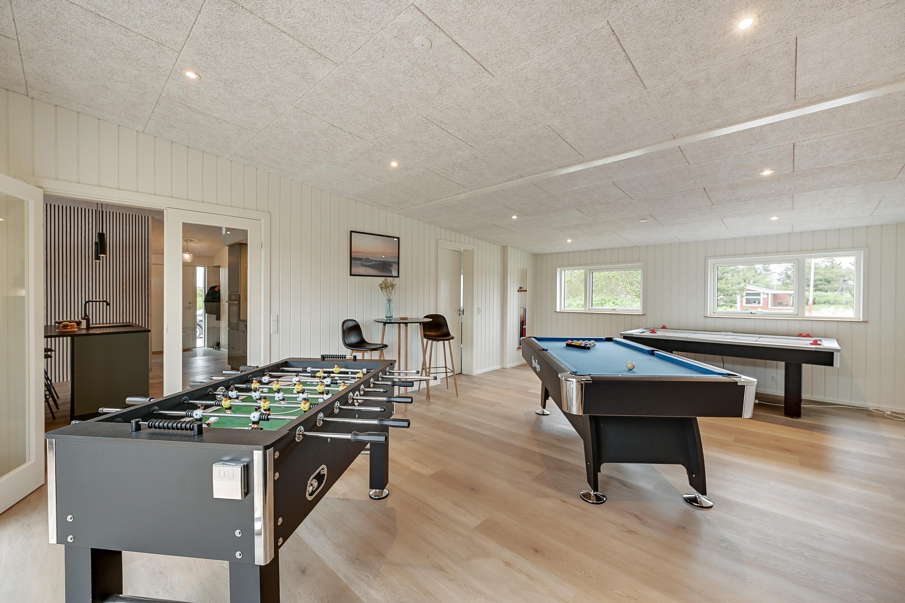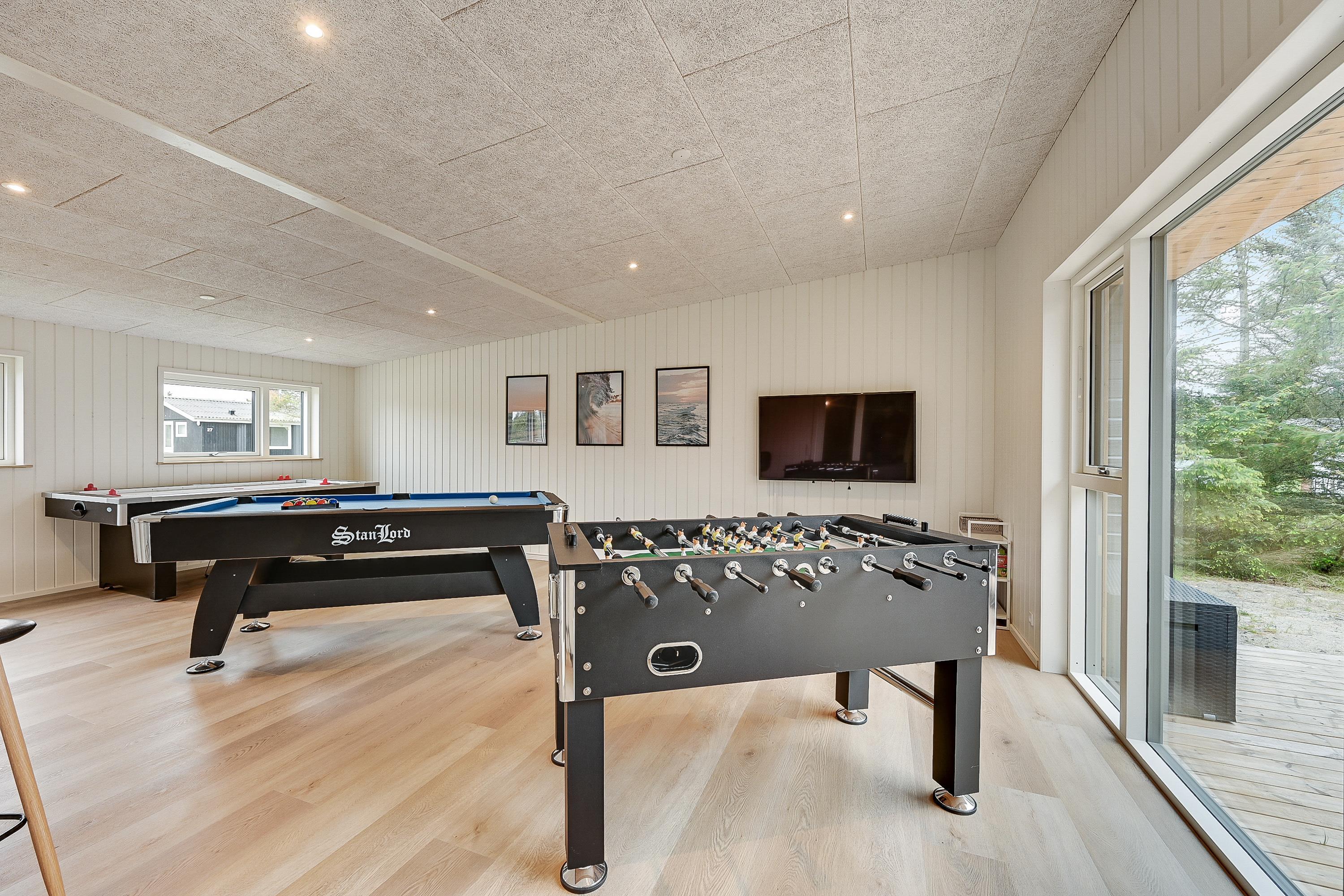 Det flotte aktivitetshus på Midtvej 24 er et oplagt valg til en ferie lidt ud over det sædvanlige, sammen med den store familie eller vennerne. Her er der masser af underholdning, og et af feriehusets highlights er det store aktivitetsrum, hvor I både kan give jer i kast med billard, bordfodbold og airhockey – her er der lagt op til mange timers sjov.
